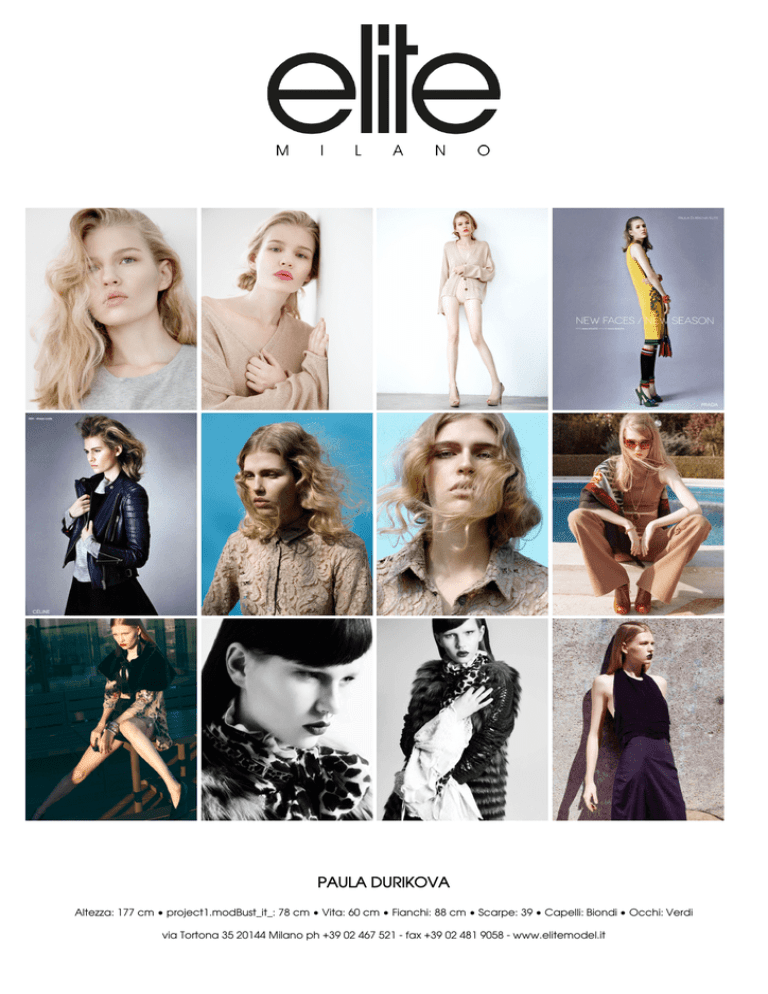 PAULA DURIKOVA Altezza: 177 cm • project1.modBust_it_: 78 cm • Vita: 60 cm • Fianchi: 88 cm • Scarpe: 39 • Capelli: Biondi • Occhi: Verdi via Tortona 35 20144 Milano ph +39 02 467 521 - fax +39 02 481 9058 - www.elitemodel.it PAULA DURIKOVA Altezza: 177 cm • project1.modBust_it_: 78 cm • Vita: 60 cm • Fianchi: 88 cm • Scarpe: 39 • Capelli: Biondi • Occhi: Verdi via Tortona 35 20144 Milano ph +39 02 467 521 - fax +39 02 481 9058 - www.elitemodel.it
