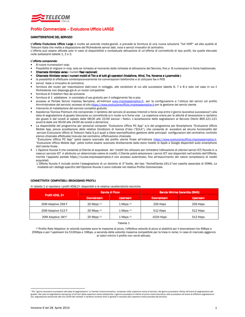 Profilo Commerciale – Evoluzione Ufficio LARGE CARATTERISTICHE DEL SERVIZIO L’offerta Evoluzione Ufficio Large è rivolta ad aziende medio-grandi, e prevede la fornitura di una nuova soluzione ”full VOIP” ad alta qualità di Telecom Italia che mette a disposizione del Richiedente servizi dati, voce e servizi innovativi di centralino. L’offerta può essere attivata solo in caso di disponibilità o contestuale attivazione di un’offerta di connettività di tipo profili, tra quelle elencate nelle sottostanti tabelle 1, 2 e 3. L’offerta comprende: • 8 nuove numerazioni voip; • Possibilità di migrare in voip, solo se richiesto al momento della richiesta di attivazione del Servizio, fino a 8 numerazioni in fonia tradizionale; • Chiamate illimitate verso i numeri fissi nazionali; • Chiamate illimitate verso i numeri mobili mobili di Tim e di tutti gli operatori (Vodafone, Wind, Tre, Noverca e Lycamobile ) • la possibilità di effettuare contemporaneamente tre conversazioni telefoniche e di utilizzare fax e POS • servizi base e innovativi di centralino; • fornitura del router per trasmissione dati/voce in noleggio, alle condizioni di cui alle successive tabella 6, 7 e 8 e solo nel caso in cui il Richiedente non disponga già di un router compatibile • fornitura di 3 telefoni fissi da scrivania • fornitura di 1 adattatore in comodato d’uso gratuito per il collegamento fax e pos; • accesso al Portale Servizi Impresa Semplice, all’indirizzo www.impresasemplice.it;, per la configurazione e l’utilizzo dei servizi col profilo Amministratore del servizio; accesso al sito https://www.evoluzioneufficio.impresasemplice.it per la gestione dei servizi utente. • intervento di installazione del servizio completo gratuito; • Assistenza Tecnica Premium che comprende: il ripristino del servizio di accesso Internet e fonia voip entro il giorno lavorativo successivo(1) alla data di segnalazione di guasto bloccante su connettività e/o router e/o fonia voip . La copertura oraria per le attività di lavorazione e ripristino dei guasti è dal lunedì al sabato dalle 08:00 alle 22:00 esclusi i festivi.. L’accettazione delle segnalazioni al Servizio Clienti 800.121.121 avverrà dalle ore 00:00 alle 24:00 da lunedì a domenica; • La disponibilità del programma per personal computer “Evoluzione Ufficio PC App” e/o del programma per Smartphone “Evoluzione Ufficio Mobile App, previa accettazione delle relative Condizioni di licenza d’Uso (“EULA”), che consente di accedere ad alcune funzionalità del servizio Evoluzione Ufficio di Telecom Italia S.p.A quali a titolo esemplificativo gestione delle principali configurazioni del centralino; controllo elenco chiamate effettuate/ricevute dal centralino, effettuazione chiamate. “Evoluzione Ufficio PC App” potrà essere scaricato dal profilo utente finale all’indirizzo https://www.evoluzioneufficio.impresasemplice.it. “Evoluzione Ufficio Mobile App” potrà inoltre essere scaricato direttamente dallo store mobile di Apple e Google disponibili sullo smartphone dell’utente finale. • L’Opzione Nuvola It che consente al Cliente di acquistare dei “crediti”da utilizzare per richiedere l'attivazione di ulteriori servizi ICT/Nuvola it; a ciascun servizio ICT è attribuito un determinato valore di crediti; il Cliente potrà selezionare i servizi ICT resi disponibili nell’ambito dell’Offerta, tramite l’apposito portale https://nuvola.impresasemplice.it con accesso autenticato, fino all’esaurimento del valore complessivo di crediti acquistati. L’Offerta Nuvola it include anche l’assegnazione di un dominio di 3°livello, del tipo “NomeCliente.191.it”con casella associata di 50Mb. Le modalità ed i dettagli specifici dell’Opzione Nuvola it sono indicate nel relativo Profilo Commerciale. CONNETTIVITA’ COMPATIBILI: COMPATIBILI: BROADBAND PROFILI In tabella 1 si riportano i profili ADSL2+ disponibili e le relative caratteristiche tecniche: Banda di Picco Profili ADSL 2+ Downstream Banda Minima Garantita (BMG) Upstream Downstream Upstream 20M Adaptive 256 F 20 Mbps (1) 1 Mbps (1) 256 Kbps 256 Kbps 20M Adaptive 512 F 20 Mbps (1) 1 Mbps (1) 512 Kbps 512 Kbps 20M Adaptive 1M F 20 Mbps (1) 1 Mbps (1) 1024 Kbps 512 Kbps Tabella 1 (1) Profilo Rate Adaptive: le velocità riportate sono le massime di picco, l’effettiva velocità di picco si stabilirà per il downstream tra 4Mbps e 20Mbps e per l’upstream tra 512Kbps e 1Mbps, a seconda della velocità massima compatibile per la linea in rame; in caso di mancato aggancio ai valori minimi il profilo non verrà attivato. 1 Per “giorno lavorativo successivo alla data di segnalazione” si intende l’orario lavorativo, compreso nella copertura oraria di servizio, del giorno successivo riferito all’orario di segnalazione del guasto. Nel caso di segnalazioni pervenute al di fuori della copertura oraria sottoscritta, il giorno successivo è riferito al primo orario lavorativo utile successivo all’orario di effettiva segnalazione (es. segnalazione pervenuta alle ore 23:00 del martedì; il ripristino avviene entro il giovedì in accordo alla copertura oraria prevista dal servizio). Versione 9 del 28 Aprile 2014 1 Profilo Commerciale – Evoluzione Ufficio LARGE In tabella 2 si riportano i profili ADSL disponibili con le relative caratteristiche tecniche: Banda di Picco Profili ADSL Downstream Banda Minima Garantita (BMG) Upstream Downstream Upstream 7M Adaptive 256F 7 Mbps (2) 704 Kbps (2) 256 Kbps 256 Kbps 7M Adaptive 512F 7 Mbps (2) 704 Kbps (2) 512 Kbps 256 Kbps 7M Adaptive 1M F 7 Mbps 704 Kbps (2) 1024 Kbps 512 Kbps (2) Tabella 2 Profilo Rate Adaptive: le velocità riportate sono le massime di picco, l’effettiva velocità di picco si stabilirà per il downstream tra 4Mbps e 7Mbps e per l’upstream tra 512Kbps e 704Kbps a seconda della velocità massima compatibile per la linea in rame; in caso di mancato aggancio ai valori minimi il profilo non verr