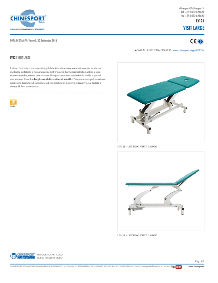 [email protected] Tel. +39 0432 621621 Fax +39 0432 621620 LV121 VISIT LARGE DATA DI STAMPA: Venerdì, 30 Settembre 2016 VAI ALLA SCHEDA ON-LINE www.chinesport.it/go/LV121/ LV121 VISIT LARGE Lettino da visita e trattamenti regolabile idraulicamente o elettricamente in altezza mediante pedaliera a bassa tensione (24 V) o con barra perimetrale. Lettino a una sezione mobile, testata con sistema di regolazione servoassistito da molla a gas ed una sezione fissa. La larghezza delle sezioni di cm 80. L’ampia testata può assolvere anche alla funzione di schienale ed è regolabile in positivo e negativo. La testata è dotata di foro naso-bocca. 200 KG LV121 - LETTINO VISIT LARGE LV121 - LETTINO VISIT LARGE PER QUESTO ARTICOLO SONO PRESENTI VIDEO CHINESPORT REHABILITATION and MEDICAL EQUIPMENT, via Croazia 2 - 33100 Udine, Tel. +39 0432 621621, Fax +39 0432 621620 - E-mail [email protected] - SEGUICI SU Pag. 1/7 www.chinesport.it [email protected] Tel. +39 0432 621621 Fax +39 0432 621620 LV121 VISIT LARGE Specifiche tecniche e dimensioni Numero di sezioni : 2 Carico di lavoro max in sicurezza (kg) : 200 Regolazione in altezza : elettrica/idraulica Altezza lettino minima/massima (cm) : 47-97 Alimentazione a rete : 220V 50-60Hz / 24V 70VA Spinta attuatore (N) : 6000 Protezione IP : 54 Regolazione della testata : con molla a gas Inclinazione testata : +70° -20° Diametro ruote (mm) : 65 Sistema di freno : centralizzato Classe di sicurezza rivestimento : 1 IM Spessore imbottitura (mm) : 40 Densità (kg/m³) : 30 Peso (kg) : 72 Documentazione disponibile online DOCUMENTI IN ALL LANGUAGES Approfondimenti - Caratteristiche tecniche tappezzeria Technical features for upholstery Manuale Istruzioni - LV121 - Manuale istruzioni Dichiarazione conformità - LV121 - VISIT LARGE Dichiarazione conformità .pdf 513.42 KB .pdf 1.21 MB .pdf 180.71 KB DOCUMENTI IN GERMAN Manuale Istruzioni - LV121 - Manuale istruzioni .pdf 757.63 KB DOCUMENTI IN SPANISH Manuale Istruzioni - LV121 - Manuale istruzioni .pdf 485.92 KB Il documento è disponibile per il download in area riservata PER QUESTO ARTICOLO SONO PRESENTI VIDEO CHINESPORT REHABILITATION and MEDICAL EQUIPMENT, via Croazia 2 - 33100 Udine, Tel. +39 0432 621621, Fax +39 0432 621620 - E-mail [email protected] - SEGUICI SU Pag. 2/7 www.chinesport.it [email protected] Tel. +39 0432 621621 Fax +39 0432 621620 LV121 VISIT LARGE Questo prodotto è configurato. Scegli le opzioni desiderate. REGOLAZIONE IN ALTEZZA A ELETTRICA, CON PEDALIERA B ELETTRICA, CON BARRA PERIMETRALE C IDRAULICA, CON DOPPIO PEDALE D ELETTRICA, CON PULSANTIERA 2 RUOTE PER IL TRASFERIMENTO 3 SPONDINE LATERALI DI SICUREZZA 4 RUOTE DI TRASFERIMENTO E SPONDINE DI SICUREZZA G ELETTRICA, CON COMANDO BIVALENTE ALTRE OPZIONI 1 NESSUNA OPZIONE TIPOLOGIA DI RIVESTIMENTO W SIMILPELLE GIOTTO, BORDI ARROTONDATI PER QUESTO ARTICOLO SONO PRESENTI VIDEO CHINESPORT REHABILITATION and MEDICAL EQUIPMENT, via Croazia 2 - 33100 Udine, Tel. +39 0432 621621, Fax +39 0432 621620 - E-mail [email protected] - SEGUICI SU Pag. 3/7 www.chinesport.it [email protected] Tel. +39 0432 621621 Fax +39 0432 621620 LV121 VISIT LARGE Personalizza il COLORE 1 VERDE SCURO 2 BLU CHIARO 3 BLU MARINO 4 GIALLO 6 VERDE CHIARO 7 GRIGIO CENERE 8 BEIGE 9 FUCSIA A BIANCO B CREMA E ACQUAMARINA F ROSSO G CORALLO H BORDEAUX K GRIGIO L BLU SCURO M ANTRACITE N AVORIO P NERO Q LILLÀ R AZZURRO FIORDALISO S MARRONE SCURO T VERDE LIMONE Z ARANCIONE PER QUESTO ARTICOLO SONO PRESENTI VIDEO CHINESPORT REHABILITATION and MEDICAL EQUIPMENT, via Croazia 2 - 33100 Udine, Tel. +39 0432 621621, Fax +39 0432 621620 - E-mail [email protected] - SEGUICI SU Pag. 4/7 www.chinesport.it [email protected] Tel. +39 0432 621621 Fax +39 0432 621620 LV121 VISIT LARGE Accessori AC0017 BATTERIA AUSILIARIA AC0020 TAPPO FORO NASO/BOCCA AC0027 ASTA PORTAFLEBO AC0031 SUPPORTO LENZUOLINO F AC0032 SUPPORTO LENZUOLINO G AC0034 SET LENZUOLINO STANDARD Batteria ausiliaria per garantire l'utilizzo in assenza di corrente elettrica. La batteria è fornita con un piatto per un fissaggio idoneo alla base del telaio. Porta lenzuolino adattabile alle diverse larghezze dei rotoli. Si consiglia quindi utilizzo con rotoli di protezione del set AC0034. Tappo per il foro naso/bocca per tutti i lettini da visita, massaggio, e trattamenti laddove è prevista l’opzione di foro naso/bocca di tipo standard. Struttura metallica applicata alla base del lettino lato piedi. Consente un posizionamento anche in verticale del rotolo di carta di protezione. Asta portaflebo in acciaio cromato per applicazione ai modelli della serie Visit e Test. Da abbinare a dispositivo di bloccaggio AC0313 per lettini Visit. Da abbinare ad AC0026 per lettini Test. Il set si compone di 6 rotoli di larghezza cm 60. Ogni rotolo ha una lunghezza di 85 metri. Diametro esterno 14 cm , diametro interno 4,5 cm PER QUESTO ARTICOLO SONO PRESENTI VIDEO CHINESPORT REHABILITATION and MEDICAL EQUIPMENT, via Croazia 2 - 33100 Udine, Tel. +39 0432 621621, Fax +39 0432 621620 - E-mail [email protected] - SEGUICI SU Pag. 5/7 www.chinesport.it [email protected] Tel. +39 0432 621621 Fax +39 0432 621620 LV121 VISIT LARGE AC0035 SET LENZUOLINO MAXI AC0036 SET TELINO DI PROTEZIONE AC0037 PEDALIERA AGGIUNTIVA 1 AC0039 PULSANTIERA AGGIUNTIVA 1 AC0083 COMANDO AGGIUNTIVO 1 AC0313 SUPPORTI ASTA PORTAFLEBO Lenzuolo grande, rotolo da cm 90 x mt 100. Confezione da 2 pezzi. Pulsantiera aggiuntiva per lettini a motore singolo, regola l'altezza del lettino. Dotata di magnete per una facile applicazione sul telaio del lettino Telino di protezione in tessuto sintetico con bordi elasticizzati. Comando utilizzabile con piede e a mano, dotato di supporto magnetico ed ergonomico. La pedaliera aggiuntiva dà la possibilità di avere un ulteriore comando di controllo per la regolazione in altezza del lettino. Per un utilizzo con l’asta portaflebo accessorio codice AC0027. Applicabili solo ai modelli della serie VISIT (fornibile a coppia) PER QUESTO ARTICOLO SON