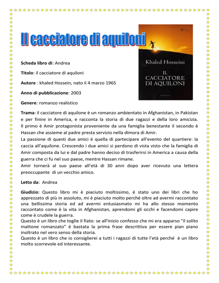 Scheda libro di: Andrea Titolo: il cacciatore di aquiloni Autore : khaled Hossein, nato il 4 marzo 1965 Anno di pubblicazione: 2003 Genere: romanzo realistico Trama: il cacciatore di aquilone è un romanzo ambientato in Afghanistan, in Pakistan e per finire in America, e racconta la storia di due ragazzi e della loro amicizia. Il primo è Amir protagonista proveniente da una famiglia benestante il secondo è Hassan che assieme al padre presta servizio nella dimora di Amir. La passione di questi due amici é quella di partecipare all’evento del quartiere: la caccia all’aquilone. Crescendo i due amici si perdono di vista visto che la famiglia di Amir composta da lui e dal padre hanno deciso di trasferirsi in America a causa della guerra che ci fu nel suo paese, mentre Hassan rimane. Amir tornerà al suo paese all’età di 30 anni dopo aver ricevuto una lettera preoccupante di un vecchio amico. Letto da: Andrea Giudizio: Questo libro mi è piaciuto moltissimo, è stato uno dei libri che ho apprezzato di più in assoluto, mi è piaciuto molto perché oltre ad avermi raccontato una bellissima storia ed ad avermi entusiasmato mi ha allo stesso momento raccontato come è la vita in Afghanistan, aprendomi gli occhi e facendomi capire come è crudele la guerra. Questo è un libro che toglie il fiato: se all'inizio confesso che mi era apparso "il solito mattone romanzato" è bastata la prima frase descrittiva per essere pian piano inoltrato nel vero senso della storia. Questo è un libro che io consiglierei a tutti i ragazzi di tutte l’età perché è un libro molto scorrevole ed interessante. LETTO DA: VALERIO E' un libro che ha avuto un successo strepitoso, assolutamente meritato, in tutto e per tutto. Per lo stile, per la storia, per l'umanità, per le emozioni, per l'ambientazione in Afghanistan, paese in cui i bambini non hanno un'infanzia. I combattimenti di aquiloni sono un'antica tradizione afghana, che fa da filo conduttore nella storia, dall'amicizia fra Amir e Hassan, fino al sorriso, che un aquilone riesce a far comparire sul dolce volto di Sohrab. E' un libro dove i bambini corrono, dove gli adulti soffrono. E' splendida la devozione incondizionata che Hassan prova verso Amir, fino a perdere la propria innocenza di bambino in un vicolo, solo per portare ad Amir il trofeo dell'ultimo aquilone rimasto in volo. E' meraviglioso il modo in cui viene trasmessa al lettore tutta l'interiorità di Amir, i suoi sensi di colpa, i fantasmi della sua coscienza, la sua bontà. E' un romanzo pieno d'atmosfera, emozionante, coinvolgente, indimenticabile e di una forza straordinaria. COMMENTO MOTIVATO: LETTO DA: LORENZO GIUDIZIO MOTIVATO SUL LIBRO: IL LIBRO E’ MOLTO BELLO RACCONTA L’AMICIZIA FRA DUE BAMBINI DURANTE LA GUERRA IN AFGANISTAN. IL LIBRO COINVOLGE MOLTO IL LETTORE PERCHE’ LA STORIA E’ MOLTO BELLA E RACCONTA DI STORIE VERE Letto da: Giudizio motivato: