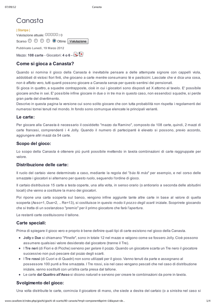 07/09/12 Canasta Canasta | Stampa | Valutazione attuale: Scarso /0 Ottimo Valutazione Pubblicato Lunedì, 19 Marzo 2012 Mazzo: 108 carte - Giocatori: 4 o 6 - Come si gioca a Canasta? Quando si nomina il gioco della Canasta è inevitabile pensare a delle attempate signore con cappelli viola, addobbati di vistosi fiori finti, che giocano a carte mentre consumano tè e pasticcini. Lasciate che vi dica una cosa, non è affatto vero, tutti quanti possono giocare a Canasta senza per questo sentirsi dei pensionati. Si gioca in quattro, a squadre contrapposte, cioè in cui i giocatori sono disposti ad X attorno al tavolo. E' possibile giocare anche in sei. E' possibile infine giocare in due o in tre ma in questo caso, non essendoci squadre, si perde gran parte del divertimento. Descrivo in questa pagina la versione cui sono solito giocare che con tutta probabilità non rispetta i regolamenti dei numerosi tornei tenuti nel mondo. In fondo sono comunque elencate le principali varianti. Le carte: Per giocare alla Canasta è necessario il cosiddetto "mazzo da Ramino", composto da 108 carte, quindi, 2 mazzi di carte francesi, comprendenti i 4 Jolly. Quando il numero di partecipanti è elevato si possono, previo accordo, aggiungere altri mazzi da 54 carte. Scopo del gioco: Lo scopo della Canasta è ottenere più punti possibile mettendo in tavola combinazioni di carte raggruppate per valore. Distribuzione delle carte: Il ruolo del cartaio viene determinato a caso, mediante la regola del "b às fà màs" per esempio, e nel corso delle smazzate i giocatori si alternano per questo ruolo, seguendo l'ordine di gioco. Il cartaio distribuisce 15 carte a testa coperte, una alla volta, in senso orario (o antiorario a seconda delle abitudini locali) che vanno a costituire la mano dei giocatori. Poi ripone una carta scoperta sul banco, vengono infine aggiunte tante altre carte in base al valore di quella scoperta (Asso=1, Due=2, .. Re=13), si costituisce in questo modo il pozzo degli scarti iniziale. Scoprirete giocando che si tratta di un sostanzioso "premio" per il primo giocatore che farà l'apertura. Le restanti carte costituiscono il tallone. Carte speciali: Prima di spiegare il gioco vero e proprio è bene definire quali tipi di carte esistono nel gioco della Canasta. Jolly e Due si chiamano "Pinelle", sono in totale 12 nel mazzo e valgono come se fossero Jolly. Cioè possono assumere qualsiasi valore desiderato dal giocatore (tranne il Tre). I Tre neri (di Fiori e di Picche) servono per gelare il pozzo. Quando un giocatore scarta un Tre nero il giocatore successivo non può pescare dal pozzo degli scarti. I Tre rossi (di Cuori e di Quadri) non sono utilizzati per il gioco. Vanno tenuti da parte e assegnano al possessore 100 punti a fine smazzata. I Tre rossi, sia nel caso vengano pescati che nel caso di distribuzione iniziale, vanno sostituiti con un'altra carta presa dal tallone. Le carte dal Quattro all'Asso si dicono naturali e servono per creare le combinazioni da porre in tavola. Svolgimento del gioco: Una volta distribuite le carte, comincia il giocatore di mano, che siede a destra del cartaio (o a sinistra nel caso si www.cavallore.it/index.php/giochi/giochi-di-scarto/80-canasta?tmpl=component&print=1&layout=de… 1/4 07/09/12 Canasta giochi in senso orario) e di seguito, al proprio turno, giocano tutti. Pescare: La prima cosa da fare, nel proprio turno è pescare una carta dal mazzo e riporla nella propria mano. Se viene pescato un Tre rosso, va tenuto da parte e va pescata un'altra carta. Prendere il pozzo: In alternativa al pescaggio, il giocatore di turno può prelevare TUTTO il pozzo degli scarti, ma ciò può avvenire solo a determinate condizioni. La carta in cima al pozzo non deve essere un Tre nero. La propria squadra ha già aperto, in questo caso la carta in cima al pozzo deve essere subito messa in tavola (in una nuova combinazione o attaccata). La propria squadra non ha ancora aperto, il pozzo può essere prelevato a patto che la prima carta sia subito messa in tavola, essa può contribuire al punteggio di apertura. Solo la prima carta può contribuire al punteggio di apertura, le altre carte del pozzo vanno materialmente raccolte soltanto dopo aver calato sufficienti combinazioni per raggiungere detto punteggio. Quando non si verificano queste condizioni si dice che il pozzo è congelato, vale a dire che non si può prendere. In prima mano può succedere che la prima carta del pozzo, voltata dal cartaio, sia una Pinella oppure un Tre rosso, anche in questo caso il pozzo si considera congelato. Combinazioni: Dopo aver pescato, il giocatore di turno, tenterà di sistemare le proprie carte per costruire e riporre in tavola delle combinazioni, una combinazione è un insieme di carte dello stesso valore. Minimo 3 carte naturali oppure 2 carte naturali e una pinella. Una combinazione di una sola carta naturale e 2 pinelle non è valida. Ogni combinazione può contenere al massimo tre Pinelle. Le combinazioni delle due squadre devono rimanere separate per non fare confusione. Ogni squadra non può avere due combinazioni uguali, cioè con carte dello stesso valore, in questo caso bisogna attaccare. Canasta: Una canasta è una combinazione con 7 o più carte. Si dice canasta "pulita" se è composta solamente da carte naturali, si dice "sporca" se è composta anche da pinelle. Quando una combinazione diventa canasta bisogna chiuderla, cioè allineare tutte le sue carte in un piccolo mazzetto in modo che ne sia visibile solo una. La convenzione vuole che debba rimanere visibile una carta rossa per le canaste pulite e una carta nera per le canaste sporche. Alle canaste è possibile attaccare altre carte ma il loro valore non aumenta. Una canasta pulita a cui venga aggiunta una pinella diventa sporca. Anche se questo caso non si verifica praticamente mai. Le canaste sono importantissime ai fini del gioco quindi i contendenti devono cercare di realizzarne il più possibile ed il prima possibile. In