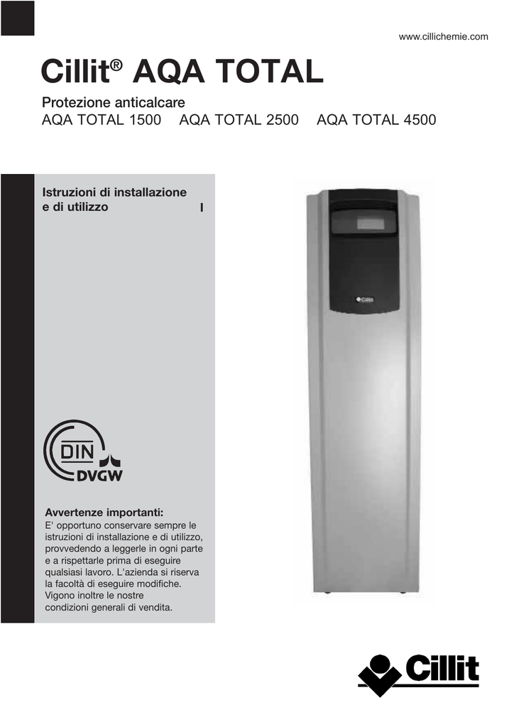 www.cillichemie.com Cillit® AQA TOTAL Protezione anticalcare AQA TOTAL 1500 AQA TOTAL 2500 Istruzioni di installazione e di utilizzo I Avvertenze importanti: E' opportuno conservare sempre le istruzioni di installazione e di utilizzo, provvedendo a leggerle in ogni parte e a rispettarle prima di eseguire qualsiasi lavoro. L'azienda si riserva la facoltà di eseguire modifiche. Vigono inoltre le nostre condizioni generali di vendita. AQA TOTAL 4500 Indice 1. 2. 3. 4. 5. Informazioni generali Principio di funzionamento Caratteristiche generali Premesse all’installazione Installazione 5.1.Condizioni generali 5.2. a.) Dotazione fornitura AQA total 1500 b.) Dotazione fornitura AQA total 2500 c.) Dotazione fornitura AQA total 4500 5.3. Schema di installazione a.) Schema di installazione AQA total 1500 b.) Schema di installazione AQA total 2500 c.) Schema di installazione AQA total 4500 5.4. Montaggio a.) Montaggio AQA total 1500 b.) Montaggio AQA total 2500 c.) Montaggio AQA total 4500 6. Messa in funzione 7. Funzionamento Modifica delle impostazioni di base 8. Sostituzione del Refill 9. Manutenzione 10. Garanzia Obblighi del gestore 11. Dati tecnici 12. Registro dell’impianto 3 4 4 4 5 5 5 5 5 6 6 7 8 9 9 9-10 10 10-11 11 11-12 12 12 12 12-13 14 15 1. Informazioni generali Cari clienti, vi ringraziamo per la fiducia dimostrata verso i nostri apparecchi. Per ottenere un ottimale funzionamento dell’apparecchio è opportuno conservare sempre a portata di mano le presenti istruzioni di installazione e di utilizzo, provvedendo a leggerle in ogni parte e a rispettarle prima di eseguire qualsiasi lavoro. Si prega di osservare anche eventuali istruzioni di installazione e di utilizzo dei singoli componenti! I nostri fogli di istruzioni sono pensati per fornire consulenza in buona fede, ma il contenuto non è comunque giuridicamente vincolante. Vigono inoltre le nostre condizioni generali di contratto. Le presenti istruzioni di installazione e di utilizzo devono essere consegnate al gestore dell’impianto! 3 2. Principio di funzionamento 4. Premesse all’installazione Cillit Energy Wasser. Il vostro piacere quotidiano da bere – un piacere indispensabile per tutta la famiglia. La rivoluzionaria tecnologia contenuta in AQA total vi fornisce la nuova forza dell’acqua potabile personalmente e a casa vostra. Rispettare le prescrizioni di installazione locali, le direttive generali, le condizioni igieniche generali e i dati tecnici. Il luogo di installazione deve essere protetto dal gelo e deve essere garantita la protezione dell’impianto da agenti chimici, vernici, solventi, vapori e influssi ambientali. La temperatura ambiente non deve superare i 40°C. Proteggere l’apparecchio dai raggi diretti del sole e dalla luce UV. • Un piacere quotidiano ricco di sostanze vitali tutto per voi AQA total rispetta tutti i preziosi minerali contenuti nell’acqua potabile. Il consumo quotidiano consapevole di Cillit Energy Wasser rappresenta la vostra fonte di energia sana e ricca di sostanze vitali ed importanti per il vostro organismo come magnesio, calcio e ossigeno. • La migliore protezione anticalcare per il vostro impianto di acqua potabile La tecnologia bipolare – insignita di marchi di controllo internazionali (ÖVGW, DVGW,...) e vincitrice presso la Stiftung Warentest – grazie alla formazione di nanocristalli stabilizza il calcare contenuto nell’acqua. AQA total – impianto di protezione anticalcare ecologico, semplice da installare e a bassa manutenzione ordinaria, destinato a ridurre il deposito di calcare e a proteggere contro i danni nelle condutture dell’acqua potabile (max 72°Fr durezza) e dei boiler collegati a valle (max 80°C). Inoltre permette d i rispettare gli standard OMS e il regolamento sull’acqua potabile. 3. Caratteristiche generali Fare riferimento inoltre alla Legge n. 46/90 ed al al Decreto n. 443/90 del Ministero della Sanità. L'AQA TOTAL deve essere alimentato con acqua potabile conformemente alle normative vigenti. A monte dell’apparecchio deve essere obbligatoriamente collegato un filtro per acqua potabile testato per proteggere dalle particelle esterne. A protezione dell’intera installazione e dell’impianto, in caso di pressione di rete superiore a 6 bar, è necessario collegare a monte un riduttore di pressione. Per un’alimentazione di acqua in loco si consiglia il filtro con lavaggio in controcorrente Cillit Multipur (automatico o manuale), per poter usufruire, se necessario, del gruppo con riduttore di pressione COMBI. In caso di pressioni in entrata elevate (per es.: 10 bar e oltre) è indispensabile predisporre un percorso di compensazione dopo il riduttore di pressione. L’esclusiva di AQA total: L’unità attiva è composta da un corpo base e un Refill con un elettrodo tridimensionale, composto da particelle conduttrici di corrente e non conduttrici. In seguito all’applicazione di definiti impulsi di corrente / di tensione, si verifica uno spostamento locale dell’equilibrio tra calcare e anidride carbonica. In questo caso la frequenza e l'ampiezza degli impulsi dipendono dalla qualità e dalla portata dell'acqua trattata. Questi vengono regolati automaticamente dal comando elettronico. In conseguenza dello spostamento locale dell’equilibrio tra calcare e anidride carbonica, nell’unità si formano minuscoli cristalli di carbonato di calcio, i cosiddetti nanocristalli. A causa delle loro dimensioni minime, i nanocristalli sono in grado di trasportare una carica elettrica che impedisce la crescita combinata. La totalità dei nanocristalli è in grado di catturare il calcare contenuto nell’acqua e prevenirne i depositi all’interno delle tubature e degli scalda acqua. Il delicato processo di AQA total consente di mantenere nell’acqua tutte le sostanze minerali importanti, come il calcio e tante altre. Per il controllo del funzionamento è necessario un percorso di prova. Una connessione alla rete elettrica (presa con contatto 