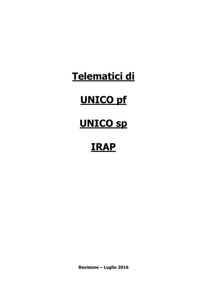 Telematici di UNICO pf UNICO sp IRAP Revisione – Luglio 2016 Sommario Prerequisiti per la consultazione del manuale ................................................................. 1 Principali icone e simboli utilizzati .................................................................................. 2 Telematici Unico/IRAP .................................................................................................. 4 Unico (pf/sp) o IRAP “singolo” ...................................................................................... 5 Unico PF/SP con IVA on Line ....................................................................................... 14 La bacheca ................................................................................................................ 15 Unico PF/SP con IVA AUTONOMA ................................................................................ 16 Unico PF/SP con Studi di settore ................................................................................. 17 Dichiarazioni soggette agli Studi di settore ma prive di questi o non completamente compilati .................................................................................................................... 18 Errori frequenti della diagnostica Sogei ........................................................................ 20 Prerequisiti per la consultazione del manuale Prerequisito per la consultazione di questo manuale è la lettura del manuale denominato “Anagrafica Unica” che spiega i dati gestiti e comuni a tutte le procedure relativamente agli individui gestiti nel sistema e relativamente a tutti i soggetti non individui (soggetti di imposta) genericamente denominati “DITTE” . In tale manuale sono anche spiegate le regole di visibilità dei dati che legano le anagrafiche presenti agli operatori che le “vedono” (inseriscono, modificano annullano) attraverso una codifica gerarchica detta “codice permanenza” che rappresenta il sistema geografico secondo lo schema regione---provincia---- permanenza---sottocodice. Tale manuale chiarisce anche quali suono i “ruoli” dell’operatore rispetto alla gerarchia del codice permanenza e rispetto alle funzioni del programma che possono essere attivate o no (programma 730, 770, gestione cia ecc.). Nel manuale citato è pure spiegata l’attività di “profilazione”, ovvero la gestione degli operatori da parte del “Responsabile provinciale” che può attraverso un’opportuna funzione di catalogo inserire o modificare gli operatori che operano nella provincia, identificando i ruoli, le funzioni e la visibilità sulle permanenze. PROCEDURE FISCALI - pag. 1 Principali icone e simboli utilizzati Icona Manuale Scopo Il pulsante con figurata sopra una cartella ha come scopo quello di visualizzare il manuale del modulo Contabilità iva e consultarlo. Assistenza Il pulsante raffigurante una busta da lettera permette di inviare un messaggio di posta elettronica al servizio di assistenza di 01SISTEMI. Disconnetti Il pulsante raffigurante una freccia rossa indicante una porta permette di eseguire l’uscita dal programma (Log-out). Cerca Ricerca avanzata Nuovo individuo Il pulsante della lente ha come scopo quello di eseguire una ricerca mirata; ossia trovare dati/informazioni che corrispondono ad una serie di parametri immessi (solitamente si ricerca ad esempio per una parte della denominazione di una ditta). Il pulsante della lente con un ingranaggio ha come scopo quello di passare da una ricerca semplice, in cui i parametri disponibili sono mirati e ridotti al minimo indispensabile, ad una ricerca avanzata; ossia una ricerca dove il numero dei parametri copre casistiche più complesse ed articolate. In questo modo i risultati della ricerca possono essere più precisi. Il pulsante raffigurante un omino con a fianco un più ha come scopo quello di aggiungere/creare un nuovo individuo. Nuova ditta Il pulsante raffigurante un capannone con a fianco un più ha come scopo quello di aggiungere/creare una nuova ditta. Nuova ditta estera Il pulsante raffigurante un capannone con a fianco un più e sotto la una bandiera di uno stato estero ha come scopo quello di creare/aggiungere una nuova ditta estera. Salva e resta Salva e torna Salva e nuovo Visualizza Modifica Il pulsante a forma di floppy ha come scopo quello di salvare i dati presenti sulla schermata restando sulla schermata stessa. Il pulsante a forma di floppy con la freccia a fianco ha come scopo quello di salvare i dati presenti sulla schermata e tornare automaticamente alla pagina precedente (quella da cui era stato richiesto l’inserimento di un nuovo elemento). Il pulsante a forma di floppy con il foglio bianco a fianco ha come scopo quello di salvare i dati presenti sulla schermata presentando poi direttamente una maschera vuota per un nuovo inserimento. Il pulsante raffigurante la lente di ingrandimento su un foglio ha come scopo quello di accedere ad una maschere in modalità di sola consultazione (sola lettura). I dati visualizzati non potranno pertanto essere modificati dall’operatore. Il pulsante raffigurante gli attrezzi ha come scopo quello di accedere ad una maschere in modalità modifica. I dati visualizzati potranno cioè essere modificati dall’operatore. PROCEDURE FISCALI - pag. 2 Elimina Stampa Indietro Indice Contabilità IVA Il pulsante raffigurante una X con sullo sfondo un cerchio rosso ha come funzione quella di eliminare i dati contenuti nella schermata o nella riga selezionata se si trova su un elemento di una lista. Il pulsante a forma di stampante ha lo scopo di creare la stampa dei dati visualizzati Il pulsante a forma di freccia permette di ritornare alla pagina precedente. Se i dati della maschera non sono stati salvati, ha l’effetto di annullare l’operazione di inserimento o modifica che si sta facendo. Il pulsante con la freccia rossa verso l’alto e la scritta IVA consente di andare alla pagina di indice delle funzioni di