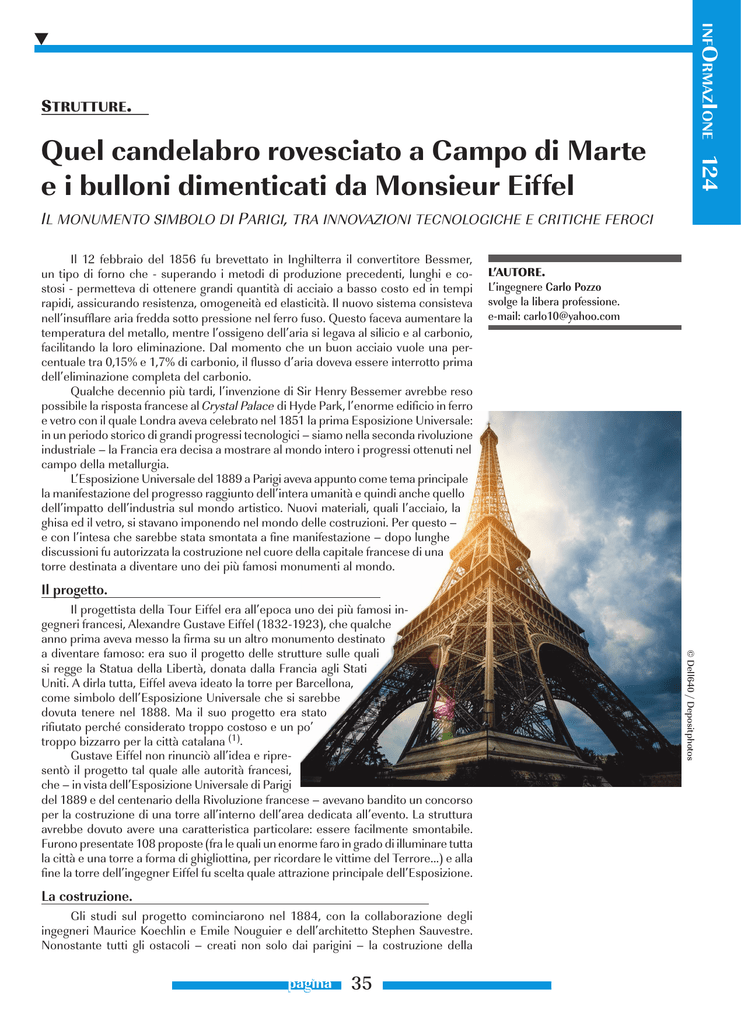 Quel candelabro rovesciato a Campo di Marte e i bulloni dimenticati da Monsieur Eiffel INFORMAZIONE 124 Strutture. Il monumento simbolo di Parigi, tra innovazioni tecnologiche e critiche feroci Il 12 febbraio del 1856 fu brevettato in Inghilterra il convertitore Bessmer, un tipo di forno che - superando i metodi di produzione precedenti, lunghi e costosi - permetteva di ottenere grandi quantità di acciaio a basso costo ed in tempi rapidi, assicurando resistenza, omogeneità ed elasticità. Il nuovo sistema consisteva nell’insufflare aria fredda sotto pressione nel ferro fuso. Questo faceva aumentare la temperatura del metallo, mentre l’ossigeno dell’aria si legava al silicio e al carbonio, facilitando la loro eliminazione. Dal momento che un buon acciaio vuole una percentuale tra 0,15% e 1,7% di carbonio, il flusso d’aria doveva essere interrotto prima dell’eliminazione completa del carbonio. Qualche decennio più tardi, l’invenzione di Sir Henry Bessemer avrebbe reso possibile la risposta francese al Crystal Palace di Hyde Park, l’enorme edificio in ferro e vetro con il quale Londra aveva celebrato nel 1851 la prima Esposizione Universale: in un periodo storico di grandi progressi tecnologici – siamo nella seconda rivoluzione industriale – la Francia era decisa a mostrare al mondo intero i progressi ottenuti nel campo della metallurgia. L’Esposizione Universale del 1889 a Parigi aveva appunto come tema principale la manifestazione del progresso raggiunto dell’intera umanità e quindi anche quello dell’impatto dell’industria sul mondo artistico. Nuovi materiali, quali l’acciaio, la ghisa ed il vetro, si stavano imponendo nel mondo delle costruzioni. Per questo – e con l’intesa che sarebbe stata smontata a fine manifestazione – dopo lunghe discussioni fu autorizzata la costruzione nel cuore della capitale francese di una torre destinata a diventare uno dei più famosi monumenti al mondo. L’AUTORE. L’ingegnere Carlo Pozzo svolge la libera professione. e-mail: [email protected] Il progetto. La costruzione. Gli studi sul progetto cominciarono nel 1884, con la collaborazione degli ingegneri Maurice Koechlin e Emile Nouguier e dell’architetto Stephen Sauvestre. Nonostante tutti gli ostacoli – creati non solo dai parigini – la costruzione della pagina 35 © Dell640 / Depositphotos Il progettista della Tour Eiffel era all’epoca uno dei più famosi ingegneri francesi, Alexandre Gustave Eiffel (1832-1923), che qualche anno prima aveva messo la firma su un altro monumento destinato a diventare famoso: era suo il progetto delle strutture sulle quali si regge la Statua della Libertà, donata dalla Francia agli Stati Uniti. A dirla tutta, Eiffel aveva ideato la torre per Barcellona, come simbolo dell’Esposizione Universale che si sarebbe dovuta tenere nel 1888. Ma il suo progetto era stato rifiutato perché considerato troppo costoso e un po’ troppo bizzarro per la città catalana (1). Gustave Eiffel non rinunciò all’idea e ripresentò il progetto tal quale alle autorità francesi, che – in vista dell’Esposizione Universale di Parigi del 1889 e del centenario della Rivoluzione francese – avevano bandito un concorso per la costruzione di una torre all’interno dell’area dedicata all’evento. La struttura avrebbe dovuto avere una caratteristica particolare: essere facilmente smontabile. Furono presentate 108 proposte (fra le quali un enorme faro in grado di illuminare tutta la città e una torre a forma di ghigliottina, per ricordare le vittime del Terrore...) e alla fine la torre dell’ingegner Eiffel fu scelta quale attrazione principale dell’Esposizione. INFORMAZIONE 124 Strutture L’ingegnere-costruttore. Se la storia della torre Eiffel è abbastanza nota, non tutti sono andati oltre i brevi cenni biografici sul suo intrepido ideatore. Alexandre Gustave Bönickhausen Eiffel (Digione, 15 dicembre 1832 – Parigi, 27 dicembre 1923) era nato in un ambiente agiato: suo padre, ufficiale, aveva sposato una donna d’affari, imprenditrice nel commercio del legno e del carbone, con una solida fortuna personale (5). La famiglia, di origine tedesca, si era trasferita a Parigi nei primi anni del 1700. Il cognome originale era Bönickhausen, ma siccome era difficile da pronunciare per i francesi, un antenato pagina 36 © Friday / Depositphotos Torre Eiffel cominciò nel 1887, durò 26 mesi e fu completata nel 1889. Come accennato, l’idea originale comprendeva lo smantellamento dopo l’Esposizione Universale del 1900, ma gli esperimenti di radiotrasmissione effettuati dall’esercito francese prima della fatidica data giustificarono prima un rinvio dello smontaggio e poi la salvezza della torre (2). A questo riguardo, è curioso notare la strana scelta dei chiodi ribattuti a caldo piuttosto che quella di semplici bulloni, facilmente smontabili, per assemblare le travi di una torre considerata provvisoria. Forse l’ingegnere Gustave Eiffel in realtà non voleva che la torre fosse smontata tanto facilmente, e magari nemmeno tanto presto, cosa che invece avvenne puntualmente per la struttura in acciaio e vetro (e bulloni) della Galleria delle Macchine, un padiglione anch’esso costruito per l’Esposizione Universale. Probabilmente, con quella scelta tecnica, il progettista aveva cercato di proteggere la propria creatura e di preservarla nel tempo. Il cantiere nel Champ de Mars (una piazza d’armi successivamente trasformata in giardino pubblico) era stato aperto il 28 gennaio 1887. Fra i curiosi che seguivano il lavoro degli operai c’erano soprattutto gli abitanti del quartiere: dopo aver sentito parlare del discusso progetto, non avevano il minimo dubbio sulla rovinosa caduta di quel mostro di ferro che qualcuno aveva deciso di costruire accanto alle loro case (3). Gli operai del coraggioso ingegnere impiegarono 26 mesi per tirare su la torre di 300 metri e 51 cm e all’epoca i giornali in tutto il mondo diedero ampio spazio agli strabil