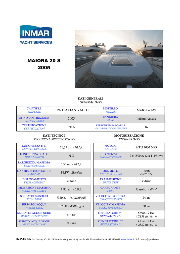 MAIORA 20 S 2005 DATI GENERALI GENERAL DATA CANTIERE SHIPYARD FIPA ITALIAN YACHT MODELLO MODEL MAIORA 20S ANNO COSTRUZIONE YEAR OF BUILT 2005 BANDIERA FLAG Italiana/Italian CERTIFICAZIONE CERTIFICATION CE A PERSONE IMBARCABILI MAX NUMB. OF PASSENGERS 16 DATI TECNICI TECHNICAL SPECIFICATIONS MOTORIZZAZIONE ENGINES DATA LUNGHEZZA F. T. LENGTH OVERALL 21,37 mt. - 70,1 ft. MOTORI ENGINES MTU 2000 M93 LUNGHEZZA SCAFO HULL LENGTH N.D POTENZA ENGINES POWER 2 x 1500 cv (2 x 1119 kw) LARGHEZZA MASSIMA BEAM OVERALL 5,55 mt. - 18,1 ft. MATERIALE COSTRUZIONE MATERIAL PRFV - fiberglass ORE MOTO ENGINES HOURS DISLOCAMENTO DISPLACEMENT 50 tonn TRASMISSIONE DRIVE TYPE V-drive IMMERSIONE MASSIMA MAXIMUM DRAFT 1,80 mt. - 5,9 ft. CARBURANTE FUEL Gasolio - diesel SERBATOI GASOLIO FUEL TANK 7320 lt. - 1610IMP gall. VELOCITA'CROCIERA CRUISING SPEED 24 kn SERBATOI ACQUA WATER TANK 1820 lt. - 400MP gall. VELOCITA' MASSIMA MAXIMUM SPEED 30 kn SERBATOI ACQUE NERE BLACK WATER TANK si - yes GENERATORE n°1 GENERATOR n° 1 Onan 17 kw h 2858 (18/03/15) SERBATOI ACQUE GRIGIE GREY WATER TANK si - yes GENERATORE n°2 GENERATOR n° 2 Onan 17 kw h 2832 (18/03/15) 1018 (18/03/15) INMAR snc Via Orsato, 30 -‐ 30175 Venezia Marghera -‐ Italy -‐ mob: +39.329.0907407 +39.348.1250078 www.inmar.it [email protected] LAYOUT CABINE CABINS 3 CABINE EQUIPAGGIO CREW CABINS 1 POSTI LETTO BEDS 6 POSTI LETTO BEDS 2 SERVIZI TOILETS 3 SERVIZI EQUIPAGGIO CREW TOILETS 1 INMAR snc Via Orsato, 30 -‐ 30175 Venezia Marghera -‐ Italy -‐ mob: +39.329.0907407 +39.348.1250078 www.inmar.it [email protected] EQUIPAGGIAMENTO INTERNI: in rovere, pavimenti dinette in parquet e cabine in moquette. Cabina armatore tutto baglio con bagno privato; cabina Vip con letto matrimoniale e bagno privato; n°1 cabina ospiti con 2 letti in piano e bagno ad uso esclusivo; n. 1 cabina marinaio con 2 letti e bagno. Cucina in locale separato sul ponte principale con porta di accesso al camminamento laterale di dritta. ELETTRONICA DI NAVIGAZIONE: N° 3 plotter multifunzione Raymarine C120 (GPS - plotter radar - eco/fishfinder) - Raymarine DS600X fishfinder - Pilota Automatico Raymarine ST7001 - VHF Sailor - VHF ICOM mod. IC-M411 - n. 2 strumenti multifunzione Raymarine ST60 MULTI - Stazione del vento Raymarine ST 60 WIND - Strumento Raymarine ST60 Rudder - Epirb - Bussola magnetica White Star. INTRATTENIMENTO: Antenna TV Sat NAVISISTEM - Antenna digitale terrestre - TV in ogni ambiente - Impianto stereo in ogni cabina - autoradio con comando remoto sul fly - casse water proof in pozzetto e fly. IMPIANTI: Impianto aria condizionata convertibile Condaria in ogni ambiente - Eliche di manovra prua e poppa idrauliche BCS Presa diretta banchina acqua dolce - Pompa incendio ad acqua di mare con idrante a prua e poppa - Impianto antincendio sala macchine Faro orientabile - Dissalatore IDROMAR da 30 lt/h - Flaps idraulici BCS - Timoneria idraulica BCS - N°2 boiler da 80 lt - Telefono SAT - Impianto cordless - Inverter - Carica batterie - Telecamere a circuito chiuso - Impianto antifurto. ATTREZZATURA DI COPERTA: Passerella idraulica Pinn Craft - Scaletta bagno elettroidraulica Verricello salpa ancora LOFRANCES’ TITAN 2000W 24V con campana di tonneggio e tripla stazione di comando - N°2 capestani LOFRANCES’ 1200 W 24V - Telo copri parabrezza, finestrature laterali e pozzetto - Cuscini prendisole per fly-bridge e tuga - Doccetta calda/fredda a poppa a prua e sul fly Teak in tutti i ponti e in plancetta - Gruetta e ricovero per tender a prua - Tender 3,5 mt. con Mercury 9,9 hp -ncora Posidonia HV da 90 kg - Porta dinette elettrica - Bimini sul fly e sul prendisole di prua. ELETTRODOMESTICI: CUCINA: Piano cottura in vetroceramica a 4 fuochi Miele - Forno Miele Cappa aspirante -Lavello - Piano cucina in Corian - Frigorifero - nr. 2 Freezer - Lavastoviglie MIELE Lava asciuga - Porta a pantografo per accesso esterno - Ice-maker. WET BAR: Grill - Frigo - Lavello con miscelatore. INMAR snc Via Orsato, 30 -‐ 30175 Venezia Marghera -‐ Italy -‐ mob: +39.329.0907407 +39.348.1250078 www.inmar.it [email protected] EQUIPMENT INTERIORS: in oak wood, parquet flooring in the dinette and carpet flooring in the cabins. Full beam Master cabin with private bathroom. VIP cabin with double bed and private bathroom; n°1 Guest cabin with 2 flat beds and private bathroom; n. 1 Crew cabin with 2 beds and toilet. Separate galley on the main deck with access door to side starboard walkway. ELETTRONICS: N° 3 Raymarine C120 multifunction display (GPS - plotter - radar - eco/fish finder) Raymarine DS600X fish finder - Raymarine ST7001 autopilot - VHF Sailor - IC-M411 ICOM VHF - n. 2 Raymarine ST60 MULTI multifunction device - Raymarine ST 60 WIND station - Raymarine ST60 Rudder instrument - Epirb - White Star magnetic compass. ENTERTAINMENT: NAVISISTEM TV Sat aerial - Digital terrestrial antenna - TV in each room Stereo system in each cabin - Radio with remote control on the fly - Water proof loudspeakers in cockpit and fly. SYSTEMS: Condaria convertible air-conditioning system in every room - BCS hydraulic stern and bow thrusters - Freshwater mooring outlet - Seawater fire pump with hydrant both at bow and stern - Engine room fire extinguishing system - Searchlight - 30 lt/h IDROMAR water maker - BCS hydraulic flaps BCS hydraulic steering system- N°2 water heater (80 lts) - SAT phone - Cordless system- Inverter - Battery charger - CCTV cameras – Alarm system DECK EQUIPMENT: Pin Craft hydraulic gangway- Electrohydraulic swimming ladder LOFRANCES’ TITAN 2000W 24V anchor windlass with capstan and three remote control - N°2 LOFRANCES’ 1200 W 24V capstans – Windshield, side windows and cockpit covering canvas - Flybridge and deck sunbathing cushions - Hot/cold shower at bow, stern and on the fly - Teak on every deck and swimming platform - Crane and garage for tender at bow - 3,5 mt. tender with Mercury 9,9 hp outboard engine - 90 kgs Posidonia HV anchor – Dinette electric door - B