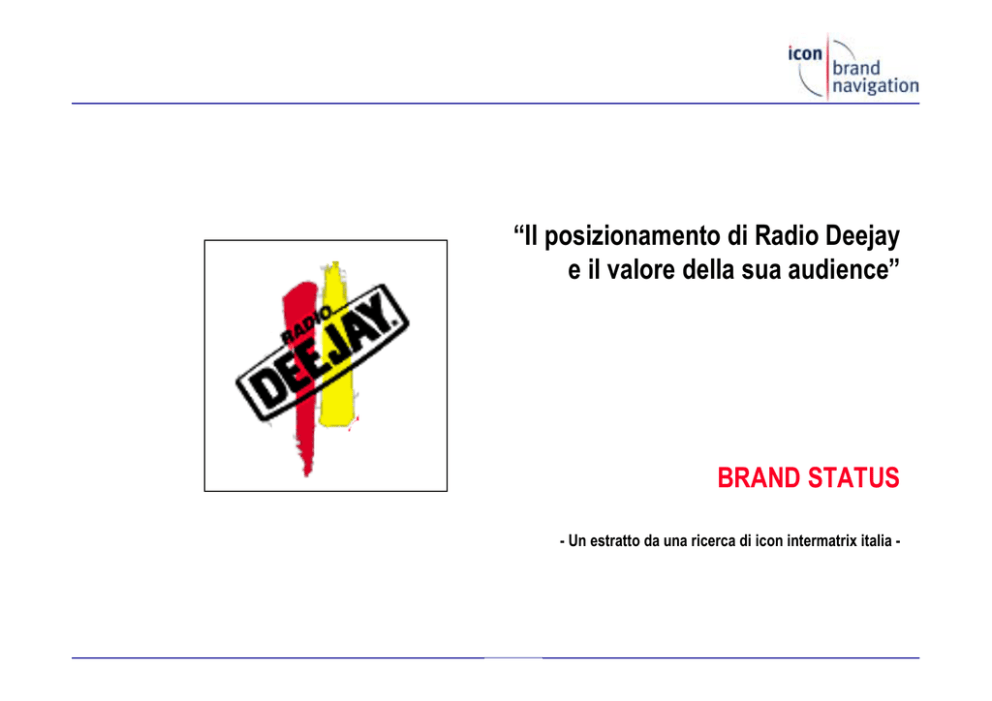 “Il posizionamento di Radio Deejay e il valore della sua audience” BRAND STATUS - Un estratto da una ricerca di icon intermatrix italia - BRAND STATUS Indice ■ La ricerca ■ La metodologia ■ Il profilo di Radio Deejay e le ragioni dell’eccellenza ■ L’identità ■ Il valore di Radio Deejay: il brand equity a confronto ■ Conclusioni ■ icon brand navigation group: presentazione BRAND STATUS La ricerca BRAND STATUS La metodologia BRAND STATUS “The icon concept of brand equity” BRAND STATUS ■ 400 interviste personali ad ascoltatori di Radio Deejay e di altre due primarie radio ■ tecniche e modelli di elaborazione e analisi esclusivi del gruppo icon brand navigation Il profilo di Radio Deejay e le ragioni dell’eccellenza 0 20 40 Essenza della marca 60 80 100 Tonalità iconografia Benefit & Reason Why della marca BRAND STATUS Lo schema “a T” Secondo la teoria degli emisferi cerebrali, in quello sinistro ha sede l’archiviazione ed elaborazione degli elementi conoscitivi astratti/razionali e in quello destro l’archiviazione ed elaborazione degli elementi concreti/sensoriali. Affidabilità Freschezza Innovazione Nostalgia Design Ristoro Piacere Care Sicurezza L’immagine profonda della marca è frutto dei processi che avvengono nei due emisferi e il suo successo dipende dalla coerenza delle reason why (emisfero sinistro) e delle percezioni (emisfero destro) con le attese del target, ma soprattutto dalla capacità del brand di trasferire - e confermare - nelle componenti concrete/sensoriali (emisfero destro), le promise (emisfero sinistro) Lo “schema a T” rileva e riordina gli elementi costitutivi dell’immagine profonda della marca, consentendo sia una lettura sintetica e immediata del suo profilo, sia una verifica della coerenza fra gli elementi astratti e quelli concreti BRAND STATUS Come funziona BRAND STATUS Come si legge lo schema-T (un esempio tratto da un brand ipotetico) Gli elementi che costituiscono il profilo vengono riportati nelle due aree e “pesati” in base alla loro penetrazione presso il target. Es.: “seria” è un aspetto associato al brand dal 38% degli intervistati e, al suo interno, “affidabile” è un attributo riconosciuto dal 10%. Astratto Concreto 100 Seria seria affidabile Gentile/ simpatica/ premurosa gentile Attuale/ moderna moderna Tradizionale solida Flessibile/disponibile flessibile Efficiente efficiente 38 13 10 28 11 13 6 13 7 13 8 12 11 buon servizio/ servizio migliore customer oriented 9 8 90 Tonalità (76) 80 70 60 50 40 Servizio (32) Competenza (30) 30 20 professionale di successo/ orienta sulla crescita/ 11 10 0 Marca (30) Presenza (14) Marchio/ logo/ grafica (10) Situazioni/ località (9) BRAND STATUS locale/ regionale storica 12 8 dappertutto/ vicino/ sotto casa/ diffusa 10 marchio/ logo/ grafica in generale 8 piazza X a Y 9 RDJ: una radio “ludica” e vincente, alta la coerenza fra le aree, confermate le ragioni del successo Astratto Attuale/ moderna giovane moderna/ di tendenza/ alla moda Allegra/ divertente fa ridere/ mette di buon umore allegra/ fanno casino Dinamica/ vivace vivace/ dinamica/ attiva frizzante/ fresca Simpatica Relazionale Unica/ diversa Concreto 36 21 18 34 19 18 26 20 8 15 9 8 DJ/ conduttori in genere plus famosi/ storici simpatici/ amici 31 10 8 Contenuto del palinsesto plus Musica/ classifiche plus 25 22 Benefits emozionali Atmosfera allegria/ divertimento/ risate 14 13 9 il meglio/buona radio/ottima radio 13 per giovani 12 100 90 80 Tonalità (74) 70 60 50 DJ/ conduttori valutazione (34) Contenuto del palinsesto valutazione (29) Benefits emozionali/ atmosfera (25) Qualità/ superiorità (21) Target (20) Contenuto del palinsesto descrizione Musica/ classifiche programma musicale/ musica in genere musica da discoteca brani attuali/ musica di tendenza 18 11 8 DJ/ conduttori (descrizione) DJ/ conduttori in genere Linus 27 13 5 51 45 Contenuto del palinsesto (64) DJ/ conduttori (50) 40 30 20 Visuals (31) Programmi/ rubriche (22) Pubblicità (15) 10 0 BRAND STATUS Marchio/ logo/ grafica (5) Situazioni/ località 24 discoteca/ discoteca all’aperto 10 un gruppo di amici che si divertono/ una festa con gli amici 6 vacanze/ mare/ spiaggia 6 Il Brand Core: Benefits, Competenze e “Carattere” di RDJ ■ La rilevazione di quanto è diffusa presso il target l’attribuzione di specifiche “capacità” a RDJ ■ Il confronto con l’importanza attribuita dal target a ciascuna capacità ■ La rilevazione di quanto è diffusa presso il target l’attribuzione di specifici “caratteri” a RDJ BRAND STATUS “Diversa” e sistematicamente più “performante” dei suoi concorrenti RDJ importanza assoluta attribuita alla capacità Ti dà la carica, ti mette energia (64) Ti mette in contatto col mondo (40) E´ molto attenta alla qualità (64) Ha i migliori DJ (39) Informa puntualmente sui calendari dei concerti e delle manifestazioni musicali (39) È aperta anche alla musica italiana (38) Ti fa divertire (60) Ha la musica migliore (59) È un buon sottofondo per quello che fai (52) Sa parlare ai giovani come noi (38) Si sente bene ovunque (50) Fa tendenza (34) Chi la ascolta fa parte di una comunità (26) I suoi conduttori sono tutti personaggi di primo piano (25) Ti accompagna tutta la giornata (49) E´ modernissima, attuale (43) Ti fa sentire in compagnia di amici (43) Spesso ha ospiti prestigiosi in studio (22) È come noi, ci si riconosce (41) Viene raccomandata dagli amici (20) Ti aggiorna sulle novità e le tendenze (41) 0 20 40 60 80 100 Il suo sito internet è particolarmente bello e interessante (18) 0 20 quota del campione che attribuisce la capacità alla radio Radio Deejay altre radio primarie importanza assoluta BRAND STATUS 40 60 80 100 Una radio con una personalità spiccata giovane intelligente allegra complice alla moda sincera divertente cosmopolita, cittadina del mondo simpatica furba socievole disponibile chiacchierona sensibile aggressiva superficiale affidabile individ