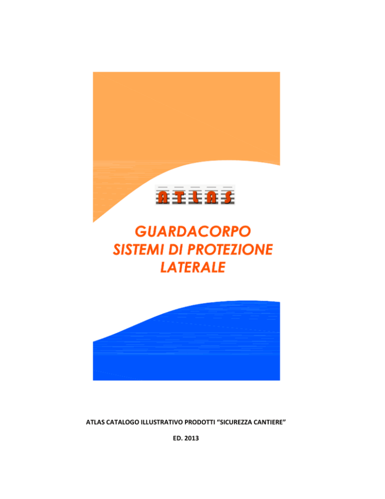 ATLAS CATALOGO ILLUSTRATIVO PRODOTTI “SICUREZZA CANTIERE” ED. 2013 “SICUREZZA CANTIERE” ED. 2013 GC/02EN MONTANTE PER GUARDACORPO DA SOLETTA DESCRIZIONE: montante per realizzare barriere di protezione laterale, con interasse max 180 cm., da completare in opera con traverse orizzontali in metallo o legno + metallo(ns. art. TRM – TRF) o in legno con dimensioni e requisiti come richiesti dalla UNI EN 13374, bloccate su tre mensole per ogni montante SUPPORTO E APPLICAZIONI: solai o solette in c.a. piani o con pendenza fino a 10° - profili inclinati (scale) - con spessore min. 12 cm. e max 60 cm., balconi, terrazze, travi di bordo, travi veletta, travi prefabbricate COMPONENTI: l’elemento è formato da un sistema di aste in tubolare in acciaio complete di barra filettata interna con manovella per il richiamo del blocco morsa; n° 3 mensoline ferma traversa complete di chiavette di fermo; sistema morsa inferiore completo di piastra anti slittamento; protezione all’ossidazione realizzata con zincatura elettrolitica esterna ed interna; tappi di protezione al taglio sulla manovella; punzonatura su ogni pezzo MATERIALI: acciaio FE430/S275 zincato UNI ISO 2081 PESO: 7,10 kg CONFEZIONI: Pallet 50 pz. NORME DI RIFERIMENTO: D.Lgs 81/08 art. 13; UNI EN 13374 Classe A AVVERTENZE: Prestare massima attenzione alla qualità del supporto; in caso di incertezze sulla regolarità della superficie o nella consistenza del materiale adottare un tassello di sicurezza utilizzando l’apposito foro della piastra superiore della morsa; Verificare sempre, dopo il serraggio, la tenuta della morsa per assicurarsi che non ci siano irregolarità, punti di incerta fattura, scalini o sporgenze nel supporto cementizio; Serrare con forza servendosi esclusivamente dell’apposita maniglia; Il guardacorpo ATLAS è, come montante, uno dei componenti del sistema di protezione anticaduta; l’ATLAS declina ogni responsabilità se gli altri elementi non sono rispondenti ai requisiti necessari; Quando si utilizzano traverse in legno, verificare la conformità delle dimensioni e della qualità del materiale (spessori, presenza di nodi, ecc…); Quando gli elementi della barriera, espletando la loro funzione protettiva, vengano sottoposti ad urto violento, dovranno essere sostituiti; LE SCHEDE TECNICHE DI CIASCUN MODELLO SONO CONSULTABILI IN RETE AL SITO: WWW.ATLAS-EDILIZIA.IT • Usare sempre il dispositivo di protezione individuale durate la fase di montaggio e smontaggio VIA DI COLLODI, 10 - 50141 – FIRENZE TEL. 055.4564745 - FAX 055.4564759 [email protected] - www.atlas-edilizia.it 1 “SICUREZZA CANTIERE” ED. 2013 GC/02T MONTANTE PER GUARDACORPO PER COPERTURE DESCRIZIONE: montante per realizzare barriere di protezione laterale, con interasse max 180 cm., da completare in opera con traverse orizzontali in metallo o legno + metallo(ns. art. TRM – TRF) o in legno con dimensioni e requisiti come richiesti dalla UNI EN 13374, bloccate su quattro mensole per ogni montante SUPPORTO E APPLICAZIONI: solai o solette in c.a. piani o con pendenza fino a 10° (classe A) o fino a 30° (classe B) - profili inclinati (scale) - con spessore min. 12 cm. e max 50 cm., balconi, terrazze, travi di bordo, travi veletta, travi prefabbricate – idoneo per coperture COMPONENTI: l’elemento è formato da un sistema di aste in tubolare in acciaio complete di barra filettata interna con manovella per il richiamo del blocco morsa; n° 4 mensoline ferma traversa complete di chiavette di fermo; sistema morsa inferiore completo di piastra anti slittamento; protezione all’ossidazione realizzata con zincatura elettrolitica esterna ed interna; tappi di protezione al taglio sulla manovella; punzonatura su ogni pezzo MATERIALI: acciaio FE430/S275 zincato UNI ISO 2081 PESO: 7,60 kg CONFEZIONI: Pallet 50 pz. NORME DI RIFERIMENTO: D.Lgs 81/08 art. 13; UNI EN 13374 Classi A/B AVVERTENZE: Prestare massima attenzione alla qualità del supporto; in caso di incertezze sulla regolarità della superficie o nella consistenza del materiale adottare un tassello di sicurezza utilizzando l’apposito foro della piastra superiore della morsa; Verificare sempre, dopo il serraggio, la tenuta della morsa per assicurarsi che non ci siano irregolarità, punti di incerta fattura, scalini o sporgenze nel supporto cementizio; Serrare con forza servendosi esclusivamente dell’apposita maniglia; Il guardacorpo ATLAS è, come montante, uno dei componenti del sistema di protezione anticaduta; l’ATLAS declina ogni responsabilità se gli altri elementi non sono rispondenti ai requisiti necessari; Quando si utilizzano traverse in legno, verificare la conformità delle dimensioni e della qualità del materiale (spessori, presenza di nodi, ecc…); Quando gli elementi della barriera, espletando la loro funzione protettiva, vengano sottoposti ad urto violento, dovranno essere sostituiti; In caso di applicazione su coperture con pendenze sopra i 10° (UNI EN 13374 – classe B), completare con traverse con altezza minma 10 cm. (fermapiede 20 cm.) e verificare che il montante abbia un angolo minore o uguale a 15° rispetto all’ortogonale al piano. LE SCHEDE TECNICHE DI CIASCUN MODELLO SONO CONSULTABILI IN RETE AL SITO: WWW.ATLAS-EDILIZIA.IT • Usare sempre il dispositivo di protezione individuale durate la fase di montaggio e smontaggio VIA DI COLLODI, 10 - 50141 – FIRENZE TEL. 055.4564745 - FAX 055.4564759 [email protected] - www.atlas-edilizia.it 2 “SICUREZZA CANTIERE” ED. 2013 DM/24 MONTANTE MULTIFUNZIONE PER PROFILI VERTICALI E ORIZZONTALI IN C.A. DESCRIZIONE: montante per realizzare barriere di protezione laterale, con interasse max 180 cm., da completare in opera con traverse orizzontali in metallo o legno + metallo(ns. art. TRM – TRF) o in legno con dimensioni e requisiti come richiesti dalla UNI EN 13374, bloccate su tre mensole per ogni montante SUPPORTO E APPLICAZIONI: profili verticali e orizzontali in c.a. con pendenza fino a 10° (classe A) o fino a
