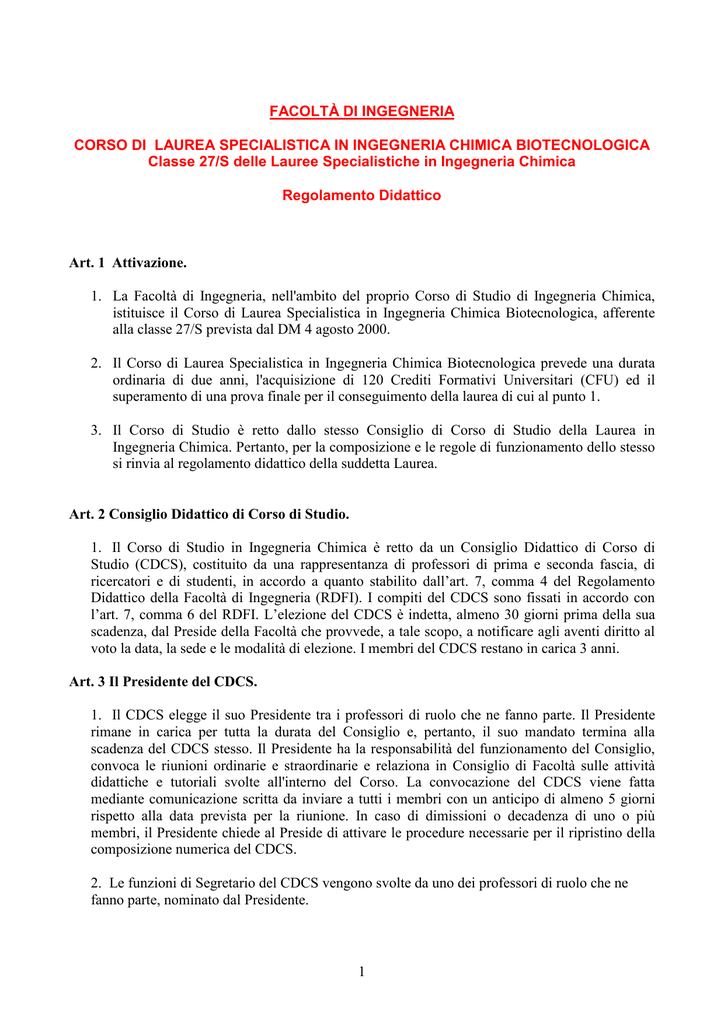 FACOLTÀ DI INGEGNERIA CORSO DI LAUREA SPECIALISTICA IN INGEGNERIA CHIMICA BIOTECNOLOGICA Classe 27/S delle Lauree Specialistiche in Ingegneria Chimica Regolamento Didattico Art. 1 Attivazione. 1. La Facoltà di Ingegneria, nell'ambito del proprio Corso di Studio di Ingegneria Chimica, istituisce il Corso di Laurea Specialistica in Ingegneria Chimica Biotecnologica, afferente alla classe 27/S prevista dal DM 4 agosto 2000. 2. Il Corso di Laurea Specialistica in Ingegneria Chimica Biotecnologica prevede una durata ordinaria di due anni, l'acquisizione di 120 Crediti Formativi Universitari (CFU) ed il superamento di una prova finale per il conseguimento della laurea di cui al punto 1. 3. Il Corso di Studio è retto dallo stesso Consiglio di Corso di Studio della Laurea in Ingegneria Chimica. Pertanto, per la composizione e le regole di funzionamento dello stesso si rinvia al regolamento didattico della suddetta Laurea. Art. 2 Consiglio Didattico di Corso di Studio. 1. Il Corso di Studio in Ingegneria Chimica è retto da un Consiglio Didattico di Corso di Studio (CDCS), costituito da una rappresentanza di professori di prima e seconda fascia, di ricercatori e di studenti, in accordo a quanto stabilito dall’art. 7, comma 4 del Regolamento Didattico della Facoltà di Ingegneria (RDFI). I compiti del CDCS sono fissati in accordo con l’art. 7, comma 6 del RDFI. L’elezione del CDCS è indetta, almeno 30 giorni prima della sua scadenza, dal Preside della Facoltà che provvede, a tale scopo, a notificare agli aventi diritto al voto la data, la sede e le modalità di elezione. I membri del CDCS restano in carica 3 anni. Art. 3 Il Presidente del CDCS. 1. Il CDCS elegge il suo Presidente tra i professori di ruolo che ne fanno parte. Il Presidente rimane in carica per tutta la durata del Consiglio e, pertanto, il suo mandato termina alla scadenza del CDCS stesso. Il Presidente ha la responsabilità del funzionamento del Consiglio, convoca le riunioni ordinarie e straordinarie e relaziona in Consiglio di Facoltà sulle attività didattiche e tutoriali svolte all'interno del Corso. La convocazione del CDCS viene fatta mediante comunicazione scritta da inviare a tutti i membri con un anticipo di almeno 5 giorni rispetto alla data prevista per la riunione. In caso di dimissioni o decadenza di uno o più membri, il Presidente chiede al Preside di attivare le procedure necessarie per il ripristino della composizione numerica del CDCS. 2. Le funzioni di Segretario del CDCS vengono svolte da uno dei professori di ruolo che ne fanno parte, nominato dal Presidente. 1 Art. 4 Profilo formativo. 1. Per ottenere la Laurea Specialistica in Ingegneria Chimica Biotecnologica è necessario dimostrare: • di conoscere approfonditamente agli aspetti teorico-scientifici della matematica, della fisica, della biochimica e delle altre scienze di base; • di saper applicare tali conoscenze per interpretare e descrivere quantitativamente i fenomeni fisici e biochimici, anche quando tali fenomeni e/o processi siano caratterizzati da particolare complessità e/o richiedano un approccio interdisciplinare; • di conoscere approfonditamente, in aggiunta agli aspetti metodologici ed operativi, anche quelli teorico-scientifici delle discipline tipiche dell’Ingegneria, dell’Ingegneria Industriale e dell’Ingegneria Chimica Biotecnologia in particolare; • di saper applicare tali conoscenze per progettare e gestire esperimenti e programmi sperimentali anche quando sia necessario utilizzare apparecchiature sofisticate e/o operare in contesti caratterizzati da un elevato livello di multi-disciplinarietà, nonché per interpretare ed analizzare i risultati ottenuti con adeguate e moderne tecniche di regressione, di modellizzazione e di simulazione; • di saper identificare, formulare e risolvere, anche in modo non tradizionale, le problematiche tipiche dell’Ingegneria Industriale e dell’Ingegneria Chimica Biotecnologia in particolare, con specifico riferimento all’innovazione e sviluppo di bioprocessi e bioprodotti inclusa la simulazione dei processi chimici e biotecnologici, l'analisi di processo e la fattibilità tecnica ed economica, la progettazione di apparecchiature specifiche e di impianti, la definizione dei criteri di scale-up, l’avviamento, la conduzione ed il controllo automatico di impianti industriali. 2. L’acquisizione delle conoscenze previste nel profilo formativo avviene mediante attività organizzate dal CDCS: lezioni, esercitazioni, attività di laboratorio, seminari, visite tecniche, tirocini. L’impegno temporale previsto per tali attività copre circa il 50% dell’impegno orario complessivo richiesto agli studenti. Art. 5 Ammissione al Corso di Laurea, Attività formative e riconoscimento dei Crediti Formativi. 1. Per essere ammessi al Corso di Laurea Specialistica in Ingegneria Chimica Biotecnologica, si richiede il possesso della Laurea in Ingegneria Chimica o di un’altra Laurea della Facoltà di Ingegneria o di altra Facoltà oppure di altro titolo di studio, conseguito in Italia o all’estero, riconosciuto idoneo ai sensi della normativa vigente, del Regolamento Didattico di Ateneo e del RDFI. Per i Laureati in Ingegneria Chimica, l’ammissione al Corso di Laurea Specialistica in Ingegneria Chimica Biotecnologica avviene senza alcun debito formativo. Per tutti gli altri l’ammissione è subordinata dall’aver acquisito almeno 120 CFU riconosciuti come validi dal CDCS ed attribuiti allo studente dalla Facoltà. 2. L’Ordinamento Didattico degli studi per il conseguimento della Laurea Specialistica in Ingegneria Chimica Biotecnologia è quello riportato nel sito www.offertaformativa.miur.it (Allegato A); l’annuale Manifesto degli Studi che recepisce l’Offerta Formativa si articola in: Attività formative di base (60 CFU) articolate nell’ambito delle discipline matematiche, chimiche e fisiche. Attività caratterizzanti (120 CFU) articolate nell’ambito delle discipline dell