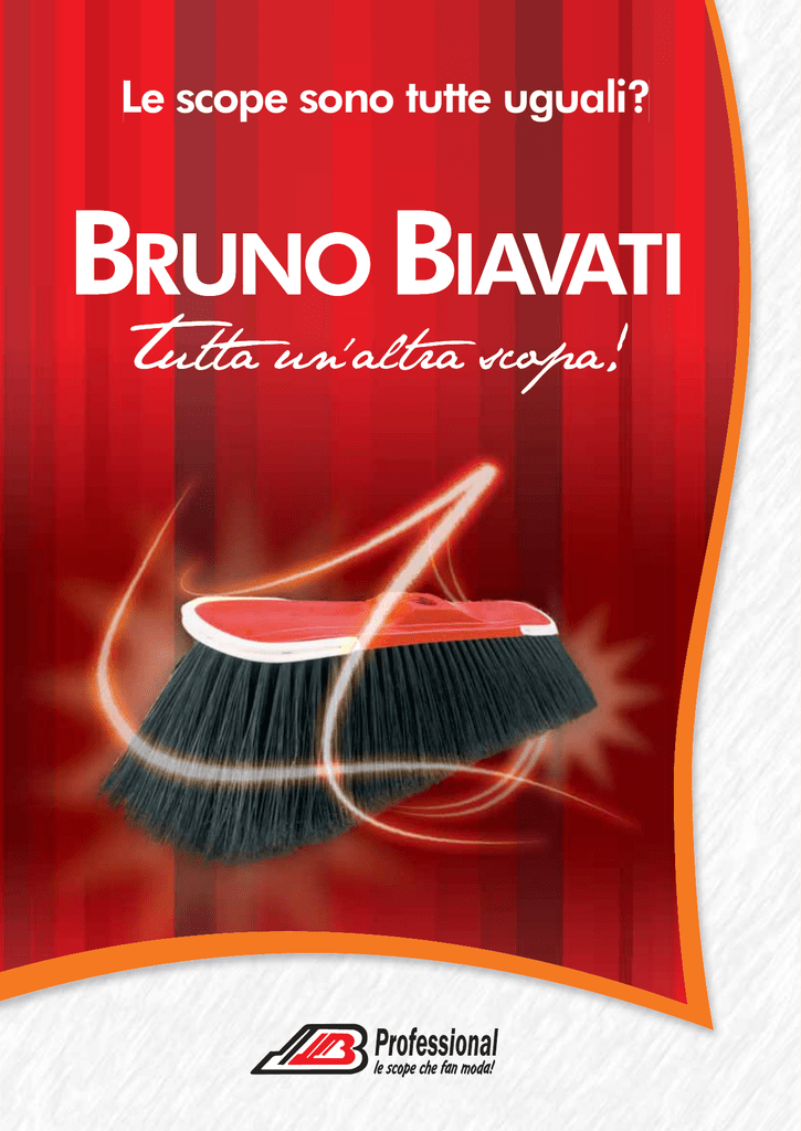 Le scope sono tutte uguali? BRUNO BIAVATI BRUNO BIAVATI produce scope ed accessori dal 1950. Vantiamo un’esperienza ed una serietà impareggiabili nel settore. Produciamo in uno stabilimento di oltre 2000 mq, all’interno del quale si svolge l’intero processo produttivo: siamo e vogliamo continuare ad essere produttori Made in Italy. Utilizziamo materiali ad altissima resistenza e setole difficilmente deformabili per garantire la massima e più duratura funzionalità. Tali materie prime provengono da produttori italiani certificati e qualificati che collaborano con noi da sempre. Siamo attrezzati con macchinari moderni e personale altamente qualificato e il processo produttivo si svolge sotto il diretto controllo dell’occhio esperto della proprietà. I nostri modelli sono progettati con caratteristiche altamente funzionali, che ci contraddistinguono e che in tanti tentano invano di imitare. I processi produttivi sono svolti in un’ottica di eco-sostenibilità, cioè con la massima attenzione a causare il minimo impatto ambientale possibile. BRUNO BIAVATI COMPANY BRUNO BIAVATI Company has been producing brooms and related accessories since 1950. We are proud to have extensive experience and we are considered to be the best in business. Our factory is 2000 sq. meters and our entire product and assembly is in our facility in Italy. All materials and end products produced by us are 100% Made in Italy. The materials we use in our production are the highest quality and the bristles we use never lose the shape or stiffness and are long lasting. Our suppliers and raw materials are also certified to be 100% from Italy. We have modern equipment and our employees are highly qualified. We are a family owned business and oversee all production personally. Our various models are unsurpassed in quality, shape and design to any competitive brand. Our process is environmentally safe. 3 INDICE Le scope di Biavati Linea “Special” Pag. 6 Le scope di Biavati Linea “150” Pag. 10 Le scope di Biavati Linea “200” Pag. 11 Le scope di Biavati Linea “Professional” Pag. 13 Le scope di Biavati Linea “Felix” Pag. 14 Le scope di Biavati Linea “Hygiene” Pag. 15 Le scope di Biavati Linea “Vere Setole Naturali” Pag. 16 Le scope di Biavati Linea “Pavel & Export” Pag. 18 Le scope di Biavati Linea “Industrial” Pag. 20 Le scope di Biavati Linea “Accessori” Pag. 22 Le scope di Biavati Linea “Mop & Cotone” Pag. 24 Le scope di Biavati Linea “Manici Metallo” Pag. 25 Le scope di Biavati Linea “Manici Legno” Pag. 26 Pag. 27 Le scope son tutte uguali UNA VERA RIVOLUZIONE Special massima lunghezza della superficie utile a pulire, col minimo ingombro dell’assicella rigida! PREZIOSA LA SCOPA CAPRICCIOSA 775 ART. 775/775A Conosciuta ed apprezzata come la migliore alleata per raggiungere la polvere in ogni angolo senza mai urtare contro mobili o porte grazie alle sue setole laterali estremamente inclinate. La sua ampia superficie pulente, permette di pulire velocemente ogni luogo. Supporto: polipropilene mm 265x46 Superficie utile a pulire: mm 415 Sbalzo laterale alle teste fra assicella e setole: mm 75 Fibra in monofilo sintetico mm 80/115 VANTA MOLTE IMITAZIONI ma resta unica ed impareggiabile da oltre 20 anni! Due to the combination of a compact board size with a wide cleaning surface, Preziosa deftly reaches the narrowest corners without bumping against furniture or doors. It’s the best solution to clean quickly every place. Board: polypropylene mm 265x46 Cleaning surface: mm 415 Overhang between board and lateral bristles: mm 75 Fibre: synthetic monofilaments mm 80/115 Singolarmente confezionata con fascetta in cartone Singly packed with carton bag. 6 Pz. x12 43x40x27 cm 5,2 Kg 775A Pz. x6 43x40x14 cm 2,6 Kg Dopo 20 anni di brillanti successi Preziosa la Scopa Capricciosa, vi presenta: Preziosa Slim, ancora più agile ed efficiente PREZIOSA PREZIOSA SLIM FORTE ART. 785 ART. 786 PREZIOSA SLIM Pz. x12 PREZIOSA SLIM FORTE Mantiene la caratteristica vincente di Preziosa e cioè l’ampia inclinazione delle setole laterali, ma in versione più snella. Il risultato è sorprendente: una scopa agile e veloce, che vola sui pavimenti e raggiunge lo sporco ovunque! Supporto: polipropilene mm 228X39 Superficie utile a pulire: mm 380 Sbalzo laterale alle teste fra assicella e setole: mm 76 Fibra in monofilo sintetico mm 75/105 This is the Slim version of Preziosa and It renews Preziosa winning features. Due to the long side 39x32x26 cm bristles it cleans also the narrowest corner with a surprising result! Board: polypropylene mm 228X39 3,8 Kg Cleaning surface: mm 380 Overhang between board and lateral bristles: mm 76 Fibre: synthetic monofilaments mm 75/105 Art./ Item 786 Preziosa Slim Forte con setole rigide per esterni / Stiff bristles for outdoors and industrial surfaces Singolarmente confezionata con fascetta in cartone / Singly packed with carton bag. 7 Special SLIM Special SICURA Pz. ART. 777/778/779 x12 FINALMENTE RISOLTO L’ETERNO PROBLEMA DEL MANICO: avvitando la boccola nera di sicurezza, si blocca saldamente il manico alla scopa, evitando noiosi inconvenienti durante l’uso. Risultato: tanta comodità e sicurezza in più! Supporto: polipropilene mm 285x50 Fibra: monofilo sintetico mm 80 Singolarmente confezionata con fascetta in cartone THIS BROOM SOLVES THE OLD PROBLEM CAUSED BY THE HANDLE thanks to a special device placed in the upper part of the broom, you can lock the handle steadily to the broom by screwing down a black safety-bush. Thus avoiding any trouble that may arise during the use! Board: polypropylene mm 285x50 Fibre: synthetic monofilaments mm 80 Singly packed with carton bag Art. 777 - Sicura Casa setole morbide Art. 778 - Sicura Polix setole ultra morbide Art. 779 - Sicura Forte setole rigide Item 777 - Sicura Casa medium fibres Item 778 - Sicura Polix extra smart fibres Item 779 - Sicura Forte stiff fibres 46x38x30 cm 5,1 Kg LEGGERA Pz. ART. 784 Fibre m