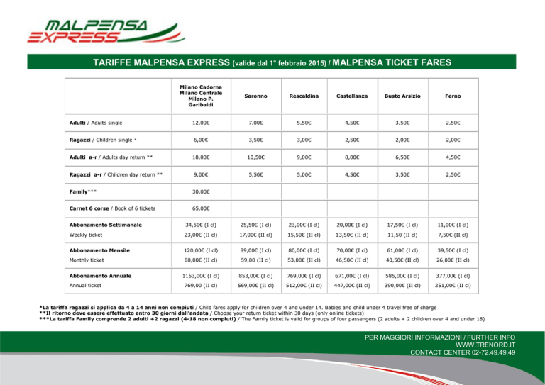TARIFFE MALPENSA EXPRESS (valide dal 1° febbraio 2015) / MALPENSA TICKET FARES Adulti / Adults single Ragazzi / Children single * Adulti a-r / Adults day return ** Ragazzi a-r / Children day return ** Milano Cadorna Milano Centrale Milano P. Garibaldi Saronno Rescaldina Castellanza Busto Arsizio Ferno 12,00€ 7,00€ 5,50€ 4,50€ 3,50€ 2,50€ 6,00€ 3,50€ 3,00€ 2,50€ 2,00€ 2,00€ 18,00€ 10,50€ 9,00€ 8,00€ 6,50€ 4,50€ 9,00€ 5,50€ 5,00€ 4,50€ 3,50€ 2,50€ Family*** 30,00€ Carnet 6 corse / Book of 6 tickets 65,00€ Abbonamento Settimanale 34,50€ (I cl) 25,50€ (I cl) 23,00€ (I cl) 20,00€ (I cl) 17,50€ (I cl) 11,00€ (I cl) Weekly ticket 23,00€ (II cl) 17,00€ (II cl) 15,50€ (II cl) 13,50€ (II cl) 11,50 (II cl) 7,50€ (II cl) Abbonamento Mensile 120,00€ (I cl) 89,00€ (I cl) 80,00€ (I cl) 70,00€ (I cl) 61,00€ (I cl) 39,50€ (I cl) Monthly ticket 80,00€ (II cl) 59,00 (II cl) 53,00€ (II cl) 46,50€ (II cl) 40,50€ (II cl) 26,00€ (II cl) 1153,00€ (I cl) 853,00€ (I cl) 769,00€ (I cl) 671,00€ (I cl) 585,00€ (I cl) 377,00€ (I cl) 769,00 (II cl) 569,00€ (II cl) 512,00€ (II cl) 447,00€ (II cl) 390,00€ (II cl) 251,00€ (II cl) Abbonamento Annuale Annual ticket *La tariffa ragazzi si applica da 4 a 14 anni non compiuti / Child fares apply for children over 4 and under 14. Babies and child under 4 travel free of charge **Il ritorno deve essere effettuato entro 30 giorni dall’andata / Choose your return ticket within 30 days (only online tickets) ***La tariffa Family comprende 2 adulti +2 ragazzi (4-18 non compiuti) / The Family ticket is valid for groups of four passengers (2 adults + 2 children over 4 and under 18) PER MAGGIORI INFORMAZIONI / FURTHER INFO WWW.TRENORD.IT CONTACT CENTER 02-72.49.49.49