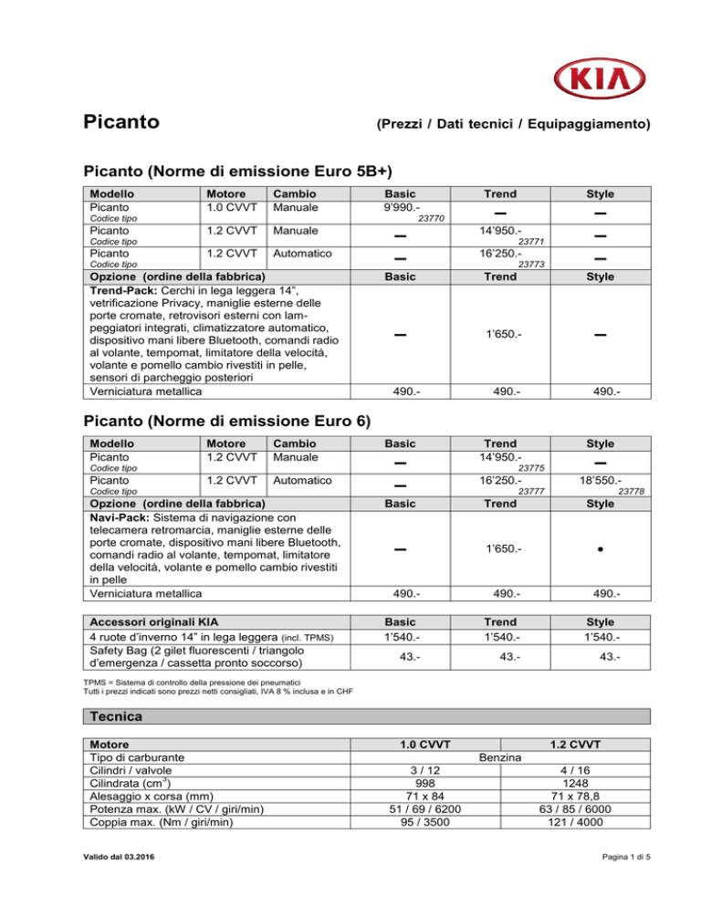 Picanto (Prezzi / Dati tecnici / Equipaggiamento) Picanto (Norme di emissione Euro 5B+) Modello Picanto Motore 1.0 CVVT Cambio Manuale Basic 9’990.- Codice tipo Picanto 23770 1.2 CVVT Manuale Codice tipo Picanto 1.2 CVVT Automatico Codice tipo Opzione (ordine della fabbrica) Trend-Pack: Cerchi in lega leggera 14”, vetrificazione Privacy, maniglie esterne delle porte cromate, retrovisori esterni con lampeggiatori integrati, climatizzatore automatico, dispositivo mani libere Bluetooth, comandi radio al volante, tempomat, limitatore della velocità, volante e pomello cambio rivestiti in pelle, sensori di parcheggio posteriori Verniciatura metallica Trend Style ▬ ▬ ▬ 14’950.- ▬ 16’250.- Basic Trend Style ▬ 1’650.- ▬ 490.- 23771 23773 490.- ▬ ▬ 490.- Picanto (Norme di emissione Euro 6) Modello Picanto Motore 1.2 CVVT Cambio Manuale ▬ Trend 14’950.- ▬ 16’250.- Opzione (ordine della fabbrica) Navi-Pack: Sistema di navigazione con telecamera retromarcia, maniglie esterne delle porte cromate, dispositivo mani libere Bluetooth, comandi radio al volante, tempomat, limitatore della velocità, volante e pomello cambio rivestiti in pelle Verniciatura metallica Basic Trend Style ▬ 1’650.- ● 490.- 490.- 490.- Accessori originali KIA 4 ruote d’inverno 14” in lega leggera (incl. TPMS) Safety Bag (2 gilet fluorescenti / triangolo d’emergenza / cassetta pronto soccorso) Basic 1’540.- Trend 1’540.- Style 1’540.- 43.- 43.- 43.- Codice tipo Picanto 1.2 CVVT Automatico Codice tipo Basic Style 23775 ▬ 18’550.- 23777 23778 TPMS = Sistema di controllo della pressione dei pneumatici Tutti i prezzi indicati sono prezzi netti consigliati, IVA 8 % inclusa e in CHF Tecnica Motore Tipo di carburante Cilindri / valvole 3 Cilindrata (cm ) Alesaggio x corsa (mm) Potenza max. (kW / CV / giri/min) Coppia max. (Nm / giri/min) Valido dal 03.2016 1.0 CVVT 1.2 CVVT Benzina 3 / 12 998 71 x 84 51 / 69 / 6200 95 / 3500 4 / 16 1248 71 x 78,8 63 / 85 / 6000 121 / 4000 Pagina 1 di 5 Trasmissione / Sospensioni Trasmissione Cambio Sospensione anteriore Sospensione posteriore Freni Sistema Sistema frenante antibloccaggio (ABS) Freni anteriori Freni posteriori Cerchi / Pneumatici Dimensioni cerchi Tipo di cerchi Dimensioni pneumatici 1.0 CVVT 1.2 CVVT Trazione anteriore Cambio manuale a 5 marce Cambio manuale a 5 marce / Cambio automatico a 4 rapporti McPherson, bracci triangolari, ammortizzatori a gas, sbarra stabilizzatrice Assale torcente con molle elicoidali, ammortizzatori a gas 1.0 CVVT 1.2 CVVT Impianto frenante a doppio circuito 4 canali, 4 sensori con EBD Freni a disco, Freni a disco, autoventilanti, Ø 241 mm autoventilanti, Ø 252 mm Freni a disco Ø 234 mm Basic 4,0J x 13“ Trend 5,0J x 14“ Consumo 80/1268/CEE Consumo misto / città / campagna (l/100km)* (Cambio automatico) 1.0 CVVT E5B+ 1.2 CVVT E5B+ 4,3 / 5,3 / 3,8 (5,3 / 6,7 / 4,5) 1.2 CVVT E6 4,6 / 5,9 / 3,8 (5,6 / 7,3 / 4,6) Emissioni di CO2 (g/km) (cambio automatico) 95 100 (125) 106 (130) B B (D) C (F) Ruota di scorta Categoria di efficienza energetica A-G (Cambio automatico) Depurazione dei gas di scarico Capacità del serbatoio (l) Classe di emissioni Style 5,0J x 14“ Acciaio Lega leggera 155/70 R13 165/60 R14 165/60 R14 Tire mobility kit (sigillante per pneumatici e compressore) 4,1 / 5,0 / 3,6 Catalizzatore regolato 35 Euro 5B+ Euro 6 Valore medio di CO2 di tutti i modelli di veicoli offerti in Svizzera: 139 g/km. * I dati indicati nei nostri prospetti si basano sul ciclo europeo di consumo normalizzato che ha come obiettivo quello di permettere il paragone tra le vetture. Nell’uso quotidiano i consumi possono variare sensibilmente in funzione dello stile di guida, del carico, della topografia e della stagione. Noi raccomandiamo sempre un tipo di guida rispettoso dell’ambiente. Prestazioni Velocità massima (km/h) (Cambio automatico) Accelerazione 0–100 km/h (sec) (Cambio automatico) 1.0 CVVT E5B+ 153 1.2 CVVT E5B+ 171 (163) 1.2 CVVT E6 175 (163) 14,4 11,4 (13,4) 11,2 (13,4) Dimensioni / Pesi Porte / posti Lunghezza / larghezza / altezza (mm) Passo (mm) Carreggiata anteriore / posteriore (mm) Diametro di sterzata (m) Volume del vano di carico VDA (l) Peso a vuoto incl. conducente (kg)** (Cambio automatico) Peso totale ammesso (kg) (Cambio automatico) Peso assale anteriore / posteriore (kg) Carico sul tetto (kg) 1.0 CVVT E5B+ 1.2 CVVT E5B+ 1.2 CVVT E6 5/5 3595 / 1595 / 1480 2385 1421 / 1424 1415 / 1418 9,8 200 – 870 930 – 1030 940 – 1076 930 - 1039 (950 – 1035) (960 – 1069) 1400 1430 (1431) 1430 (1431) 740 / 720 740 / 720 60 **Il peso a vuoto (peso a vuoto massimo) viene utilizzato per determinare la categoria di efficienza energetica. Il valore effettivo può variare a seconda dell’equipaggiamento. Valido dal 03.2016 Pagina 2 di 5 Equipaggiamento Sicurezza Airbag conducente e passeggero anteriore, airbag laterali anteriore, airbags per la testa anteriore e posteriore (a tendina) Airbag passeggero disattivabile Cinture di sicurezza con pretensionatori e limitatori di carico anteriore Cinture di sicurezza a 3 punti su tutti i sedili Fissaggio ISOFIX per seggiolino dei bambini posteriore Cinture di sicurezze regolabili in altezza anteriore Poggiatesta attivi anteriore Freni con sistema frenante antibloccaggio (ABS) con ripartitore elettronico della forza frenante (EBD) Controllo elettronico della stabilità (ESC) Assistente antiarretramento in salita (HAC) / assistente stabilità veicolo (VSM) Sistema di controllo della pressione dei pneumatici (TPMS) Immobilizzatore elettronico Impianto d’allarme Fari fendinebbia anteriore Illuminazione diurna Illuminazione diurna LED Sensore luce Sensori di parcheggio posteriori E5B+ Sensori di parcheggio posteriori E6 Equipaggiamento esterno Calandra (A Type), con bordature in argento Calandra (A Type), con bordature in cromo Paraurti, retrovisori esterni e maniglie esterne delle porte in colore nero Paraurti, retrovisori esterni e maniglie esterne dell