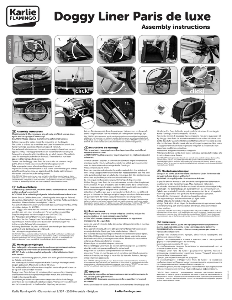 Doggy Liner Paris de luxe Assembly instructions Art.No. 1030655 1. 2. 4. 3. 6. 8. click! 5. click! 7. 9. 12. EN 11. Assembly instructions Most important: Check screws, also already prefitted screws, once again and do up tight if necessary! CAUTION! Please observe the following safety instructions: Before you use the trailer check the mounting on the bicycle. The trailer is only to be assembled and used in accordance with the Karlie Flamingo assembly. Maximum speed: 15 km/h. For technical safety reasons the maximum weight should not exceed approx. 50 kg. The Doggy Liner Paris de luxe trailer should only be fastened to a bicycle which is ridden by an adult person. The vehicle used for towing must be fit for the road. The trailer has not been approved for transporting persons. Do not use the Doggy Liner Paris de luxe trailer on uneven, rough paths. Do not make any constructional changes yourself. Take appropriate care when travelling around bends. Important: Always remember that due to the towed trailer your brakes act differently when they are applied and the brake path is longer. Moreover, the load must be safeguarded. With TEFLON® fabric protector are your pet fabrics durably protected against stains and dirt on water-oil-basis with the Tefl on fabric protection and without affecting the smooth handle. The product looks newer for a longer time. Suitable for outdoor use. TEFLON® is a brand by DuPont and used by KARLIE Heimtierbedarf GmbH. Aufbauanleitung Ganz wichtig : Schrauben, auch die bereits vormontierten, nochmals prüfen und ggfs. anziehen! ACHTUNG! Bitte unbedingt folgende Sicherheitshinweise beachten: Bevor Sie das Gefährt benutzen, unbedingt die Montage am Fahrrad überprüfen. Das Gefährt nur nach der Karlie Flamingo Aufbauanleitung betreiben. Maximale Geschwindigkeit 15 km/h. Aus sicherheitstechnischen Gründen soll das Maximalgewicht ca. 50 kg nicht übersteigen (lt. StVZTO). Der Doggy Liner Paris de luxe sollte nur an einem Fahrrad befestigt werden, das von einer erwachsenen Person gefahren wird. Das Zugfahrzeug muss verkehrstauglich sein (§67 StVZO9). Der Anhänger ist nicht für Personen zugelassen. Betreiben Sie den Doggy Liner Paris de luxe nicht auf unebenen, holprigen Wegen. Nehmen Sie keine baulichen Veränderungen vor. In Kurven das Fahrverhalten anpassen. Achtung: Bedenken Sie, dass sich durch den Anhänger das Bremsen verändert und der Bremsweg verlängert. Die Ladung muss gesichert sein. Mit TEFLON® fabric protector ist Ihre Tiertextilie dauerhaft vor Flecken und Schmutz auf Wasser- und Ölbasis geschützt, ohne den weichen Griff zu beeinträchtigen. Das Produkt sieht länger wie neu aus. Outdoor geeignet. TEFLON® ist eine Marke von DuPont, die unter Lizenz von KARLIE Heimtierbedarf GmbH genutzt wird. Montageaanwijzingen Zeer belangrijk: schroeven, ook de reeds voorgemonteerde schroeven, nogmaals controleren en eventueel vastdraaien! LET OP! A.u.b. in ieder geval de volgende veiligheidsinstructies in acht nemen: Voordat u het voertuig gebruikt, dient u in ieder geval de montage aan de fiets te controleren. Het voertuig uitsluitend volgens de Karlie Flamingo montageaanwijzingen gebruiken. Maximale snelheid 15 km/u. Om veiligheidstechnische redenen mag het maximale gewicht van ca. 50 kg niet overschreden worden. Doggy Liner Paris de luxe bij voorkeur alleen aan een fiets bevestigen, die door een volwassen persoon gereden wordt. Het trekvoertuig moet verkeerswaardig zijn. De aanhanger is niet voor personen toegelaten. Gebruik de Doggy Liner Paris de luxe niet op hobbelige wegen. Voer geen veranderingen aan de bouwwijze uit. In bochten het rijgedrag aanpassen. Let op: Denk eraan dat door de aanhanger het remmen en de remafstand langer worden / of veranderen; de lading moet beveiligd zijn. Met TEFLON® fabric protector wordt uw dierentextiel voortdurend beschermd tegen vlekken en vuil op water- en oliebasis, zonder dat het zachte gevoel wordt beïnvloed. Het product ziet er langer als nieuw uit. Geschikt voor buiten. TEFLON® is een merk van DuPont, dat onder licentie van KARLIE Heimtierbedarf GmbH wordt gebruikt. Instructions de montage Très important: visser également les vis prémontées, contrôler et resserrer si nécessaire! ATTENTION! Veuillez respecter impérativement les règles de sécurité suivantes: Avant d’utiliser l’appareil, il convient de contrôler impérativement le montage sur le vélo. Le véhicule ne doit être utilisé qu’en conformité avec les instructions de montage Karlie Flamingo. Vitesse maximale: 15 km/h. Pour des questions de sécurité, le poids maximal doit être inférieur à env. 50 kg. Doggy Liner Paris de luxe doit nécessairement être fixé à un vélo qui est conduit par un adulte. La remorque doit être conforme aux directives applicables pour la conduite de véhicules. La remorque n’est pas conçue pour le transport de personnes. Utiliser Doggy Liner Paris de luxe uniquement sur des chemins plats et non cahoteux. Ne pas procécer à des modifications de la construction. Ne se trouve pas sur des pistes cyclables. Faire particulièrement attention dans les virages et adapter votre conduite. Attention: n’oubliez pas que le comportement des freins est différent et que la distance de freinage est plus longue en raison de la remorque et qu’il convient de veiller à assurer la sécurité du chargement. TEFLON® fabric protector donne une protection durable à vos textiles d’animal contre taches et salissures sur base d’eau ou d’huile qui n’altèrent pas du tout le sens souple. Le produit a plus de temps l’air d’être nouveau. Approprié pour l’extérieur. TEFLON® est une marque de DuPont que KARLIE Heimtierbedarf GmbH utilise sous licence. Instrucciones Muy importante: ¡Volver a revisar todos los tornillos, incluso los premontados, y en caso necesario apretarlos! ATENCIÓN! Sírvase observar obligatoriamente las siguientes indicaciones de seguridad: Antes de usar el vehículo debe Vd. revisar obl