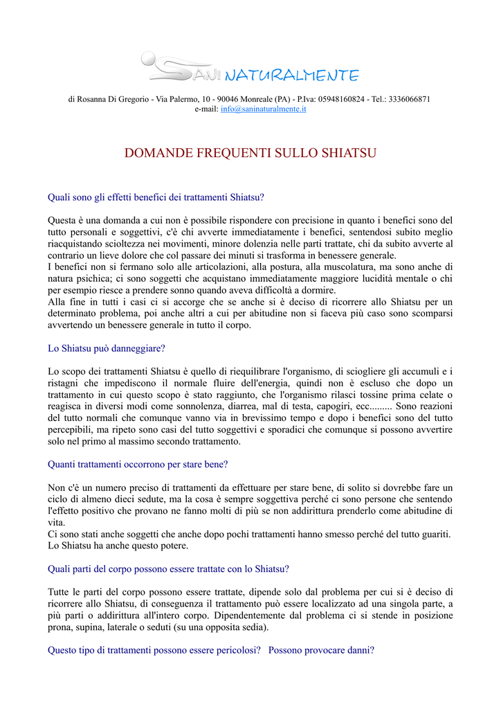 di Rosanna Di Gregorio - Via Palermo, 10 - 90046 Monreale (PA) - P.Iva: 05948160824 - Tel.: 3336066871 e-mail: [email protected] DOMANDE FREQUENTI SULLO SHIATSU Quali sono gli effetti benefici dei trattamenti Shiatsu? Questa è una domanda a cui non è possibile rispondere con precisione in quanto i benefici sono del tutto personali e soggettivi, c'è chi avverte immediatamente i benefici, sentendosi subito meglio riacquistando scioltezza nei movimenti, minore dolenzia nelle parti trattate, chi da subito avverte al contrario un lieve dolore che col passare dei minuti si trasforma in benessere generale. I benefici non si fermano solo alle articolazioni, alla postura, alla muscolatura, ma sono anche di natura psichica; ci sono soggetti che acquistano immediatamente maggiore lucidità mentale o chi per esempio riesce a prendere sonno quando aveva difficoltà a dormire. Alla fine in tutti i casi ci si accorge che se anche si è deciso di ricorrere allo Shiatsu per un determinato problema, poi anche altri a cui per abitudine non si faceva più caso sono scomparsi avvertendo un benessere generale in tutto il corpo. Lo Shiatsu può danneggiare? Lo scopo dei trattamenti Shiatsu è quello di riequilibrare l'organismo, di sciogliere gli accumuli e i ristagni che impediscono il normale fluire dell'energia, quindi non è escluso che dopo un trattamento in cui questo scopo è stato raggiunto, che l'organismo rilasci tossine prima celate o reagisca in diversi modi come sonnolenza, diarrea, mal di testa, capogiri, ecc......... Sono reazioni del tutto normali che comunque vanno via in brevissimo tempo e dopo i benefici sono del tutto percepibili, ma ripeto sono casi del tutto soggettivi e sporadici che comunque si possono avvertire solo nel primo al massimo secondo trattamento. Quanti trattamenti occorrono per stare bene? Non c'è un numero preciso di trattamenti da effettuare per stare bene, di solito si dovrebbe fare un ciclo di almeno dieci sedute, ma la cosa è sempre soggettiva perché ci sono persone che sentendo l'effetto positivo che provano ne fanno molti di più se non addirittura prenderlo come abitudine di vita. Ci sono stati anche soggetti che anche dopo pochi trattamenti hanno smesso perché del tutto guariti. Lo Shiatsu ha anche questo potere. Quali parti del corpo possono essere trattate con lo Shiatsu? Tutte le parti del corpo possono essere trattate, dipende solo dal problema per cui si è deciso di ricorrere allo Shiatsu, di conseguenza il trattamento può essere localizzato ad una singola parte, a più parti o addirittura all'intero corpo. Dipendentemente dal problema ci si stende in posizione prona, supina, laterale o seduti (su una opposita sedia). Questo tipo di trattamenti possono essere pericolosi? Possono provocare danni? Assolutamente no, in quanto lo Shiatsu non prevede l'uso di mosse pericolose su punti delicati o addirittura che possono essere mortali come collo o spalla, questi punti vengono trattati naturalmente anche con pressioni profonde ma mai pericolose, lo Shiatsu è sempre sicuro. E' vero che i trattamenti Shiatsu sono dolorosi? Di certo chi pratica Shiatsu seriamente è una persona professionalmente preparata che sa quali punti stimolare, quanta forza esercitare sul punto anche in base alla corporatura del soggetto. Può capitare che inizialmente, trattando una zona con un dolore acuto, la pressione può risultare leggermente fastidiosa, ma più si va avanti col trattamento e più velocemente il dolore stesso e il leggero fastidio provato vengono meno grazie pure alla reazione del corpo stesso sotto la stimolazione. Se questo non dovesse capitare e quindi il trattamento risulterebbe fastidioso, lo Shiatsuka provvederà ad intervenire con i punti a distanza. Il trattamento Shiatsu molto spesso viene definito massaggio, ma al contrario di un massaggio tradizionale che ha solo funzione rilassante, il trattamento Shiatsu è allo stesso tempo curativo ed in linea di massima non provoca mai dolore, anzi stimola una sensazione molto piacevole e rilassante. Non è difficile che i soggetti riescano ad addormentarsi durante il trattamento. Dopo avere ricevuto trattamenti Shiatsu bisogna cambiare stile di vita? Lo Shiatsu è particolarmente indicato a persone stressate, quindi lo Shiatsuka potrà consigliare di cambiare determinate abitudini che ritenga possano influire negativamente sullo stato di salute o magari consigliare di alimentarsi in un determinato modo o di svolgere particolari esercizi fisici a casa. In ogni caso bisogna ricordare che l'operatore Shiatsu non è un medico quindi il suo compito è solo quello di consigliare non di prescrivere od obbligare a fare qualche cosa. Si può definire lo Shiatsu una sorta di medicina? Lo Shiatsu non è assolutamente una medicina come si intende in occidente, dove tutto è scientificamente esaminato attraverso apparecchiature elettromedicali, dove il paziente viene trattato per singole parti. Lo Shiatsu tratta l'uomo nel suo insieme, mente, corpo, anima. Lo Shiatsu a differenza della medicina tradizionale che entra in gioco quando un malessere è già in atto, ha una funzione preventiva in quanto, riorganizzando l'equilibrio energetico di una persona, arriva addirittura a prevenire l'insorgenza di malattie siano esse perniciose che interne. Naturalmente lo Shiatsuka non vieta ne sconsiglia la ricorrenza alla medicina tradizionale, egli infatti non si sostituisce al medico. C'è da dire altresì che dove qualche volta la scienza medica fallisce o si ferma, lo Shiatsu riesce a risolvere problemi di cui non si era venuti a capo, di certo non fa miracoli, quindi non si ha la presunzione di dire che possa guarire qualunque tipo di malattia. Anche gli anziani possono usufruire dei trattamenti Shiatsu? Assolutamente si, come ho avuto modo di spiegare in altre domande, le pressioni sempre che siano fatte da personale qualificato, sono sempre calibrate per il soggetto trattato, tenendo conto del suo stato di salute e fisico, anzi dir
