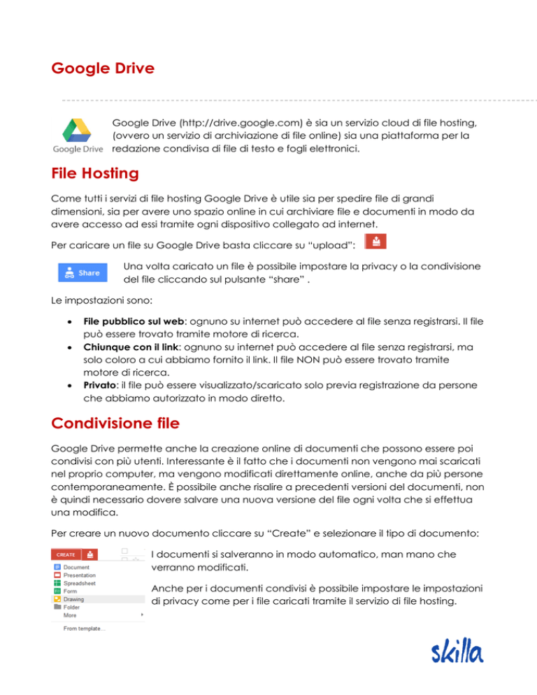 Google Drive Google Drive (http://drive.google.com) è sia un servizio cloud di file hosting, (ovvero un servizio di archiviazione di file online) sia una piattaforma per la redazione condivisa di file di testo e fogli elettronici. File Hosting Come tutti i servizi di file hosting Google Drive è utile sia per spedire file di grandi dimensioni, sia per avere uno spazio online in cui archiviare file e documenti in modo da avere accesso ad essi tramite ogni dispositivo collegato ad internet. Per caricare un file su Google Drive basta cliccare su “upload”: Una volta caricato un file è possibile impostare la privacy o la condivisione del file cliccando sul pulsante “share” . Le impostazioni sono: File pubblico sul web: ognuno su internet può accedere al file senza registrarsi. Il file può essere trovato tramite motore di ricerca. Chiunque con il link: ognuno su internet può accedere al file senza registrarsi, ma solo coloro a cui abbiamo fornito il link. Il file NON può essere trovato tramite motore di ricerca. Privato: il file può essere visualizzato/scaricato solo previa registrazione da persone che abbiamo autorizzato in modo diretto. Condivisione file Google Drive permette anche la creazione online di documenti che possono essere poi condivisi con più utenti. Interessante è il fatto che i documenti non vengono mai scaricati nel proprio computer, ma vengono modificati direttamente online, anche da più persone contemporaneamente. È possibile anche risalire a precedenti versioni del documenti, non è quindi necessario dovere salvare una nuova versione del file ogni volta che si effettua una modifica. Per creare un nuovo documento cliccare su “Create” e selezionare il tipo di documento: I documenti si salveranno in modo automatico, man mano che verranno modificati. Anche per i documenti condivisi è possibile impostare le impostazioni di privacy come per i file caricati tramite il servizio di file hosting.