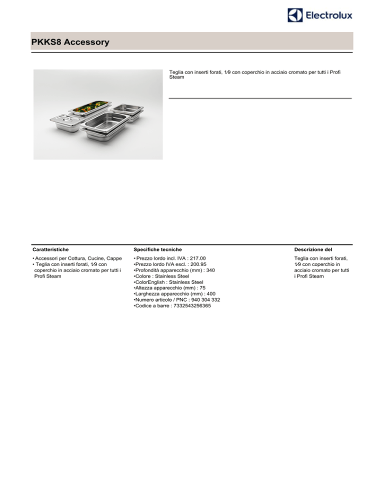 PKKS8 Accessory Teglia con inserti forati, 1∕9 con coperchio in acciaio cromato per tutti i Profi Steam Caratteristiche Specifiche tecniche Descrizione del • Accessori per Cottura, Cucine, Cappe • Teglia con inserti forati, 1∕9 con coperchio in acciaio cromato per tutti i Profi Steam • Prezzo lordo incl. IVA : 217.00 •Prezzo lordo IVA escl. : 200.95 •Profondità apparecchio (mm) : 340 •Colore : Stainless Steel •ColorEnglish : Stainless Steel •Altezza apparecchio (mm) : 75 •Larghezza apparecchio (mm) : 400 •Numero articolo / PNC : 940 304 332 •Codice a barre : 7332543256365 Teglia con inserti forati, 1∕9 con coperchio in acciaio cromato per tutti i Profi Steam