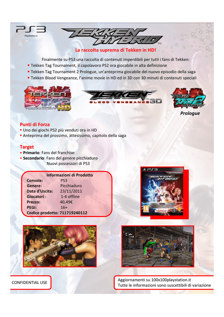 La raccolta suprema di Tekken in HD! Finalmente su PS3 una raccolta di contenuti imperdibili per tutti i fans di Tekken: • Tekken Tag Tournament, il capolavoro PS2 ora giocabile in alta definizione • Tekken Tag Tournament 2 Prologue, un’anteprima giocabile del nuovo episodio della saga • Tekken Blood Vengeance, l’anime movie in HD ed in 3D con 30 minuti di contenuti speciali Prologue Punti di Forza Uno dei giochi PS2 più venduti ora in HD Anteprima del prossimo, attesissimo, capitolo della saga Target • Primario: Fans del franchise Primario • Secondario: Fans del genere picchiaduro Secondario Nuovi possessori di PS3 Informazioni di Prodotto Console: PS3 Genere: Picchiaduro Data d'Uscita: 23/11/2011 Giocatori : 1‐4 offline Prezzo: 40,49€ PEGI: 16+ Codice prodotto: 711719240112 CONFIDENTIAL USE Aggiornamenti su 100x100playstation.it Tutte le informazioni sono suscettibili di variazione