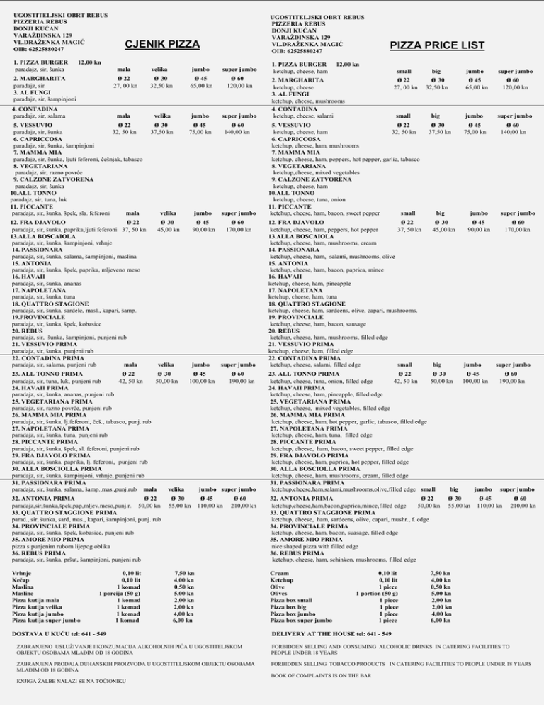 UGOSTITELJSKI OBRT REBUS PIZZERIA REBUS DONJI KUĆAN VARAŽDINSKA 129 VL.DRAŽENKA MAGIĆ OIB: 62525880247 1. PIZZA BURGER paradajz, sir, šunka UGOSTITELJSKI OBRT REBUS PIZZERIA REBUS DONJI KUĆAN VARAŽDINSKA 129 VL.DRAŽENKA MAGIĆ OIB: 62525880247 CJENIK PIZZA 12,00 kn 2. MARGHARITA paradajz, sir 3. AL FUNGI paradajz, sir, šampinjoni 4. CONTADINA paradajz, sir, salama mala velika jumbo ø 22 ø 30 ø 45 27, 00 kn 32,50 kn 65,00 kn 120,00 kn velika jumbo super jumbo ø 30 ø 45 ø 60 37,50 kn 75,00 kn 140,00 kn mala 5. VESSUVIO ø 22 paradajz, sir, šunka 32, 50 kn 6. CAPRICCOSA paradajz, sir, šunka, šampinjoni 7. MAMMA MIA paradajz, sir, šunka, ljuti feferoni, češnjak, tabasco 8. VEGETARIANA paradajz, sir, razno povrće 9. CALZONE ZATVORENA paradajz, sir, šunka 10.ALL TONNO paradajz, sir, tuna, luk 11. PICCANTE paradajz, sir, šunka, špek, sla. feferoni mala 12. FRA DJAVOLO ø 22 paradajz, sir, šunka, paprika,ljuti feferoni 37, 50 kn 13.ALLA BOSCAIOLA paradajz, sir, šunka, šampinjoni, vrhnje 14. PASSIONARA paradajz, sir, šunka, salama, šampinjoni, maslina 15. ANTONIA paradajz, sir, šunka, špek, paprika, mljeveno meso 16. HAVAII paradajz, sir, šunka, ananas 17. NAPOLETANA paradajz, sir, šunka, tuna 18. QUATTRO STAGIONE paradajz, sir, šunka, sardele, masl., kapari, šamp. 19.PROVINCIALE paradajz, sir, šunka, špek, kobasice 20. REBUS paradajz, sir, šunka, šampinjoni, punjeni rub 21. VESSUVIO PRIMA paradajz, sir, šunka, punjeni rub 22. CONTADINA PRIMA paradajz, sir, salama, punjeni rub mala super jumbo ø 60 velika jumbo super jumbo ø 30 ø 45 ø 60 45,00 kn 90,00 kn 170,00 kn velika jumbo super jumbo 1. PIZZA BURGER ketchup, cheese, ham PIZZA PRICE LIST 12,00 kn 2. MARGHARITA ketchup, cheese 3. AL FUNGI ketchup, cheese, mushrooms 4. CONTADINA ketchup, cheese, salami small big jumbo super jumbo ø 22 ø 30 ø 45 ø 60 120,00 kn 27, 00 kn small 5. VESSUVIO ø 22 ketchup, cheese, ham 32, 50 kn 6. CAPRICCOSA ketchup, cheese, ham, mushrooms 7. MAMMA MIA ketchup, cheese, ham, peppers, hot pepper, garlic, tabasco 8. VEGETARIANA ketchup,cheese, mixed vegetables 9. CALZONE ZATVORENA ketchup, cheese, ham 10.ALL TONNO ketchup, cheese, tuna, onion 11. PICCANTE ketchup, cheese, ham, bacon, sweet pepper small 12. FRA DJAVOLO ø 22 ketchup, cheese, ham, peppers, hot pepper 37, 50 kn 13.ALLA BOSCAIOLA ketchup, cheese, ham, mushrooms, cream 14. PASSIONARA ketchup, cheese, ham, salami, mushrooms, olive 15. ANTONIA ketchup, cheese, ham, bacon, paprica, mince 16. HAVAII ketchup, cheese, ham, pineapple 17. NAPOLETANA ketchup, cheese, ham, tuna 18. QUATTRO STAGIONE ketchup, cheese, ham, sardeens, olive, capari, mushrooms. 19. PROVINCIALE ketchup, cheese, ham, bacon, sausage 20. REBUS ketchup, cheese, ham, mushrooms, filled edge 21. VESSUVIO PRIMA ketchup, cheese, ham, filled edge 22. CONTADINA PRIMA ketchup, cheese, salami, filled edge small 32,50 kn 65,00 kn big ø 30 37,50 kn jumbo super jumbo ø 45 ø 60 140,00 kn 75,00 kn big jumbo super jumbo ø 30 ø 45 ø 60 170,00 kn 45,00 kn big 90,00 kn jumbo 23. ALL TONNO PRIMA ø 22 ø 30 ø 45 ø 60 paradajz, sir, tuna, luk, punjeni rub 42, 50 kn 50,00 kn 100,00 kn 190,00 kn 24. HAVAII PRIMA paradajz, sir, šunka, ananas, punjeni rub 25. VEGETARIANA PRIMA paradajz, sir, razno povrće, punjeni rub 26. MAMMA MIA PRIMA paradajz, sir, šunka, lj.feferoni, češ., tabasco, punj. rub 27. NAPOLETANA PRIMA paradajz, sir, šunka, tuna, punjeni rub 28. PICCANTE PRIMA paradajz, sir, šunka, špek, sl. feferoni, punjeni rub 29. FRA DJAVOLO PRIMA paradajz, sir, šunka. paprika, lj. feferoni, punjeni rub 30. ALLA BOSCIOLLA PRIMA paradajz, sir, šunka, šampinjoni, vrhnje, punjeni rub 31. PASSIONARA PRIMA paradajz, sir, šunka, salama, šamp.,mas.,punj.rub mala velika jumbo super jumbo 23. ALL TONNO PRIMA ø 22 ø 30 ø 45 ketchup, cheese, tuna, onion, filled edge 42, 50 kn 50,00 kn 100,00 kn 24. HAVAII PRIMA ketchup, cheese, ham, pineapple, filled edge 25. VEGETARIANA PRIMA ketchup, cheese, mixed vegetables, filled edge 26. MAMMA MIA PRIMA ketchup, cheese, ham, hot pepper, garlic, tabasco, filled edge 27. NAPOLETANA PRIMA ketchup, cheese, ham, tuna, filled edge 28. PICCANTE PRIMA ketchup, cheese, ham, bacon, sweet pepper, filled edge 29. FRA DJAVOLO PRIMA ketchup, cheese, ham, paprica, hot pepper, filled edge 30. ALLA BOSCIOLLA PRIMA ketchup, cheese, ham, mushrooms, cream, filled edge 31. PASSIONARA PRIMA ketchup,cheese,ham,salami,mushrooms,olive,filled edge small big jumbo 32. ANTONIA PRIMA ø 22 paradajz,sir,šunka,špek,pap,mljev.meso,punj.r. 50,00 kn 33. QUATTRO STAGGIONE PRIMA parad., sir, šunka, sard, mas., kapari, šampinjoni, punj. rub 34. PROVINCIALE PRIMA paradajz, sir, šunka, špek, kobasice, punjeni rub 35. AMORE MIO PRIMA pizza s punjenim rubom lijepog oblika 36. REBUS PRIMA paradajz, sir, šunka, pršut, šampinjoni, punjeni rub 32. ANTONIA PRIMA ø 22 ketchup,cheese,ham,bacon,paprica,mince,filled edge 50,00 kn 33. QUATTRO STAGGIONE PRIMA ketchup, cheese, ham, sardeens, olive, capari, mushr., f. edge 34. PROVINCIALE PRIMA ketchup, cheese, ham, bacon, suasage, filled edge 35. AMORE MIO PRIMA nice shaped pizza with filled edge 36. REBUS PRIMA ketchup, cheese, ham, schinken, mushrooms, filled edge Vrhnje Kečap Maslina Masline Pizza kutija mala Pizza kutija velika Pizza kutija jumbo Pizza kutija super jumbo 0,10 lit 0,10 lit 1 komad 1 porcija (50 g) 1 komad 1 komad 1 komad 1 komad ø 30 ø 45 55,00 kn 110,00 kn ø 60 210,00 kn 7,50 kn 4,00 kn 0,50 kn 5,00 kn 2,00 kn 2,00 kn 4,00 kn 6,00 kn DOSTAVA U KUĆU tel: 641 - 549 Cream Ketchup Olive Olives Pizza box small Pizza box big Pizza box jumbo Pizza box super jumbo 0,10 lit 0,10 lit 1 piece 1 portion (50 g) 1 piece 1 piece 1 piece 1 piece ø 30 55,00 kn super jumbo ø 60 190,00 kn super jumbo ø 45 110,00 kn ø 60 210,00 kn 7,50 kn 4,00 kn 0,50 kn 5,00 kn 2,00 kn 2,00 kn 4,00 kn 6,00 kn DELIVERY AT THE HOUSE tel: 641 - 549 ZABRANJENO USLUŽIVANJE I KONZUMACIJA ALKOHOLNIH PIĆA U UGOSTITELJSK