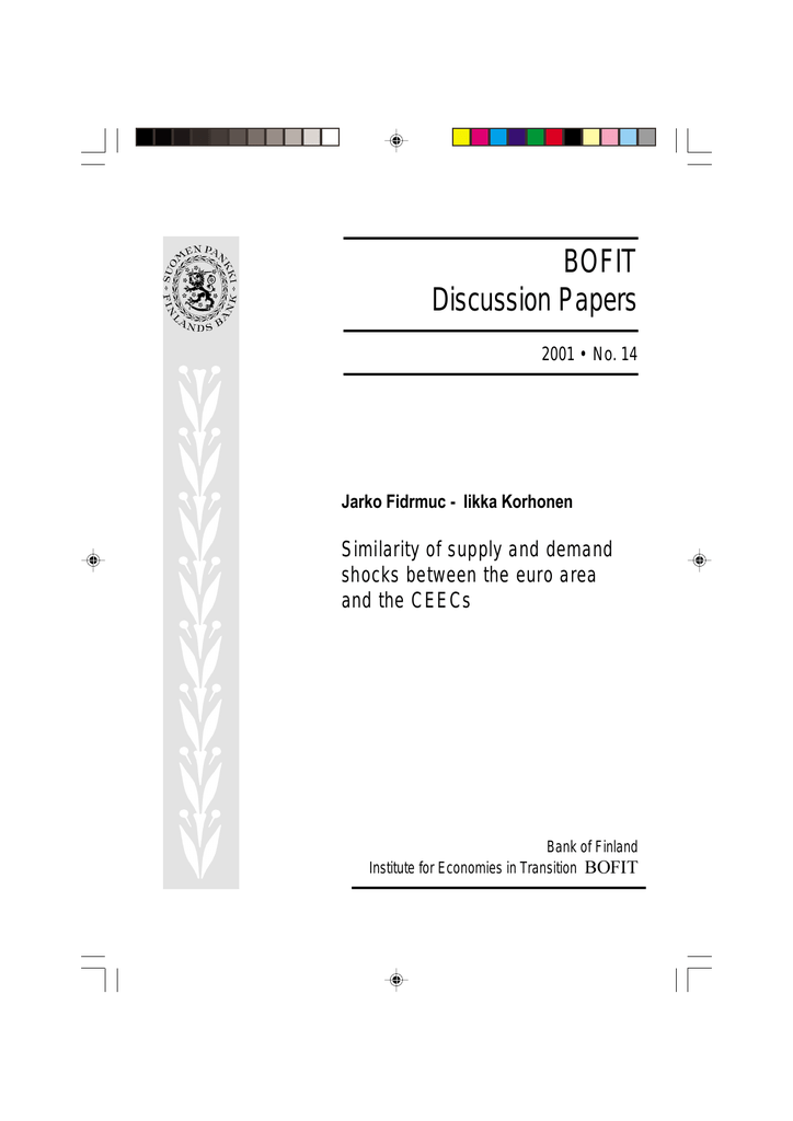 BOFIT Discussion Papers 2001 • No. 14 Jarko Fidrmuc - Iikka Korhonen Similarity of supply and demand shocks between the euro area and the CEECs Bank of Finland Institute for Economies in Transition BOFIT Bank of Finland Institute for Economies in Transition BOFIT Economists Information Services Mr Pekka Sutela, head Russian economy and economic policy Russia’s international economic relations Baltic economies Mr Timo Harell, senior clerk Press monitoring Mr Tuomas Komulainen, economist Russian financial system Currency crises Mr Iikka Korhonen, economist Baltic economies Russian financial system Ms Seija Lainela, economist Baltic economies EU policy and Eastern relations Russian economy and economic policy Ms Päivi Määttä, information specialist Institute’s library, information services Ms Liisa Mannila, department secretary Department coordinator, publication distribution Ms Tiina Saajasto, research secretary Statistical analysis, statistical data bases Ms Liisa Sipola, research secretary Information retrieval, Institute’s library and publications Publications Mr Juhani Laurila, senior adviser Russian economy and economic policy Baltic countries’ external relations Russian and Baltic Economies – The Week in Review A two-page weekly review of the previous week’s focal events in Russia and the Baltic states. Mr Jukka Pirttilä, research supervisor Public economics Transition economics Russian Economy – The Month in Review A four-page review with analysis of developments in Russia’s economy, fiscal policy and financial markets. Mr Jouko Rautava, economist Russian economy and economic policy Baltic Economies – The Quarter in Review A four-page review with analysis of recent economic developments in Estonia, Latvia and Lithuania. Mr Jian-Guang Shen, economist Chinese and East Asian economies Currency crises Ms Laura Solanko, economist Fiscal federalism Russian regional issues Ms Merja Tekoniemi, economist Russian economy and economic policy BOFIT Discussion Papers A series devoted to transition issues. Contains academic studies on transition economics by BOFIT economists and guest researchers. BOFIT Online An electronic publishing series devoted to transition issues. The focus is on descriptive work on economic policy and economic developments in transition economies. Papers are either in English or Finnish. Contact us Bank of Finland Institute for Economies in Transition (BOFIT) P.O. Box 160 FIN- 00101 Helsinki Phone: +358 9 183 2268 Fax: +358 9 183 2294 Email: [email protected] ([email protected] ! ä = a) Web: www.bof.fi/bofit BOFIT Discussion Papers 2001 • No. 14 Jarko Fidrmuc - Iikka Korhonen Similarity of supply and demand shocks between the euro area and the CEECs Bank of Finland Institute for Economies in Transition, BOFIT ISBN 951-686-810-X (print) ISSN 1456-4564 (print) ISBN 951-686-811-8 (online) ISSN 1456-5889 (online) Suomen Pankin monistuskeskus Helsinki 2001 Contents Abstract ............................................................................................... 1 1 Introduction .................................................................................. 2 2 The optimum currency area theory and the EMU enlargement ... 4 3 Aggregate demand and supply model ........................................ 11 4 Identification of supply and demand shocks ............................. 13 5 Empirical results ........................................................................ 15 5.1 Correlation of GDP and inflation ......................................... 15 5.2 Correlation of supply and demand shocks .......................... 18 6 Conclusions ................................................................................ 24 References ........................................................................................ 26 Data Appendix .................................................................................. 35 Jarko Fidrmuc, Iikka Korhonen All opinions expressed are those of the authors and do not necessarily reflect the views of the Bank of Finland. Institute for Economies in Transition 4 Vlplodulw| ri Vxsso| dqg Ghpdqg Vkrfnv Ehwzhhq wkh Hxur Duhd dqg wkh FHHFv Mdunr Ilgupxf Llnnd Nrukrqhq Rhvwhuuhlfklvfkh Qdwlrqdoedqn ERILW/ Edqn ri Ilqodqg mdunr1gupxfCNXOhxyhq1df1eh llnnd1nrukrqhqCeri1 Qryhpehu ;/ 5334 Devwudfw Zh dvvhvv wkh fruuhodwlrq ri vxsso| dqg ghpdqg vkrfnv ehwzhhq wkh frxqwulhv ri wkh hxur duhd dqg wkh dffhvvlrq frxqwulhv lq wkh 4<<3v1 Vkrfnv duh uhfryhuhg iurp hvwlpdwhg vwuxfwxudo YDU prghov ri rxw0 sxw jurzwk dqg lq dwlrq1 Zh qg wkdw vrph dffhvvlrq frxqwulhv kdyh d txlwh kljk fruuhodwlrq ri wkh xqghuo|lqj vkrfnv zlwk wkh hxur duhd1 Krzhyhu/ hyhq iru pdq| dgydqfhg dffhvvlrq frxqwulhv/ wkh vkrfnv uh0 pdlq vljqlfdqwo| pruh lglrv|qfudwlf1 Ixuwkhupruh/ pdq| HX frxq0 wulhv vhhp wr kdyh d pxfk kljkhu fruuhodwlrq zlwk wkh fruh hxur duhd frxqwulhv wkdq lq wkh suhylrxv ghfdghv1 Frqwlqxlqj lqwhjudwlrq zlwklq wkh HX vhhpv wr kdyh doljqhg wkh exvlqhvv f|fohv ri wkhvh frxqwulhv dv zhoo1 Nh|zrugv= rswlpxp fxuuhqf| duhd/ HPX/ HX hqodujhphqw/ vwuxfwxudo YDU1 MHO Fodvvlfdwlrq Qxpehuv= H65/ I751 Dfnqrzohgjhphqwv= Zh ehqhwhg iurp frpphqwv e| Pdwklogh Pdxuho/ Mxnnd Sluwwloç/ Shwhu Edfnì/ Mhvxv Fuhvsr0Fxduhvpd/ Mdnxe Erurzvnl/ Dorlv Jh|hu dqg Urehuw Nxqvw1 Zh dfnqrzohgjh odqjxdjh dgylfh e| Luhqh P kogrui1 Wkh ylhzv h{suhvvhg lq wklv sdshu duh wkrvh ri wkh dxwkruv dqg gr qrw qhfhvvdulo| uhsuhvhqw wkh srvlwlrq ri wkh Rhvwhuuhlfklvfkh Qdwlrqdoedqn ru ri wkh Edqn ri Ilqodqg1 4 Lqwurgxfwlrq Zh h{dplqh wkh fruuhodwlrq ri vxsso| dqg ghpdqg vkrfnv ehwzhhq wkh Fhqwudo dqg Hdvwhuq Hxursh frxqwulhv +FHHFv, dqg wkh hxur duhd1 Rxu sxusrvh lv wr dvvhvv zkhwkhu wkh dffhvvlrq frxqwulhv ehorqj wr wkh vdph rswlpxp fxuuhqf| duhd dv wkh fxuuhqw phpehuv ri wkh prqhwdu| xqlrq1 Dw wkh vdph wlph/ zh xvh gdwd iurp wkh sdvw ghfdgh wr dvvhvv wkh vlplodulw| ri wkh vkrfnv zlwklq wkh hxur duhd1 Wklv lv wkh uvw dwwhpsw wr dvvhvv wkh vlplodulw| ri vkrfnv ylv0ã0ylv wk