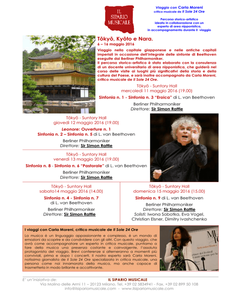 Viaggio con Carla Moreni critico musicale de Il Sole 24 Ore Percorso storico-artistico ideato in collaborazione con un esperto di area nipponistica, in accompagnamento durante il viaggio Tōkyō, Kyōto e Nara. 6 – 16 maggio 2016 Viaggio nella capitale giapponese e nelle antiche capitali imperiali in occasione dell’integrale delle sinfonie di Beethoven eseguite dai Berliner Philharmoniker. Il percorso storico-artistico è stato elaborato con la consulenza di un docente universitario di area nipponistica, che guiderà nel corso delle visite ai luoghi più significativi della storia e della cultura del Paese, e sarà inoltre accompagnato da Carla Moreni, critico musicale de Il Sole 24 Ore. Tōkyō - Suntory Hall mercoledì 11 maggio 2016 (19.00) Sinfonia n. 1 - Sinfonia n. 3 “Eroica” di L. van Beethoven Berliner Philharmoniker Direttore: Sir Simon Rattle Tōkyō - Suntory Hall giovedì 12 maggio 2016 (19.00) Leonore: Ouverture n. 1 Sinfonia n. 2 – Sinfonia n. 5 di L. van Beethoven Berliner Philharmoniker Direttore: Sir Simon Rattle Tōkyō - Suntory Hall venerdì 13 maggio 2016 (19.00) Sinfonia n. 8 - Sinfonia n. 6 “Pastorale” di L. van Beethoven Berliner Philharmoniker Direttore: Sir Simon Rattle Tōkyō - Suntory Hall sabato14 maggio 2016 (14.00) Tōkyō - Suntory Hall domenica 15 maggio 2016 (15.00) Sinfonia n. 4 - Sinfonia n. 7 di L. van Beethoven Sinfonia n. 9 di L. van Beethoven Berliner Philharmoniker Direttore: Sir Simon Rattle Berliner Philharmoniker Direttore: Sir Simon Rattle Solisti: Iwona Sobotka, Eva Vogel, Christian Elsner, Dimitry Ivashchenko I viaggi con Carla Moreni, critico musicale de Il Sole 24 Ore La musica è un linguaggio appassionante e complesso, è un mondo di emozioni da scoprire e da condividere con gli altri. Con questo viaggio, che avrà come accompagnatore un esperto in critica musicale, puntiamo a fare della musica una presenza costante e coinvolgente, l’assoluta protagonista del viaggio. Brevi conferenze si alterneranno a momenti più conviviali, prima e dopo i concerti. Il nostro esperto sarà Carla Moreni, notissima giornalista de Il Sole 24 Ore specializzata in critica musicale, una persona come noi innamorata della musica, ma anche capace di trasmetterla in modo brillante e accattivante. E’ un’iniziativa de: IL SIPARIO MUSICALE Via Molino delle Armi 11 – 20123 Milano. Tel. +39 02 5834941 - Fax. +39 02 899 50 108 [email protected] - www.ilsipariomusicale.com Viaggio con Carla Moreni critico musicale de Il Sole 24 Ore Percorso storico-artistico ideato in collaborazione con un esperto di area nipponistica, in accompagnamento durante il viaggio venerdì 6 maggio 2016 Arrivo individuale all’Aeroporto Internazionale di Ōsaka-Kansai (vedasi la nota sui voli in fondo all’offerta). Incontro con l’accompagnatore e trasferimento privato a Kyōto. Sistemazione presso il Royal Hotel the Kyoto****S (camera corner deluxe – è previsto l’Early check-in). Ore 18.00: ritrovo nella hall dell’hotel per una cena leggera a buffet in una sala riservata dell’hotel. Durante la cena, panoramica introduttiva alla cultura e all’arte giapponese a cura del docente di accompagnamento. Fondata nel 794, Kyōto è stata fino al 1868 capitale imperiale del Giappone; e anche se il moderno centro cittadino indurrebbe a ritenerla simile a molte altre città giapponesi, i percorsi nei distretti antichi ne celebrano il ruolo di depositaria della cultura nazionale. Nei secoli, prestigio culturale e forza economica furono il risultato dell’interazione di varie classi sociali e istituzioni: dalla corte imperiale, con la sua nobiltà civile, all’aristocrazia guerriera e ai grandi centri monastici del buddhismo zen, fino all’opulento ceto mercantile. Nel corso del periodo Tokugawa (1600 – 1867), il baricentro del potere politico ed economico si spostò a Edo (l’attuale Tōkyō), sede ufficiale del governo militare dello shōgun. Kyōto rimase tuttavia sede imperiale, fino all’apertura del Giappone ai rapporti politici ed economici con le potenze internazionali, inaugurata dalla metà del 1800. A seguire, visita serale al Santuario shintoista Fushimi Inari Taisha. Il Santuario Fushimi Inari Taisha è fra le sedi shintoiste più celebri tra quelle dedicate a Inari, la divinità del riso, il cui messaggero terreno è kitsune, la volpe. Collocato nella periferia sud di Kyōto, è immerso nel verde di una collina di 233 metri d’altezza. Dai padiglioni principali, posti alla base della collina, si snoda un percorso in salita, delimitato da gallerie di migliaia di torii rossi (portali sacri a forma di π); al tramonto, il sentiero viene illuminato da centinaia di lanterne che rendono la passeggiata davvero suggestiva. Dalla sommità della collina si gode di una vista unica sulla città, in special modo al calar del sole. Rientro in hotel e pernottamento. E’ un’iniziativa de: IL SIPARIO MUSICALE Via Molino delle Armi 11 – 20123 Milano. Tel. +39 02 5834941 - Fax. +39 02 899 50 108 [email protected] - www.ilsipariomusicale.com Viaggio con Carla Moreni critico musicale de Il Sole 24 Ore Percorso storico-artistico ideato in collaborazione con un esperto di area nipponistica, in accompagnamento durante il viaggio sabato 7 maggio 2016 Prima colazione in hotel e ritrovo con l’esperto culturale per l’escursione giornaliera a Nara. Fondata nel 710, Nara fu la prima capitale imperiale del Giappone e cuore del primo buddhismo giapponese. Colline alberate e templi immersi nei parchi conferiscono alla città un’atmosfera di rilassata tranquillità; tali aspetti, coniugati a siti architettonici di alto spessore artistico e culturale, hanno fatto sì che venisse titolata Patrimonio dell’Umanità dall’Unesco. Le principali attrazioni della città si trovano all’interno del Parco di Nara, in cui è possibile passeggiare tra cedri, querce secolari e circa 1200 esemplari tra daini e cervi, animali sacri alle divinità, lasciati liberi nella tenuta e a d