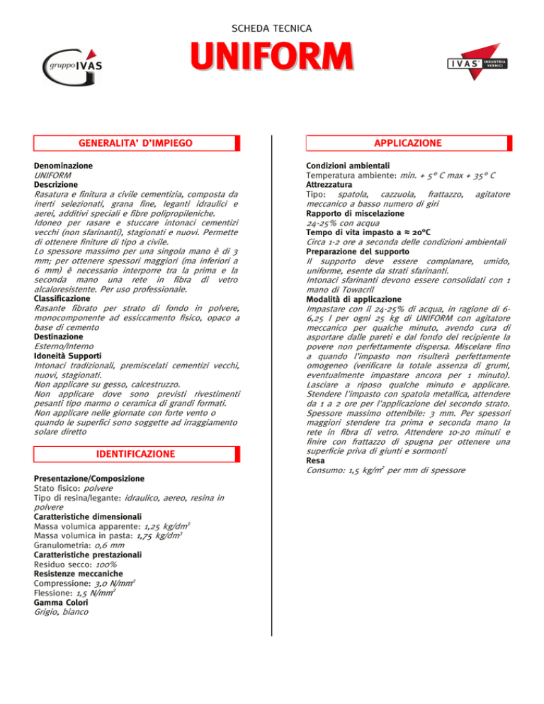 SCHEDA TECNICA U NIFO R M GENERALITA’ D’IMPIEGO Denominazione UNIFORM Descrizione Rasatura e finitura a civile cementizia, composta da inerti selezionati, grana fine, leganti idraulici e aerei, additivi speciali e fibre polipropileniche. Idoneo per rasare e stuccare intonaci cementizi vecchi (non sfarinanti), stagionati e nuovi. Permette di ottenere finiture di tipo a civile. Lo spessore massimo per una singola mano è di 3 mm; per ottenere spessori maggiori (ma inferiori a 6 mm) è necessario interporre tra la prima e la seconda mano una rete in fibra di vetro alcaloresistente. Per uso professionale. Classificazione Rasante fibrato per strato di fondo in polvere, monocomponente ad essiccamento fisico, opaco a base di cemento Destinazione Esterno/Interno Idoneità Supporti Intonaci tradizionali, premiscelati cementizi vecchi, nuovi, stagionati. Non applicare su gesso, calcestruzzo. Non applicare dove sono previsti rivestimenti pesanti tipo marmo o ceramica di grandi formati. Non applicare nelle giornate con forte vento o quando le superfici sono soggette ad irraggiamento solare diretto IDENTIFICAZIONE Presentazione/Composizione Stato fisico: polvere Tipo di resina/legante: idraulico, aereo, resina in polvere Caratteristiche dimensionali Massa volumica apparente: 1,25 kg/dm3 Massa volumica in pasta: 1,75 kg/dm3 Granulometria: 0,6 mm Caratteristiche prestazionali Residuo secco: 100% Resistenze meccaniche Compressione: 3,0 N/mm2 Flessione: 1,5 N/mm2 Gamma Colori Grigio, bianco APPLICAZIONE Condizioni ambientali Temperatura ambiente: min. + 5° C max + 35° C Attrezzatura Tipo: spatola, cazzuola, frattazzo, agitatore meccanico a basso numero di giri Rapporto di miscelazione 24-25% con acqua Tempo di vita impasto a ≈ 20°C Circa 1-2 ore a seconda delle condizioni ambientali Preparazione del supporto Il supporto deve essere complanare, umido, uniforme, esente da strati sfarinanti. Intonaci sfarinanti devono essere consolidati con 1 mano di Towacril Modalità di applicazione Impastare con il 24-25% di acqua, in ragione di 66,25 l per ogni 25 kg di UNIFORM con agitatore meccanico per qualche minuto, avendo cura di asportare dalle pareti e dal fondo del recipiente la povere non perfettamente dispersa. Miscelare fino a quando l’impasto non risulterà perfettamente omogeneo (verificare la totale assenza di grumi, eventualmente impastare ancora per 1 minuto). Lasciare a riposo qualche minuto e applicare. Stendere l'impasto con spatola metallica, attendere da 1 a 2 ore per l'applicazione del secondo strato. Spessore massimo ottenibile: 3 mm. Per spessori maggiori stendere tra prima e seconda mano la rete in fibra di vetro. Attendere 10-20 minuti e finire con frattazzo di spugna per ottenere una superficie priva di giunti e sormonti Resa Consumo: 1,5 kg/m2 per mm di spessore U NIFO R M INDICAZIONI DI SICUREZZA IMMAGAZZINAMENTO Confezionamento Classificazione in relazione alla pericolosità Sacchi da 25 kg Conservazione Temperatura: min. + 5° C max + 30° C (al fresco e Richiede etichettatura di pericolo in base alla direttiva 60/2001/CE e successive modifiche e integrazioni Stabilità nei contenitori dall’umidità: 12 mesi La sostanza concentrata può dare un effetto irritante sulla pelle. Vedi scheda di sicurezza al riparo dal gelo). integri ed al riparo Avvertimenti per l’utilizzatore Gradevolezza olfattiva Inodore Identificazione tipologia rifiuti Contenitori in carta: Classificabile con il cod. 150105 (potenzialmente assimilabile agli urbani in base al regolamento dei singoli comuni) Se il recipiente contiene residui di polveri non essiccate potrà essere classificato con il cod. 150110 Smaltire secondo le disposizioni locali N.B. Il presente Bollettino Tecnico è redatto al meglio delle ns. conoscenze tecnico-scientifiche. Non è tuttavia impegnativo e non comporta nostra responsabilità in quanto le condizioni d’impiego non sono da noi controllabili. Si consiglia di verificare sempre l’idoneità del prodotto al caso specifico. Azienda con sistema di gestione per la qualità certificato UNI EN ISO 9001 Ediz. 07-2015 IVAS Industria Vernici S.p.A. – Via Bellaria, 40 – 47030 San Mauro Pascoli (FC) – Italia Tel. +39 0541 815811 – Fax +39 0541 815815 www.gruppoivas.com [email protected]