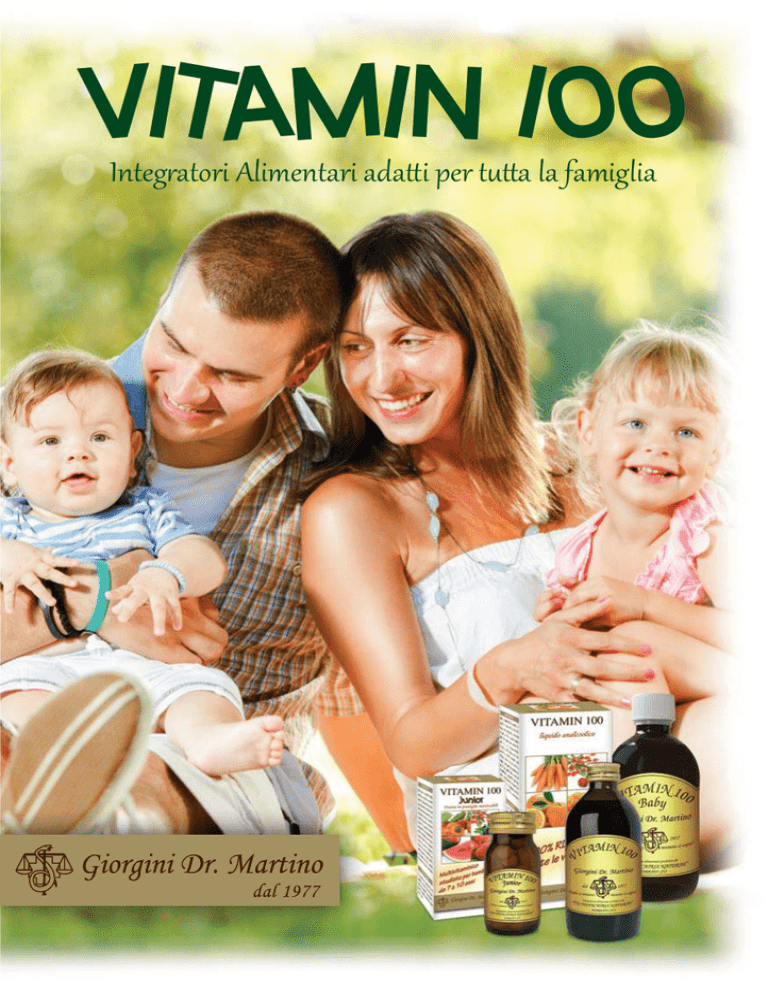 VITAMIN 100 Integratori Alimentari adatti per tutta la famiglia VITAMIN 100 Baby liquido analcoolico gradevolissimo da 1 a 6 anni Multivitaminico studiato appositamente per bambini da 1 a 6 anni. Contiene tutte le vitamine utili a soddisfare il fabbisogno nutrizionale durante la crescita. In particolare, nei bambini la vitamina D è necessaria per la crescita e lo sviluppo delle ossa. Ingredienti: glicerina vegetale bidistillata, acqua pura, tagete (Tagetes erecta) capolini (fiori) E.S. (titolato al 5% in luteina), rosa canina (Rosa canina) frutti E.S. (titolato al 70% in vitamina C), gomma xantana, arancio dolce (Citrus sinensis) scorze dei frutti O.E., carota (Daucus carota) radici E.S. (titolato al 10% in beta-carotene), vitamina E (acetato di DL-α-tocoferile), acerola (Malpighia glabra) frutti (titolato al 50% in vitamina C), vitamina B3 (nicotinamide), vitamina D3 (colecalciferolo), vitamina B5 (pantotenato di calcio), vitamina K1 (fillochinone), vitamina B6 (piridossina), vitamina B2 (riboflavina), vitamina B1 (tiamina), acido folico, biotina, vitamina B12 (cianocobalamina). Modalità d’uso: si consiglia l’assunzione di 15 ml per bambini da 1 a 3 anni e di 20 ml per bambini da 4 a 6 anni, una volta al giorno in qualunque momento. Formati: 200 ml (13 dosi da 15 ml o 10 dosi da 20 ml) - € 14,00 500 ml (33 dosi da 15 ml o 25 dosi da 20 ml) - € 24,50 SENZA: alcool, zuccheri, edulcoranti, coloranti, aromi artificiali e conservanti. TENORE MEDIO DEGLI INGREDIENTI CARATTERIZZANTI INGREDIENTI PER 100 ml ROSA CANINA E.S. 0,3 g 45 mg 60 mg ARANCIO DOLCE O.E. 0,2 g 30 mg 40 mg ACEROLA E.S. 80 mg 12 mg 16 mg LUTEINA 30 mg 4,5 mg 6 mg VITAMINA A (BETA-CAROTENE) 13,5 mg 2,025 mg (84,4% LARN) 2,7 mg (100% LARN)* TIAMINA (B1) 0,45 mg (90% LARN) 0,6 mg (100% LARN) RIBOFLAVINA (B2) 3,5 mg 0,525 mg (87,5% LARN) 0,7 mg (100% LARN) NIACINA (B3) 40 mg 6 mg (85,71% LARN) 8 mg (100% LARN) 12,5 mg 1,875 mg (93,75% LARN) 2,5 mg (100% LARN) VITAMINA B6 3 mg 0,45 mg (90% LARN) 0,6 mg (100% LARN) VITAMINA B12 6 mcg 0,9 mg (100% LARN) 1,2 mcg (100% LARN) AC. PANTOTENICO (B5) 3 mg VITAMINA C 250 mg 37,5 mg (93,75% LARN) 50 mg (100% LARN) VITAMINA D 75 mcg 11,25 mcg (75% LARN) 15 mcg (100% LARN) VITAMINA E 4,5 mg (90% LARN) 6 mg (100% LARN) VITAMINA K 350 mcg 52,5 mcg (87,5% LARN) 70 mcg (100% LARN) ACIDO FOLICO 950 mcg 142,5 mcg (95% LARN) 190 mcg (100% LARN) BIOTINA 30 mg 75 mcg 11,25 mcg (112,5% LARN) 15 mcg (100% LARN) VALORE Kj 1300 Kj 195 Kj 260 ENERGETICO Kcal 310,7 Kcal 46,61 Kcal 62,14 GRASSI 0g CARBOIDRATI, di cui: 76,2 g - POLIOLI (GLICERINA) Multivitaminico studiato per bambini da 1 a 6 anni PER DOSE GIORNALIERA CORRISPONDENTE A 15 ml 20 ml bambini 1 - 3 anni bambini 4 - 6 anni PROTEINE 75 g 0g - - 11,43 g 15,24 g 11,25 g 15 g - - *quantità di Beta-carotene corrispondente al 100% LARN come retinolo equivalente. LARN = Livelli di assunzione di riferimento di nutrienti. Valori riportati specifici per bambini da 1-3 anni e da 4-6 anni (revisione LARN 2012). E.S.= Estratto secco. O.E.= Olio essenziale (Aetheroleum). VITAMIN 100 Junior liquido analcoolico gradevolissimo da 7 a 10 anni Multivitaminico studiato appositamente per bambini da 7 a 10 anni. Contiene tutte le vitamine utili a soddisfare il fabbisogno nutrizionale durante la crescita. In particolare, nei bambini la vitamina D è necessaria per la crescita e lo sviluppo delle ossa. Ingredienti: glicerina vegetale bidistillata, acqua pura, tagete (Tagetes erecta) capolini (fiori) E.S. (titolato al 5% in luteina), rosa canina (Rosa canina) frutti E.S. (titolato al 70% in vitamina C), arancio dolce (Citrus sinensis) scorze dei frutti O.E., gomma xantana, carota (Daucus carota) radici E.S. (titolato al 10% in beta-carotene), vitamina E (acetato di DL-α-tocoferile), acerola (Malpighia glabra) frutti (titolato al 50% in vitamina C), vitamina B3 (nicotinamide), vitamina D3 (colecalciferolo), vitamina B5 (pantotenato di calcio), vitamina K1 (fillochinone), vitamina B6 (piridossina), vitamina B2 (riboflavina), vitamina B1 (tiamina), acido folico, biotina, vitamina B12 (cianocobalamina). Modalità d’uso: si consiglia l’assunzione di 20 ml per bambini da 7 a 10 anni, una volta al giorno in qualunque momento. Formati: 200 ml (10 dosi da 20 ml) - € 14,00 500 ml (25 dosi da 20 ml) - € 24,50 SENZA: alcool, zuccheri, edulcoranti, coloranti, aromi artificiali e conservanti. TENORE MEDIO DEGLI INGREDIENTI CARATTERIZZANTI INGREDIENTI PER DOSE GIORNALIERA CORRISPONDENTE A 20 ml - bambini 7-10 anni ARANCIO DOLCE O.E. 0,3 g 60 mg ROSA CANINA E.S. 0,4 g 80 mg ACEROLA E.S. 90 mg 18 mg LUTEINA 30 mg VITAMINA A (BETA-CAROTENE) 15 mg 3 mg (100% LARN)* TIAMINA (B1) 4 mg 0,8 mg (100% LARN) RIBOFLAVINA (B2) 5 mg 1 mg (100% LARN) 55 mg 11 mg (100% LARN) 17,5 mg 3,5 mg (100% LARN) NIACINA (B3) AC. PANTOTENICO (B5) VITAMINA B6 VITAMINA B12 VITAMINA C VITAMINA D 4,5 mg 8 mcg 325 mg 75 mcg 6 mg 0,9 mg (100% LARN) 1,6 mcg (100% LARN) 65 mg (100% LARN) 15 mcg (100% LARN) VITAMINA E 40 mg VITAMINA K 475 mcg 95 mcg (100% LARN) ACIDO FOLICO 1,3 mg 260 mcg (100% LARN) BIOTINA 100 mcg 20 mcg (100% LARN) VALORE ENERGETICO GRASSI CARBOIDRATI, di cui: - POLIOLI (GLICERINA) PROTEINE Multivitaminico studiato per bambini da 7 a 10 anni PER 100 ml Kj 1300 Kcal 310,7 0g 8 mg (100% LARN) Kj 260 Kcal 62,14 - 76,2 g 15,24 g 75 g 15 g 0g - *quantità di Beta-carotene corrispondente al 100% LARN come retinolo equivalente. LARN = Livelli di assunzione di riferimento di nutrienti. Valori riportati specifici per bambini da 7-10 anni (revisione LARN 2012). E.S.= Estratto secco. O.E.= Olio essenziale (Aetheroleum). VITAMIN 100 Junior pastiglie masticabili gradevolissime da 7 a 10 anni Multivitaminico studiato appositamente per bambini da 7 a 10 anni. Contiene tutte le vitamine utili a soddisfare il fabbisogno nutrizionale durante la crescita. In particolare, nei bambini la vitamina D è necessaria per la crescita e lo sviluppo delle ossa. Ingredienti: frutta in polvere: albicocca (Prunus a