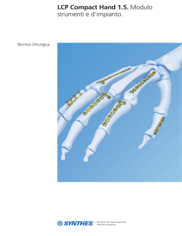 LCP Compact Hand 1.5. Modulo strumenti e d’impianto. Tecnica chirurgica Sommario Introduzione Tecnica chirurgica Informazioni sul prodotto LCP Compact Hand 1.5 2 Principi AO 4 Indicazioni 5 Preparazione 6 Impianto 8 Rimozione dell’impianto 17 Viti 18 Placche 20 Placche con centrapunte LCP corti preassemblati 21 Strumenti 22 Set 24 Controllo con amplificatore di brillanza Avvertenza La presente descrizione non è sufficiente per l'utilizzo immediato dello strumentario. Si consiglia di consultare un chirurgo che già impianti il prodotto. Nota: per informazioni sui principi di fissazione con tecniche convenzionali e con placca bloccata, consultare la tecnica chirurgica della placca di bloccaggio e compressione LCP (art. n. 056.000.019). Condizionamento, cura e manutenzione degli strumenti Synthes Per le direttive generali, il controllo del funzionamento e lo smontaggio di strumenti composti da più componenti, fare riferimento a: www.synthes.com/reprocessing Synthes 1 LCP Compact Hand 1.5. Modulo strumenti e d’impianto. Placche di bloccaggio adattabili per varie indicazioni Placca LCP 1.5, retta Placca di bloccaggio 1.5, retta Placca di bloccaggio a T 1.5 Placca di bloccaggio a griglia 1.5 Placca di bloccaggio a Y 1.5 Placca condilica di bloccaggio 1.5 Minimizza l’irritazione dei tessuti molli Opzione per centrapunte preassemblati Scelta tra viti di bloccaggio o non Placche a basso profilo con bordi arrotondati e superficie altamente lucidata per ridurre al minimo l’irritazione ai tessuti molli. Tutte le placche sono disponibili con o senza centrapunte corti preassemblati. Le viti autofilettanti con testa a profilo basso si posizionano a filo con la placca. I fori di bloccaggio coassiali e i fori LCP accettano entrambe, sia le viti da corticale che di bloccaggio. 2 Synthes LCP Compact Hand 1.5 Tecnica chirurgica Parte integrante del sistema LCP Compact Hand 4 moduli, 5 dimensioni: – Placche adattabili per diverse indicazioni – Una gamma completa di impianti 1.0 mm 1.3 mm 1.5 mm (nuovo bloccaggio) 2.0 mm (bloccaggio) 2.4 mm (bloccaggio) – Ampia gamma di placche LCP, di bloccaggio e non per la sintesi di vari tipi di frattura – L’utilizzo di viti di bloccaggio consente la creazione di una struttura a stabilità angolare, particolarmente vantaggiosa in presenza di osso porotico o in fratture vicine all’articolazione Synthes 3 Principi AO Nel 1958 l’AO ha formulato quattro principi base che si sono trasformati in linee guida per l’osteosintesi.1, 2 Tali principi applicati alla LCP Compact Hand 1.5 sono i seguenti: Riduzione anatomica Il profilo anatomico della placca facilita la riduzione e il ripristino delle relazioni anatomiche. Fissazione stabile La combinazione di viti convenzionali e di bloccaggio offre una fissazione ottimale indipendentemente dalla densità dell’osso. Le viti di bloccaggio creano una struttura a stabilità angolare. Conservazione dell’apporto ematico Un design a contatto limitato riduce la zona di contatto placca-osso e contribuisce a preservare l’apporto ematico periostale. Le estremità rastremate per l’inserimento sottomuscolare della placca preservano la vitalità dei tessuti. Mobilizzazione rapida e attiva La mobilizzazione rapida tramite tecnica AO standard crea un ambiente ideale per la guarigione delle ossa, accelerando una rapida ripresa funzionale. 1 Müller ME, Allgöwer M, Schneider R, Willenegger H (1995) Manual of Internal Fixation. 3rd, expanded and completely revised ed. 1991. Berlin, Heidelberg, New York: Springer 2 Rüedi TP, Buckley RE, Moran CG (2007) AO Principles of Fracture Management. 2nd expanded ed. 2002. Stuttgart, New York: Thieme 4 Synthes LCP Compact Hand 1.5 Tecnica chirurgica Indicazioni − − − − Fissazione di fratture delle falangi e dei metacarpali Osteotomie Artrodesi Reimpianto e ricostruzione di falangi e metacarpali, particolarmente nell’osso porotico Synthes 5 Preparazione 1 LCP Compact Hand 1.5 (LCP, Locking straight and Locking Condylar Plates) Piano preoperatorio 0X.114.002 0X.114.004 Holes 4 6 Length 23 mm 36 mm Holes 6 12 0X.114.003 0X.114.005 Length 29 mm 59 mm AP View Lateral View Locking Condylar Plate 1.5 0X.114.014 Shaft 6 Holes Head 2 Holes 0X.214.006–024 Locking Screw Stardrive " 1.5 mm, self-tapping, length 6–24 mm 0 0X.214.106–124 Cortex Screw Stardrive " 1.5 mm, self-tapping, length 6–24 mm 6 10 15 20 24 0 6 10 15 20 24 1.15 Magnification 0 10 20 30 40 50 60 70 80 90 x=2: Stainless Steel x=4: Titanium 100 mm For use only with the Original AO System of Instruments and Implants Synthes GmbH Eimattstrasse 3 CH-4436 Oberdorf www.synthes.com 034.000.570 AA 30100117 © 01/2010 Synthes, Inc. or its affiliates All rights reserved Synthes and LCP are trademarks of Synthes, Inc. or its affiliates Ö034.000.570_AA@ä Lateral View Locking Plate 1.5, straight AP View Completare la valutazione radiografica preoperatoria e preparare il piano preoperatorio. Usare le sagome radiografiche per LCP Compact Hand 1.5 (Art. No. 034.000.570/575) per determinare la lunghezza della placca e la posizione delle viti. AP View Lateral View LCP Plate 1.5, straight LCP Compact Hand 1.5 (Locking T-, Strut and Y-Plates) AP View Lateral View Locking T-Plate 1.5 0X.114.006 Shaft Head 8 Holes 3 Holes Shaft Head 8 Holes 4 Holes 0X.114.007 Holes 8 oblique left 0X.114.010 Holes 8 oblique right AP View Lateral View Locking Y-Plate 1.5 0X.114.013 Shaft Head 8 Holes 3 Holes 0X.214.006–024 Locking Screw Stardrive " 1.5 mm, self-tapping, length 6–24 mm 0 0X.214.106–124 Cortex Screw Stardrive " 1.5 mm, self-tapping, length 6–24 mm 6 10 15 20 24 0 6 10 15 20 24 1.15 Magnification 0 10 20 30 40 50 60 For use only with the Original AO System of Instruments and Implants 6 Synthes LCP Compact Hand 1.5 Tecnica chirurgica 70 80 90 100 mm x=2: Stainless Steel x=4: Titanium Synthes GmbH Eimattstrasse 3 CH-4436 Oberdorf www.synthes.com 034.000.575 AA 30100117 © 01/2010 Synthes, Inc. or its affiliates All rights 