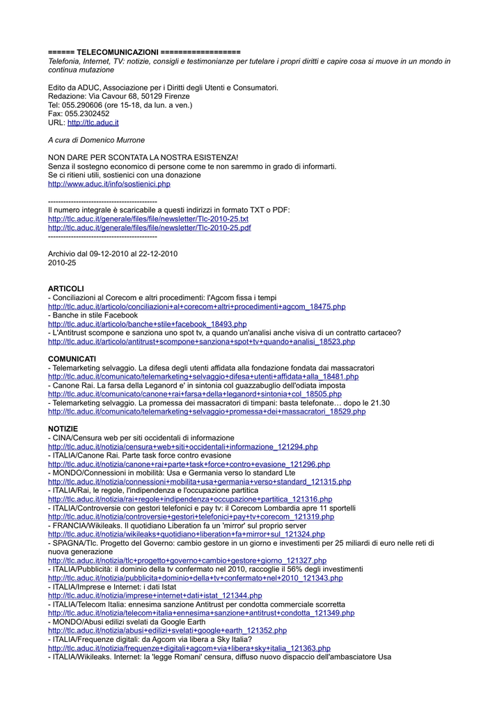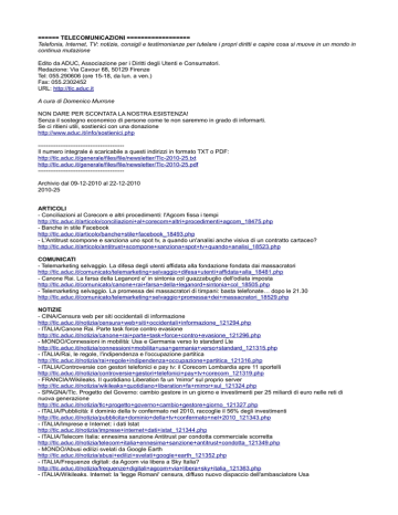 ====== TELECOMUNICAZIONI ================== Telefonia, Internet, TV: notizie, consigli e testimonianze per tutelare i propri diritti e capire cosa si muove in un mondo in continua mutazione Edito da ADUC, Associazione per i Diritti degli Utenti e Consumatori. Redazione: Via Cavour 68, 50129 Firenze Tel: 055.290606 (ore 15-18, da lun. a ven.) Fax: 055.2302452 URL: http://tlc.aduc.it A cura di Domenico Murrone NON DARE PER SCONTATA LA NOSTRA ESISTENZA! Senza il sostegno economico di persone come te non saremmo in grado di informarti. Se ci ritieni utili, sostienici con una donazione http://www.aduc.it/info/sostienici.php ------------------------------------------Il numero integrale è scaricabile a questi indirizzi in formato TXT o PDF: http://tlc.aduc.it/generale/files/file/newsletter/Tlc-2010-25.txt http://tlc.aduc.it/generale/files/file/newsletter/Tlc-2010-25.pdf ------------------------------------------Archivio dal 09-12-2010 al 22-12-2010 2010-25 ARTICOLI - Conciliazioni al Corecom e altri procedimenti: l'Agcom fissa i tempi http://tlc.aduc.it/articolo/conciliazioni+al+corecom+altri+procedimenti+agcom_18475.php - Banche in stile Facebook http://tlc.aduc.it/articolo/banche+stile+facebook_18493.php - L'Antitrust scompone e sanziona uno spot tv, a quando un'analisi anche visiva di un contratto cartaceo? http://tlc.aduc.it/articolo/antitrust+scompone+sanziona+spot+tv+quando+analisi_18523.php COMUNICATI - Telemarketing selvaggio. La difesa degli utenti affidata alla fondazione fondata dai massacratori http://tlc.aduc.it/comunicato/telemarketing+selvaggio+difesa+utenti+affidata+alla_18481.php - Canone Rai. La farsa della Leganord e' in sintonia col guazzabuglio dell'odiata imposta http://tlc.aduc.it/comunicato/canone+rai+farsa+della+leganord+sintonia+col_18505.php - Telemarketing selvaggio. La promessa dei massacratori di timpani: basta telefonate… dopo le 21.30 http://tlc.aduc.it/comunicato/telemarketing+selvaggio+promessa+dei+massacratori_18529.php NOTIZIE - CINA/Censura web per siti occidentali di informazione http://tlc.aduc.it/notizia/censura+web+siti+occidentali+informazione_121294.php - ITALIA/Canone Rai. Parte task force contro evasione http://tlc.aduc.it/notizia/canone+rai+parte+task+force+contro+evasione_121296.php - MONDO/Connessioni in mobilità: Usa e Germania verso lo standard Lte http://tlc.aduc.it/notizia/connessioni+mobilita+usa+germania+verso+standard_121315.php - ITALIA/Rai, le regole, l'indipendenza e l'occupazione partitica http://tlc.aduc.it/notizia/rai+regole+indipendenza+occupazione+partitica_121316.php - ITALIA/Controversie con gestori telefonici e pay tv: il Corecom Lombardia apre 11 sportelli http://tlc.aduc.it/notizia/controversie+gestori+telefonici+pay+tv+corecom_121319.php - FRANCIA/Wikileaks. Il quotidiano Liberation fa un 'mirror' sul proprio server http://tlc.aduc.it/notizia/wikileaks+quotidiano+liberation+fa+mirror+sul_121324.php - SPAGNA/Tlc. Progetto del Governo: cambio gestore in un giorno e investimenti per 25 miliardi di euro nelle reti di nuova generazione http://tlc.aduc.it/notizia/tlc+progetto+governo+cambio+gestore+giorno_121327.php - ITALIA/Pubblicità: il dominio della tv confermato nel 2010, raccoglie il 56% degli investimenti http://tlc.aduc.it/notizia/pubblicita+dominio+della+tv+confermato+nel+2010_121343.php - ITALIA/Imprese e Internet: i dati Istat http://tlc.aduc.it/notizia/imprese+internet+dati+istat_121344.php - ITALIA/Telecom Italia: ennesima sanzione Antitrust per condotta commerciale scorretta http://tlc.aduc.it/notizia/telecom+italia+ennesima+sanzione+antitrust+condotta_121349.php - MONDO/Abusi edilizi svelati da Google Earth http://tlc.aduc.it/notizia/abusi+edilizi+svelati+google+earth_121352.php - ITALIA/Frequenze digitali: da Agcom via libera a Sky Italia? http://tlc.aduc.it/notizia/frequenze+digitali+agcom+via+libera+sky+italia_121363.php - ITALIA/Wikileaks. Internet: la 'legge Romani' censura, diffuso nuovo dispaccio dell'ambasciatore Usa http://tlc.aduc.it/notizia/wikileaks+internet+legge+romani+censura+diffuso_121362.php - ITALIA/Internet. Solo il 49% delle famiglie italiane collegate in banda larga, la media Ue è del 61% http://tlc.aduc.it/notizia/internet+solo+49+famiglie+italiane+collegate+banda_121368.php - USA/Wikileaks. Giornalisti a Obama: attento a pericoloso precedente http://tlc.aduc.it/notizia/wikileaks+giornalisti+obama+attento+pericoloso_121382.php - U.E./Proposte di legge popolari a Strasburgo. Possibile con un milione di firme http://tlc.aduc.it/notizia/proposte+legge+popolari+strasburgo+possibile_121396.php - USA/Un codice per Internet? http://tlc.aduc.it/notizia/codice+internet_121414.php - ITALIA/Spam. Condanna per Buongiorno Vitaminic http://tlc.aduc.it/notizia/spam+condanna+buongiorno+vitaminic_121415.php - ITALIA/Derby rinviato a Genova. Sky 'vieta' ingresso in campo a tv locali e scatena polemiche sul diritto di cronaca http://tlc.aduc.it/notizia/derby+rinviato+genova+sky+vieta+ingresso+campo+tv_121450.php - ITALIA/Diritto d'autore in Rete. Proposta Agcom: nessuna sanzione per chi scarica, obbligo di rimozione per i siti http://tlc.aduc.it/notizia/diritto+autore+rete+proposta+agcom+nessuna+sanzione_121448.php - ITALIA/Annunci... disattesi. Nuova Rete: rinviata iniziativa Agcom http://tlc.aduc.it/notizia/annunci+disattesi+nuova+rete+rinviata+iniziativa_121446.php - VENEZUELA/Censura Internet. Parlamento approva nuova legge piu' restrittiva http://tlc.aduc.it/notizia/censura+internet+parlamento+approva+nuova+legge+piu_121463.php - ITALIA/Pay tv: si aggrava la situazione di Dahlia http://tlc.aduc.it/notizia/pay+tv+si+aggrava+situazione+dahlia_121466.php - UNGHERIA/Censura. Stampa, radio e tv finiscono sotto il controllo del governo http://tlc.aduc.it/notizia/censura+stampa+radio+tv+finiscono+sotto+controllo_121465.php - ITALIA/Telemarketing selvaggio. Gestori telefonici e pay tv ri-promettono: 'faremo i bravi' http://tlc.aduc.it/notizia/telemarketing+selvaggio+gestori+telefonici+pay+tv_121472.php - ITALIA