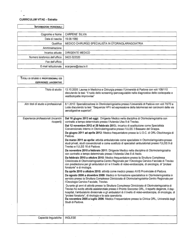 CURRICULUM VITAE - Estratto Cognome e Nome CARPENE' SILVIA Qualifica MEDICO CHIRURGO SPECIALISTA IN OTORINOLARINGOIATRIA Amministrazione Incarico attuale DIRIGEIVTE MEDICO Numero telefonico dell'ufficio 0422-322320 Fax dell'ufficio E-mail istituzionale [email protected] 1 TITOLIDI STUDIO E PROFESSIONALI ED ESPERIENZE LAVORATIVE Titolo di studio 13.10.2005: Laurea in Medicina e Chirurgia presso l'università di Padova con voti 1081110 discutendo la tesi: "Il ruolo dello screening ipercoagulabile nella diagnostica delle cocleopatie e vestibolopatie improvvise" Altri titoli di studio e professionali 8.1.2010: Specializzazione in Otorinolaringoiatriapresso l'università di Padova con voti 70170 e Lode discutendo la tesi: "Sequenze HPV ed espressione della telomerasi nei carcinomi delle vie aerodigestive superiori". Esperienze professionali (incarichi Dal 16 giugno 2013 ad oggi: Dirigente Medico nella disciplina di Otorinolaringoiatriacon ricoperti) contratto a tempo determinato presso l'Azienda Ulss 9 di Treviso. Dal 12 novembre 2012 al 28 febbraio 2013.: incarico di sostituzione come Specialista Convenzionato interno in Otorinolaringoiatria presso I'ULSS 3 Bassano del Grappa. Da giugno 2011 ad aprile 2012: Medico frequentatore presso la U.O.C. di ORL-Otochirurgiadi Padova. Da marzo 2011 aa aprile: attività ambulatoriale come specialista in Otorinolariqgoiatrapresso studi privati, studi convenzionati e come sostituto di specialisti ambulatoriali presso I'ULSS 9 di Treviso e I'ULSS 16 di Padova. Da novembre 2010 a febbraio 2011: Dirigente Medico nella disciplina di Otorinolaringoiatria con contratto a tempo determinato presso l'Azienda Ulss 8 di Asolo. Da febbraio 2010 a ottobre 2010: Medico frequentatore presso la Struttura Complessa Clinicizzata di Otorinolaringoiatria-Centro Regionale per I'Oncologia Cervico-Facciale di Treviso con predilezione per gli ambulatori di I e Il livello di video-endoscopia, di oncologia, di "protesi fonatorie" e di rinologia. Da aprile 2010 a ottobre 2010: attività come medico presso AVIS Provinciale di Padova. Da agosto 2006 a dicembre 2009: Medico in formazione specialistica in Otorinolaringoiatriain servizio presso la Struttura Complessa Clinicizzata di Otorinolaringoiatria-Centro Regionale per I'Oncologia Cervico-Facciale, Treviso. Durante gli anni di attività presso la Struttura Complessa Clinicizzata di Otorinolaringoiatriadi Treviso ho svolto attività assistenziale presso il Pronto Soccorso ORL, il reparto degenze, il dayhospital, l'ambulatorio divisionale e gli ambulatori di Il livello di video-endoscopia, di oncologia, di "protesi fonatorie", di rinologia e la sala operatoria. Da novembre 2005 a luglio 2006: Medico Frequentatore presso la Clinica ORL, Università degli Studi di Padova. Capacità linguistiche INGLESE . . Altro (partecipazione a convegni e Vincitrice della Borsa di Studio 2010 per neospecializzati del CRS Amplifon con la tesi seminari, pubblicazioni, "Sequenze HPV ed espressione della telomerasi nei carcinomi delle vie aerodigestive superiori". collaborazione a riviste, ecc., ed ogni Partecipazione a progetti di ricerca altra informazione che il dirigente partecipazione nell'anno 2012 al progetto di ricerca condotto dall' UOC di ritiene di dover pubblicare) Radioterapia e Medicina Nucleare presso lo IOV - IRCSS "Ruolo di SAMITAL@nella cura della mucosite orale in pazienti con carcinoma squamoso del distretto testa-collo trattati con chemioradioterapia (CT-RT). Uno studio di fase 2, randomizzato, con impiego di placebo". partecipazione nel 2010 al programma di ricerca condotto dalla Struttura Complessa Clinicizzata di Otorinolaringoiatria-Centro Regionale per I'Oncologia Cervico-Facciale di Treviso (Ricerca Scientifica fondi quota ex 60%, Bando 2010) "Sequenze HPV ed espressione della telomerasi nei carcinomi dell'orofaringe". co-investigator dal 2007 a marzo 2008 nello "Studio multicentrico, in doppio cieco, randomizzato a gruppi paralleli, per valutare I'efiicacia e la tollerabilità di moxifloxacina 400mg OD somministrata per 7 giorni verso amoxicillina/clavulanato 100mg TID somministrata per 10 giorni, in pazienti affetti da rinosinusite batterica acuta" condotto dalla Struttura Complessa Clinicizzata di Otorinolaringoiatria-Centro Regionale per I'Oncologia Cervico-Faccialedi Treviso . Pubblicazioni scientifiche su riviste Internazionali "Peer Reviewed" con Impact Factor 2.141 1. Boscolo Rizzo P,, De Cillis G., Marchiori C,, Carpenè S., Da Mosto M.C. Multivariate Analysis of Risk Factors for Pharyngocutaneous Fistula after Total Laryngectomy European Archives of Oto-Rhino-Laryngology 2008; 265:791-796. 2. Boscolo Rizzo P., Zanetti F., Carpenè S., Da Mosto M.C. Long-term Results with TracheoesophagealVoice Prosthesis: Primary versus secondary 'TEP European Archives of Oto-Rhino-Laryngology 2007; 26573-77. 1 3. Marioni G., Savastano M., Mattiello L., Koussis H., Carpenè S., Marino F., Stafiieri A. Tongue base metastasis from neuroendocrine endometrial small cell carcinoma American , Journal of Otolaryngology-Head and Neck Medicine and Surgery 2007; 28:284-287. Relazioni su invito a convegni e corsi Nazionali ed Internazionali: C. Stafiieri, S. Carpenè IVuove tecniche di videoendoscopia Corso teorico-pratico: Cancro della laringe. Gestione integrata clinico-radiologica. Treviso, 7-8 ottobre 2010 M. C. Da Mosto, M. Stellin, S. Carpenè Gestione della disfagia acuta 9th International SVO Conference on Head & IVeck Cancer Venezia, 8-10 luglio 2010 M.C. Da Mosto, S. Carpenè I corpi estranei tracheo-bronchiali Workshop AIPO-SVO. Un'unica via... due specialità: or1 e pneumologi a confronto. Treviso, 8 maggio 2010 G. Cescon, M. Stellin, S. Carpenè La tracheotomia: indicazioni, tecniche chirurgiche, gestione Workshop AIPO-SVO. Un'unica via ... due specialità: or1 e pneumologi a confronto. Treviso, 8 maggio 2010 M.C. Da Mosto, P. Boscolo-Rizzo, S. Carpenè GERD-Laryngo-pharyngealreflux disease ' 8th SVO International Conference on Head