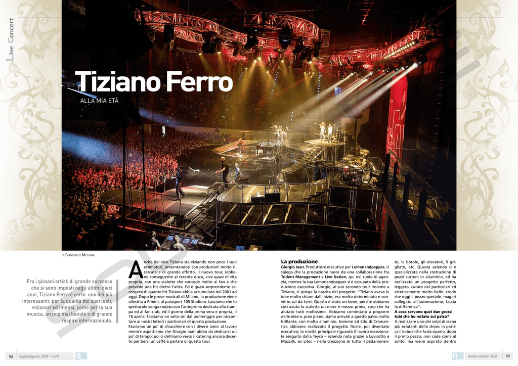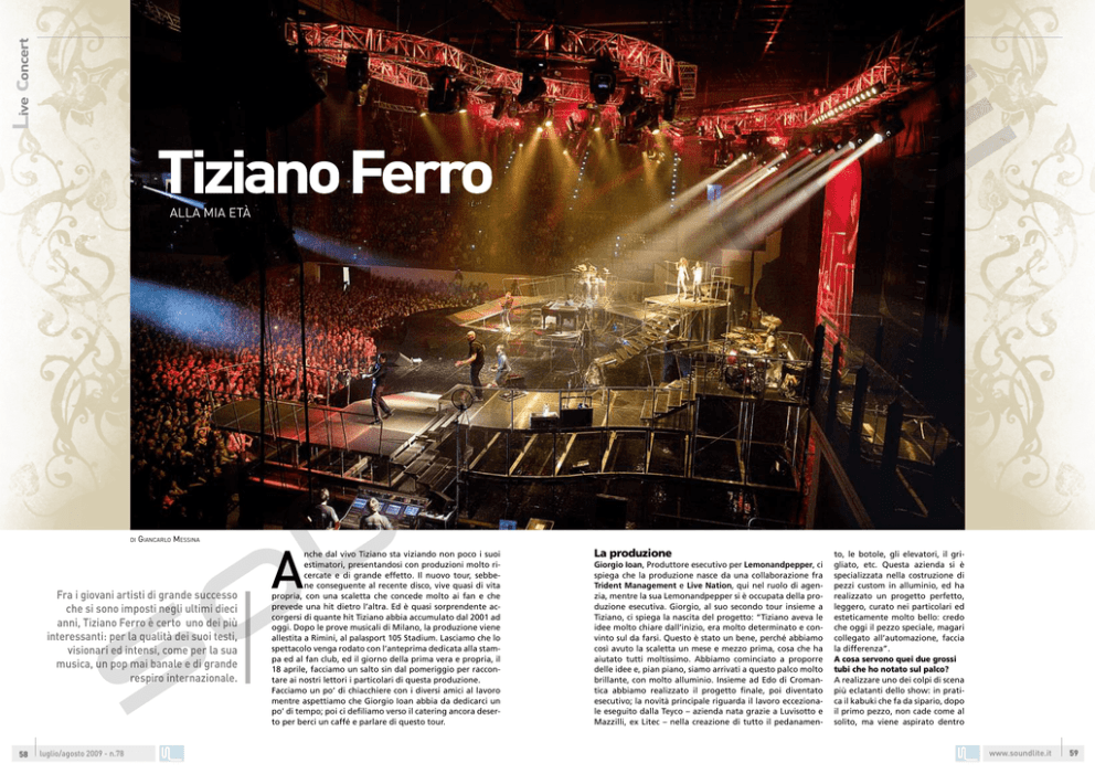 Live concert Tiziano Ferro Alla mia età di Giancarlo Messina Fra i giovani artisti di grande successo che si sono imposti negli ultimi dieci anni, Tiziano Ferro è certo uno dei più interessanti: per la qualità dei suoi testi, visionari ed intensi, come per la sua musica, un pop mai banale e di grande respiro internazionale. 58 luglio/agosto 2009 - n.78 A nche dal vivo Tiziano sta viziando non poco i suoi estimatori, presentandosi con produzioni molto ricercate e di grande effetto. Il nuovo tour, sebbene conseguente al recente disco, vive quasi di vita propria, con una scaletta che concede molto ai fan e che prevede una hit dietro l’altra. Ed è quasi sorprendente accorgersi di quante hit Tiziano abbia accumulato dal 2001 ad oggi. Dopo le prove musicali di Milano, la produzione viene allestita a Rimini, al palasport 105 Stadium. Lasciamo che lo spettacolo venga rodato con l’anteprima dedicata alla stampa ed al fan club, ed il giorno della prima vera e propria, il 18 aprile, facciamo un salto sin dal pomeriggio per raccontare ai nostri lettori i particolari di questa produzione. Facciamo un po’ di chiacchiere con i diversi amici al lavoro mentre aspettiamo che Giorgio Ioan abbia da dedicarci un po’ di tempo; poi ci defiliamo verso il catering ancora deserto per berci un caffé e parlare di questo tour. La produzione Giorgio Ioan, Produttore esecutivo per Lemonandpepper, ci spiega che la produzione nasce da una collaborazione fra Trident Management e Live Nation, qui nel ruolo di agenzia, mentre la sua Lemonandpepper si è occupata della produzione esecutiva. Giorgio, al suo secondo tour insieme a Tiziano, ci spiega la nascita del progetto: “Tiziano aveva le idee molto chiare dall’inizio, era molto determinato e convinto sul da farsi. Questo è stato un bene, perché abbiamo così avuto la scaletta un mese e mezzo prima, cosa che ha aiutato tutti moltissimo. Abbiamo cominciato a proporre delle idee e, pian piano, siamo arrivati a questo palco molto brillante, con molto alluminio. Insieme ad Edo di Cromantica abbiamo realizzato il progetto finale, poi diventato esecutivo; la novità principale riguarda il lavoro eccezionale eseguito dalla Teyco – azienda nata grazie a Luvisotto e Mazzilli, ex Litec – nella creazione di tutto il pedanamen- to, le botole, gli elevatori, il grigliato, etc. Questa azienda si è specializzata nella costruzione di pezzi custom in alluminio, ed ha realizzato un progetto perfetto, leggero, curato nei particolari ed esteticamente molto bello: credo che oggi il pezzo speciale, magari collegato all’automazione, faccia la differenza”. A cosa servono quei due grossi tubi che ho notato sul palco? A realizzare uno dei colpi di scena più eclatanti dello show: in pratica il kabuki che fa da sipario, dopo il primo pezzo, non cade come al solito, ma viene aspirato dentro www.soundlite.it 59 Live concert 1 2 1: Tris di Lemonandpepper. Da sx: Fabio Carmassi, Giorgio Ioan e Stefano Copelli. 2: Coppia d’assi. Il produttore artistico e direttore musicale Michele Canova con l’addetta all’ufficio stampa Tania Sachs. 60 luglio/agosto 2009 - n.78 questi due grossi tubi da 40 cm – montati dentro due americane Thomas da 52 – grazie ad un sistema molto sofisticato basato su contrappesi perfetti e su tempi di caduta calcolati in millisecondi. Per realizzare questo effetto, fra l’altro, il kabuki non è retto dal solito sistema magnetico, ma da elettrocalamite a pinza che sganciano la seta senza che questa abbia nulla al suo interno. Il video ormai è quasi immancabile in produzioni di que sto genere: come avete affrontato l’argomento? Abbiamo cercato di differenziarci dalla tendenza degli ultimi periodi orientandoci verso uno schermo LED ma ad alta definizione, giocando sulla forma degli schermi e sulle inquadrature, sui tagli diversi e su contributi prodotti ad hoc. Devo sottolineare l’ottimo lavoro di Emigliano Napoli di STS, con noi da tempo, veramente molto bravo nel comprendere le nostre idee e dare il giusto taglio alla regia video. Puoi riassumere le aziende al lavoro in questo tour? Certo: Agorà fornisce audio e luci, STS il video, Teyco la costruzione scenotecnica, Dari le automazioni, Peroni le forniture di scena; a queste si aggiungono il catering ed i trasporti forniti rispettivamente da Giromangiando e Transshow. Fra i professionisti voglio segnalare l’arrivo di Andrea Corsellini come sound engineer che si è integrato perfettamente in questa famiglia e con cui ci siamo trovati benissimo: si sente proprio bene, potente e definito. Anche Nicola Tallino, lighting designer, è stato prezioso sin dal disegno del progetto scenografico. Un ruolo essenziale per lo show è poi quello di Marco Bazzani, detto “il Bazza”, che controlla tutti i computer che mandano le immagini digitali: è una persona chiave, così com’è importante il controllo camere. Mi piace dire che noi abbiamo il privilegio di poter scegliere i nostri collaboratori tra quelli tecnicamente più bravi ma anche umanamente più gradevoli, dei veri amici: andare al catering è come mangiare nella cucina di casa! Quali sono le chicche dello show, oltre al risucchio del kabuki? La cosa che a me piace molto è il lavoro di Teyco, che impreziosisce un palco veramente curatissimo nei particolari e diverso dal solito. Ad esempio il solito fondale nero è stato sostituito con un tessuto utilizzato in ambito navale, molto riflettente, ed anche la pavimentazione è realizzata in PVC nero lucido: sono dettagli che arricchiscono l’immagine percepita dal pubblico. Pensa che anche i diffusori per le prime file sono incassati nel palco, rifiniti con un tulle orlato dalla sarta! Non mancano delle coreografie, di Veronica Peparini, con degli acrobati bravissimi, ed alcuni elevatori che creano qualche colpo di scena. Insomma abbiamo curato molto il particolare: dopotutto siamo al lavoro da due mesi e qui a Rimini da 10 giorni. Come vi distribuite il lavoro con i tuoi soci di Lemonand pe