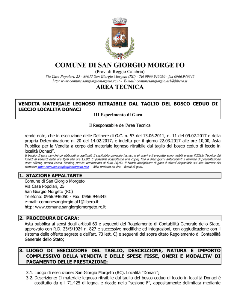 COMUNE DI SAN GIORGIO MORGETO (Prov. di Reggio Calabria) Via Case Popolari, 25 - 89017 San Giorgio Morgeto (RC) - Tel 0966.946050 - fax 0966.946345 http: www.comune.sangiorgiomorgeto.rc.it - E-mail: [email protected] AREA TECNICA VENDITA MATERIALE LEGNOSO RITRAIBILE DAL TAGLIO DEL BOSCO CEDUO DI LECCIO LOCALITÀ DONACI III Esperimento di Gara Il Responsabile dell’Area Tecnica rende noto, che in esecuzione delle Delibere di G.C. n. 53 del 13.06.2011, n. 11 del 09.02.2017 e della propria Determinazione n. 20 del 14.02.2017, è indetta per il giorno 22.03.2017 alle ore 10,00, Asta Pubblica per la Vendita a corpo del materiale legnoso ritraibile dal taglio del bosco ceduo di leccio in località Donaci”. Il bando di gara nonché gli elaborati progettuali, il capitolato generale tecnico e di oneri e il progetto sono visibili presso l’Ufficio Tecnico dal lunedì al venerdì dalle ore 9,00 alle ore 13,00. E’ possibile acquistarne una copia, fino a dieci giorni antecedenti il termine di presentazione delle offerte, presso l’Area Tecnica, previo versamento di Euro 20,00. Il bando-disciplinare di gara è altresì disponibile sul sito internet del comune: www.comune.sangiorgiomorgeto.rc.it - Albo pretorio on-line - Bandi di gara. 1. STAZIONE APPALTANTE: Comune di San Giorgio Morgeto Via Case Popolari, 25 San Giorgio Morgeto (RC) Telefono: 0966.946050 - Fax: 0966.946345 e-mail: [email protected] http: www.comune.sangiorgiomorgeto.rc.it 2. PROCEDURA DI GARA: Asta pubblica ai sensi degli articoli 63 e seguenti del Regolamento di Contabilità Generale dello Stato, approvato con R.D. 23/5/1924 n. 827 e successive modifiche ed integrazioni, con aggiudicazione con il sistema delle offerte segrete e dell’art. 73 lett. C) e seguenti del sopra citato Regolamento di Contabilità Generale dello Stato; 3. LUOGO DI ESECUZIONE DEL TAGLIO, DESCRIZIONE, NATURA E IMPORTO COMPLESSIVO DELLA VENDITA E DELLE SPESE FISSE, ONERI E MODALITA’ DI PAGAMENTO DELLE PRESTAZIONI: 3.1. Luogo di esecuzione: San Giorgio Morgeto (RC), Località “Donaci”; 3.2. Descrizione: Il materiale legnoso ritraibile dal taglio del bosco ceduo di leccio in località Donaci è costituito da q.li 71.425 di legna, e ricade nella “sezione F”, appositamente delimitata mediante duplice anellatura in vernice rossa posta a m. 1,30 da terra sulle piante radicate lungo il perimetro e con apposizione dell’impronta del martello forestale recante la sigla LC 120 RC; Il taglio, per quanto previsto dalla proroga del provvedimento autorizzativo di taglio del Dipartimento Agricoltura Foreste e Forestazione della Regione Calabria prot. 936 del 20.02.2013 drovrà avvenire secondo la seguente calendarizzazione: 1. Stagione silvana 2016/2017, ha 5.00.00 2. Stagione silvana 2017/2018, ha 5.00.00 3. Stagione silvana 2018/2019, ha 5.00.00 4. Stagione silvana 2019/2020, ha 5.00.00 5. Stagione silvana 2020/2021, ha 5.00.00 6. Stagione silvana 2021/2022, ha 5.00.00 3.3. Importo della vendita (sul quale verrà calcolata la percentuale di offerta a rialzo): € 71.425,00 oltre I.V.A. come per legge; 3.4. Importo spese fisse a carico dell’aggiudicatario: € 7.250,00 per martellata e progettazione oltre I.V.A. come per legge. € 7.250,00 per direzioni lavori e collaudo oltre I.V.A. come per legge. 3.5. Cauzioni e garanzie: Per partecipare alla gara è richiesta un deposito cauzionale a garanzia della sottoscrizione del contratto, prestato in una delle seguenti modalità: Versamento presso la Tesoreria di questo Comune dell’importo di € 7.250,00 oltre I.V.A. come per legge, pari alle spese per martellata progettazione e altro; tale deposito cauzionale dovrà effettuarsi tramite bonifico bancario presso la Banca Monte dei Paschi di Siena sul seguente conto corrente intestato al Comune di San Giorgio Morgeto avente codice IBAN: IT 13 U 01030 81500 000061114076. Assegno circolare “non trasferibile” intestato al Sindaco pro-tempore del Comune di San Giorgio Morgeto; Ai concorrenti non aggiudicatari, il deposito sarà restituito entro 30 (trenta) giorni dalla data dell'aggiudicazione. L'aggiudicatario dovrà inoltre costituire presso la cassa del Comune un deposito cauzionale, a garanzia dell'esatta esecuzione degli obblighi contrattuali e nella misura del 10% dell'importo del contratto, tramite bonifico bancario presso la Banca Monte dei Paschi di Siena sul seguente conto corrente intestato al Comune di San Giorgio Morgeto avente codice IBAN: IT 13 U 01030 81500 000061114076. Il deposito potrà essere in alternativa sostituito da fidejussione prestata fino alla completa liberazione degli obblighi nascenti dal contratto, da un istituto di credito di diritto pubblico o da una società di assicurazioni autorizzata a tale forma di garanzia. 3.6 Pagamento del prezzo di aggiudicazione e delle spese per direzioni lavori e collaudo: L’aggiudicatario dovrà pagare il prezzo di aggiudicazione in valuta legale al tesoriere dell’Ente Proprietario in cinque soluzioni di importo pari ad 1/5 del prezzo di aggiudicazione oltre IVA + 1.450,00 oltre IVA per spese tecniche. la prima all’atto della stipula del contratto. la seconda prima del taglio del primo lotto. la terza prima del taglio del secondo lotto. la quarta prima del taglio del terzo lotto. la quinta prima del taglio del quarto lotto. In caso di ritardo dei dovuti pagamenti vale quanto riportato all'art. 13 del capitolato d’appalto del progetto e negli altri articoli e norme contenute nello stesso capitolato di appalto che fa parte integrante del presente bando. 4. TERMINE DI ESECUZIONE: Il taglio delle piante, lo sgombero del materiale legnoso e dei rifiuti della lavorazione dovranno terminare entro la stagione silvana 2021/2022, salvo eventuali proroghe concesse a termini dell’Art. 16 del capitolato d’oneri. 2 5. DOCUMENTAZIONE E MODALITA’ DI PRESENTAZIONE DELLE OFFERTE: I plichi contenenti l’offerta e la documentazione, pena l’esclusione dalla gara, devono pervenire, a mezzo raccomanda