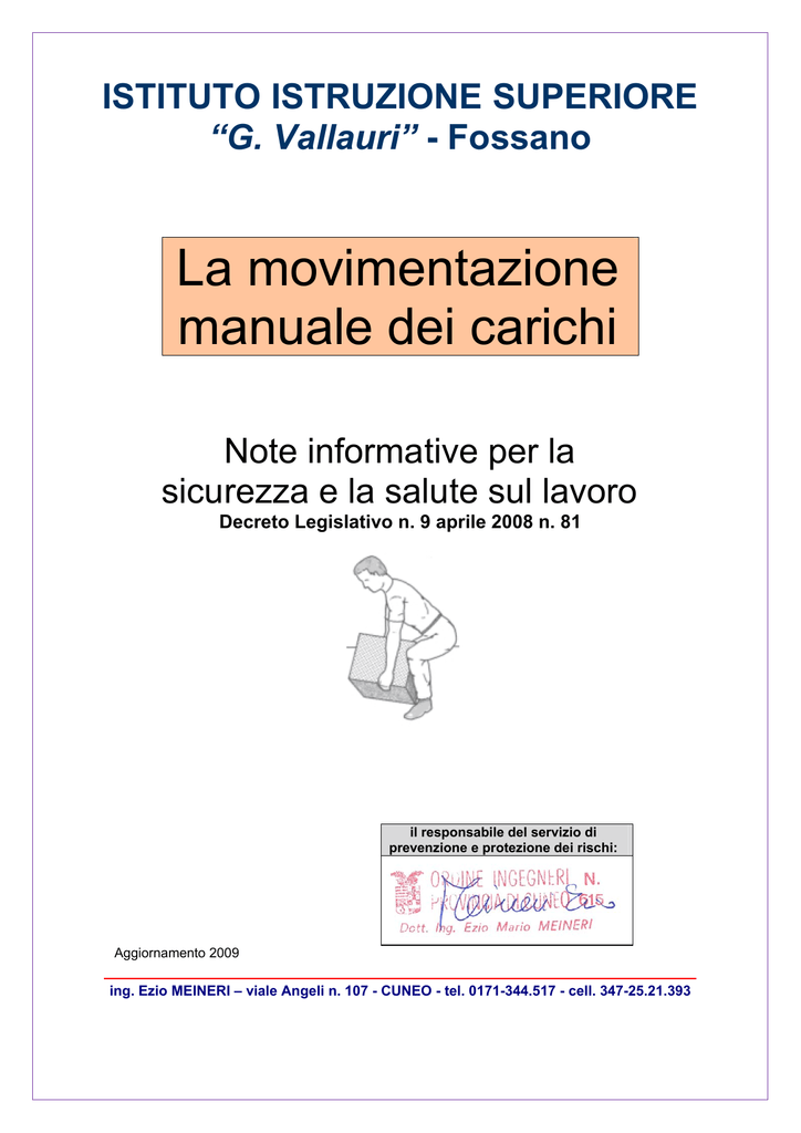 ISTITUTO ISTRUZIONE SUPERIORE “G. Vallauri” - Fossano La movimentazione manuale dei carichi Note informative per la sicurezza e la salute sul lavoro Decreto Legislativo n. 9 aprile 2008 n. 81 il responsabile del servizio di prevenzione e protezione dei rischi: Aggiornamento 2009 __________________________________________________________________ ing. Ezio MEINERI – viale Angeli n. 107 - CUNEO - tel. 0171-344.517 - cell. 347-25.21.393 I.I.S. “G. Vallauri” - Fossano 1 PREMESSA Per Movimentazione Manuale dei Carichi (MMC) si intendono tutte quelle operazioni di trasporto o di sostegno di un carico ad opera di uno o più lavoratori, comprese le azioni del sollevare, deporre, spingere, tirare, portare o spostare un carico, che, per le loro caratteristiche o in conseguenza delle condizioni ergonomiche sfavorevoli, comportano rischi di patologie da sovraccarico biomeccanico, in particolare dorso-lombari. Per patologie da sovraccarico biomeccanico si intendono patologie delle strutture osteoarticolari, muscolotendinee e nervovascolari (D.Lgs. n. 81/2008, art. 167). Per postura di lavoro si intende il complesso e la sequenza degli atteggiamenti che il corpo assume per lo svolgimento di un determinato compito lavorativo. In taluni casi la postura di lavoro si mantiene, nel tempo, sostanzialmente costante (postura fissa) essendo eventualmente prevista un’operatività dinamica solo per limitati distretti corporei; in altri casi la sequenza di atteggiamenti corporei durante il lavoro è assai variegata, composita e, spesso, frequentemente modificata (postura dinamica). La postura di lavoro non è di per sé un fattore di rischio; lo diviene quando si realizza una condizione di sovraccarico meccanico per un qualsivoglia distretto corporeo; in tal caso si parla di postura incongrua. Il sovraccarico meccanico si realizza, per lo più, in queste condizioni: 1) forte impegno e sforzo eccessivo di strutture articolari, tendinee e muscolari quale quello determinato dallo spostamento, sollevamento e trasporto manuale di oggetti pesanti; 2) impegno, magari modesto ma continuativo, delle medesime strutture quale quello che deriva dal mantenimento di posture fisse prolungate (erette o sedute), specie se vi è un atteggiamento in posizione non fisiologica di un qualche segmento del corpo o del tronco (es. capo e tronco costantemente flessi in avanti); 3) presenza di movimenti ripetitivi e continuativi di un particolare segmento corporeo le cui strutture sono sollecitate in modo eccessivo secondo un’unica modalità. Le prime due condizioni comportano un rischio prevalentemente a carico della colonna vertebrale nei suoi diversi tratti (cervicale, dorsale e lombosacrale). La terza configura un rischio prevalentemente a carico degli arti superiori e specificamente per le strutture della mano e dell’avambraccio. Una non corretta movimentazione manuale ed il prolungato mantenimento di posture di lavoro incongrue può provocare distorsioni, lombalgie (il comune mal di schiena), lombalgie acute (il cosiddetto “colpo della strega”), ernie del disco (con possibile conseguente sciatalgia), strappi muscolari, fino alle lesioni dorso-lombari gravi. A questi rischi, strettamente legati all’attività di movimentazione dei carichi, si collegano altri possibili rischi dovuti al trasporto del carico stesso: – può cadere, provocando contusioni o fratture; – può essere caldo o tagliente, con possibilità di ustioni o lesioni; – può non far vedere scalini o oggetti che si trovano per terra, facendo inciampare. I disturbi dorso-lombari possono manifestarsi in tutti i settori e in tutte le occupazioni lavorative, tuttavia molti studi hanno dimostrato che alcuni settori e alcuni gruppi di occupazione sembrano essere particolarmente a rischio. Gruppi ad alto rischio sono considerati ad esempio gli agricoltori, i muratori, i falegnami, gli autisti inclusi i camionisti e i conducenti dei trattori, gli infermieri e i collaboratori sanitari, coloro che si occupano delle pulizie, gli inservienti e i collaboratori domestici. Per quanto riguarda le distinzione tra i sessi, i disturbi dorso-lombari in Europa colpiscono in ugual modo uomini e donne. Il presente opuscolo informativo è stato pertanto redatto allo scopo di fornire ai lavoratori adeguate informazioni sui rischi specifici a cui possono essere esposti nella movimentazione manuale dei carichi, relativamente alle situazioni più ricorrenti nel lavoro, e di indicare norme comportamentali ed accorgimenti da seguire per eliminare o ridurre al minimo la probabilità del verificarsi di rischi per la sicurezza e la salute connessi a tale attività. I.I.S. “G. Vallauri” - Fossano 2 LA COLONNA VERTEBRALE ED IL RACHIDE La colonna vertebrale rappresenta l’elemento costruttivo primario di tutto lo scheletro umano. Le vertebre sono in numero di 33, suddivise in cervicali (7 vertebre), dorsali (12 vertebre), lombari (5 vertebre), sacrali (5 vertebre) e coccigee (4 vertebre); La colonna vertebrale consente prestazioni statiche (es. stazione eretta) e prestazioni dinamiche (es. piegamenti, rotazioni del tronco). La colonna vertebrale (osservata di profilo) presenta la caratteristica curvatura a doppia esse per permettere un migliore e più efficace assorbimento ed una distribuzione dei carichi movimentati. Le tre curve sono chiamate: lordosi cervicale - cifosi dorsale - lordosi lombare. La struttura portante del nostro corpo si chiama RACHIDE ed è costituita da: ossa (vertebre) dischi intervertebrali muscoli legamenti (tendini) Esso costituisce un supporto per la testa e le varie parti del tronco stesso e dà attacco agli arti superiori ed inferiori. Fra queste strutture, il disco intervertebrale è quella maggiormente soggetta ad alterarsi. Esso infatti deve sopportare carichi notevoli. I dischi intervertebrali, costituiti da un nucleo centrale e da un anello fibroso esterno, svolgono le funzioni di ammortizzatore delle forze/peso esercitate sulla colonna permett