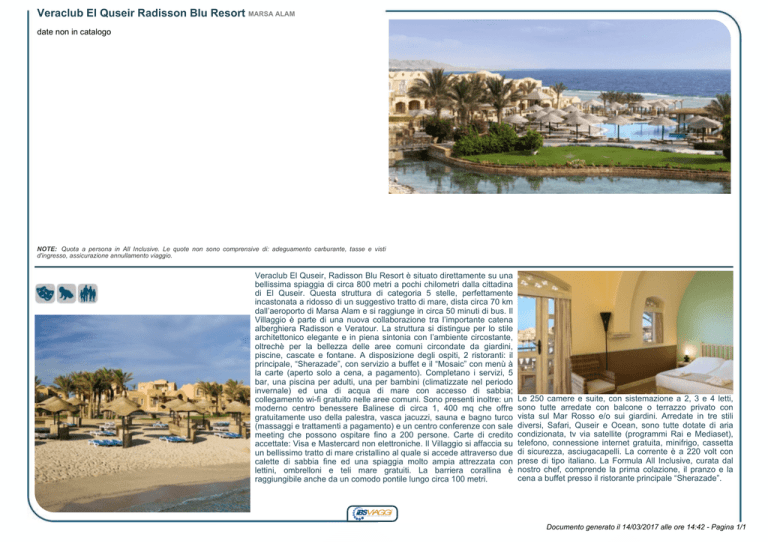 Veraclub El Quseir Radisson Blu Resort MARSA ALAM date non in catalogo NOTE: Quota a persona in All Inclusive. Le quote non sono comprensive di: adeguamento carburante, tasse e visti d'ingresso, assicurazione annullamento viaggio. Veraclub El Quseir, Radisson Blu Resort è situato direttamente su una bellissima spiaggia di circa 800 metri a pochi chilometri dalla cittadina di El Quseir. Questa struttura di categoria 5 stelle, perfettamente incastonata a ridosso di un suggestivo tratto di mare, dista circa 70 km dall’aeroporto di Marsa Alam e si raggiunge in circa 50 minuti di bus. Il Villaggio è parte di una nuova collaborazione tra l’importante catena alberghiera Radisson e Veratour. La struttura si distingue per lo stile architettonico elegante e in piena sintonia con l’ambiente circostante, oltrechè per la bellezza delle aree comuni circondate da giardini, piscine, cascate e fontane. A disposizione degli ospiti, 2 ristoranti: il principale, “Sherazade”, con servizio a buffet e il “Mosaic” con menù à la carte (aperto solo a cena, a pagamento). Completano i servizi, 5 bar, una piscina per adulti, una per bambini (climatizzate nel periodo invernale) ed una di acqua di mare con accesso di sabbia; collegamento wi-fi gratuito nelle aree comuni. Sono presenti inoltre: un moderno centro benessere Balinese di circa 1, 400 mq che offre gratuitamente uso della palestra, vasca jacuzzi, sauna e bagno turco (massaggi e trattamenti a pagamento) e un centro conferenze con sale meeting che possono ospitare fino a 200 persone. Carte di credito accettate: Visa e Mastercard non elettroniche. Il Villaggio si affaccia su un bellissimo tratto di mare cristallino al quale si accede attraverso due calette di sabbia fine ed una spiaggia molto ampia attrezzata con lettini, ombrelloni e teli mare gratuiti. La barriera corallina è raggiungibile anche da un comodo pontile lungo circa 100 metri. Le 250 camere e suite, con sistemazione a 2, 3 e 4 letti, sono tutte arredate con balcone o terrazzo privato con vista sul Mar Rosso e/o sui giardini. Arredate in tre stili diversi, Safari, Quseir e Ocean, sono tutte dotate di aria condizionata, tv via satellite (programmi Rai e Mediaset), telefono, connessione internet gratuita, minifrigo, cassetta di sicurezza, asciugacapelli. La corrente è a 220 volt con prese di tipo italiano. La Formula All Inclusive, curata dal nostro chef, comprende la prima colazione, il pranzo e la cena a buffet presso il ristorante principale “Sherazade”. Documento generato il 14/03/2017 alle ore 14:42 - Pagina 1/1