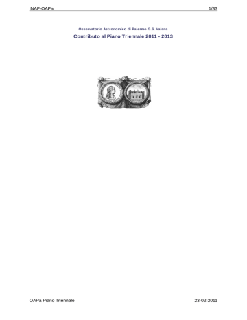 INAF-OAPa 1/33 Osservat orio Ast ronomico di Palermo G.S. Vaiana Contributo al Piano Triennale 2011 - 2013 OAPa Piano Triennale 23-02-2011 INAF-OAPa 2/33 Osservat orio Ast ronomico di Palermo G.S. Vaiana Contributo al Piano Triennale 2011 - 2013 Relazione del Direttore Execut ive Summary L'Osservatorio Astronomico di Palermo "Giuseppe S. Vaiana" si caratterizza per la specifica vocazione nel campo dell'Astrofisica Spaziale. Essa ha portato alla realizzazione della facility XACT per l'Astronomia X, al raggiungimento di una competenza riconosciuta internazionalmente nel campo dell'astrofisica solare e stellare in particolare sull'emissione nei raggi X, alla partecipazione allo studio di missioni per astronomia a raggi X quali NHXM, IXO, ORIGIN, etc. Di recente l'interesse per lo studio di sistemi stellari e planetari si è consolidato con il coinvolgimento in missioni spaziali, come COROT e PLATO, selezionata per la fase B nell'ambito del programma ESA Cosmic Vision e la idea di missione ECHO, presentata in risposta alla AO per una missione M del programma ESA CV. Va inoltre ricordato il coinvolgimento con ruoli di responsabilità scientifica di ricercatori di OAPA nella missione SOLAR ORBITER del programma ESA CV. Il forte interesse nel calcolo ad alte prestazioni si è di recente consolidato, sia tramite finanziamenti della Regione Sicilia e di ASI, che attraverso la partecipazione al progetto PON-MIUR PI2S2 finanziato al consorzio siciliano COMETA. OAPA opera in forte sinergia con docenti e assegnisti di ricerca del Dip. di Fisica dell'Università di Palermo. Quattro docenti hanno un contratto gratuito di ricerca presso l'INAF-OAPA Gli specifici elementi di criticità sono discussi nella sezione della note del Direttore Cenni st orici L' Osservatorio Astronomico di Palermo venne istituito alla fine del XVIII secolo da Ferdinando I di Borbone ed eretto sulla torre pisana del Palazzo Reale, dove è tuttora ubicato. L' eccellente strumentazione originaria consentì la scoperta del primo asteroide, Cerere (1801) e la redazione di un importante catalogo stellare (1803 e 1814) sotto la direzione di Giuseppe Piazzi (1746-1826). Dopo un periodo di stasi, nella metà del XIX secolo la strumentazione venne rinnovata con fondi del governo borbonico; con l' Unità d' Italia, l' Osservatorio primeggiò nelle ricerche di fisica solare grazie a Pietro Tacchini (1838-1905). Col XX secolo inizia il declino e nel 1923 l'Osservatorio viene declassato a gabinetto universitario. L' Osservatorio rinasce sotto la direzione di Giuseppe S. Vaiana (1935-1991), che alla fine degli anni Settanta lo inserì nel circuito internazionale della ricerche nel campo della astronomia nei raggi X. All' attività di Vaiana si deve, nel 1988, il reinserimento nel numero degli Osservatori Astronomici. Sotto la sua direzione iniziò il restauro della sede di Palazzo Reale, venne avviato la ricognizione e il restauro delle collezioni storiche di strumenti che ha portato all' apertura del Museo (2001), nonchè l'avvio della realizzazione, avvenuta nei primi anni '90, della facility XACT per la calibrazione di strumentazione per astronomia X; trasferita nel 2006 in una nuova sede, è stata contestualmente potenziata grazie ad un intervento PON-MIUR At t ivit à di Ricerca La descrizione delle attività di ricerca è data nei Progetti di Ricerca. Molta dell'attività è concentrata nella MA 2 (Stelle, popolazioni stellari e mezzo interstellare), esiste una significativa attività nella MA 3 (Sole e Sistema solare) e una un pò meno corposa nella MA 4 (AstroFisica relativistica e particellare). L'attività nell'ambito della MA 5 (Tecnologie Avanzate e Strumentazione) mira a sviluppi tecnolgici sia di base che per lo studio e sviluppo di hardware per specifiche missioni spaziali. L'attività tecnologica include anche tecniche di calcolo HPC. Va anche menzionata l'esistenza di una valida attività di ricerca in Storia dell'Astronomia. Viene inoltre condotto un programma di diffusione della cultura scientifica e di valorizzazione dell'archivio storico e del patrimonio museale. L'alto livello di qualificazione raggiunto è testimoniato dal fatto che nel condurre le proprie attività i ricercatori: i) nel corso del passato quinquennio, hanno attirato, attraverso risposte a bandi competitivi, finanziamenti esterni che superano l'ammontare delle risorse interne; ii) sono responsabili nazionali di programmi dell'INAF e hanno partecipato alla preparazione di documenti programmatici sia a livello nazionale che internazionale (p.e. la ESA ExoPlanet RoadMap); iii) operano in comitati e programmi internazionali e nazionali (ESO, ESA, NASA, ASI, INAF) e in una estesa rete di qualificate collaborazioni in Italia e all' estero Edilizia E' essenziale la realizzazione di una sede INAF a Palermo visto che sia OAPA che IASF-PA non hanno una sede propria. Questa direzione, di concerto con la dirigenza INAF, ha avviato le procedure per giungere alla stesura di un progetto definitivo che è stato sottoposto all'approvazione degli organi competenti nel corso del 2010. Alla data odierna (11/02/011) è stata comunicata dalla Sopraintendenza Beni Culturali e Ambientali di Palermo l'approvazione, sia pur con alcune condizioni, al progetto presentato. Sono state quindi avviate le procedure per realizzare una conferenza dei servizi con gli altri organi tecnici e territoriali coinvolti per l'approvazione definitiva. Il costo complessivo di realizzazione della sede è stimato in circa 12.5 Milioni di euro Oltre a questa maggiore iniziativa segnaliamo a) il rinnovo dell'affitto dei locali che attualmente ospitano i laboratori e le officine di OAPA per il quale si sono avviate le complesse procedure di legge. Il costo annuo dell'affito è di circa 115.000 euro; b) le necessità di ottemperare nel corso del 2011 ad una richiesta dei VVFF in merito al rischo incendio associato alla vasta biblioteca presente presso il sito di Palazzo dei Normanni, attuale sede dell'Oss