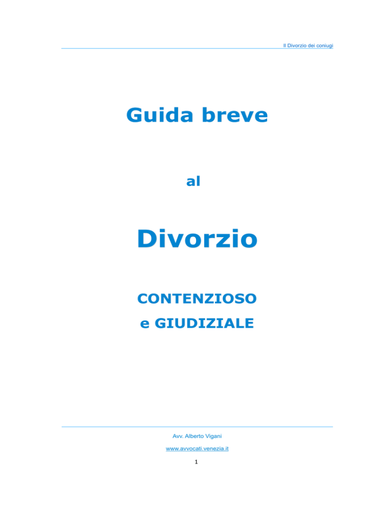 Il Divorzio dei coniugi Guida breve al Divorzio CONTENZIOSO e GIUDIZIALE Avv. Alberto Vigani www.avvocati.venezia.it 1 Il Divorzio dei coniugi La difesa è un diritto di tutti, anche quando finisce il matrimonio! Istruzioni per l'uso Caro lettore, dopo la separazione dei coniugi sorge spesso sorge la necessità di pensare al divorzio. Se la vicenda umana è di una semplicità spietata, diversamente si deve dire del lato giuridico dell'evento. Per questo motivo ho pensato di mettere a disposizione una breve guida che permetta di trovare in poche pagine i principi essenziali che disciplinano la materia, fornendo così uno strumento operativo con cui orientarsi. A tale fine, secondo uno standard già collaudato con successo, ho voluto offrire, "in pillole", quello che si deve sapere attraverso le risposte date alle domande più frequenti che i clienti più spesso mi rivolgono. Che cosa non trovi in questo manuale Come molti fra quelli che scrivono, avrei voluto predisporre un manuale che, esaminando ogni singola fattispecie dell'argomento, si possa ricordare come la “summa” sulla materia. Puoi pensare a Avv. Alberto Vigani www.avvocati.venezia.it 2 Il Divorzio dei coniugi titoloni come “Il Manuale aggiornato del divorzio senza problemi” o “Tutto sul Divorzio per i non addetti ai lavori". Ma sarebbe stato un errore. Non Ti sarebbe servito a nulla! Visto l'argomento, avrai già capito che sarebbe stata solo una forzatura perché non si può concentrare la preparazione di un bravo professionista in poche pagine: e, con quell'approccio, avrei anche falsato i Tuoi passi successivi, magari aiutandoti a sbagliare per eccesso di fiducia. Non Ti ripropongo, quindi, un manuale di centinaia di pagine, difficile da leggere anche per avvocati e professori (ce ne sono già tanti sul mercato -come quelli che io mi sono letto- e stanno bene lì, dove possono essere acquistati dai professionisti che dovranno lavorare per Te). Per questa ragione ho scritto solo una agevole, breve guida, comprensibile a tutti e di estesa utilità. Che cosa trovi in questo manuale Questo è un prontuario utile per attivare la tua difesa tecnica e per orientarti velocemente in una materia complessa, ricca di prescrizioni normative, giurisprudenziali e prassi. Non c'è tutto quello di cui avrai bisogno per gestire il Tuo divorzio ma, senz'altro, vi troverai tutto quello che serve per iniziare ad organizzare la Tua difesa assistita da un avvocato, magari abilitato al gratuito patrocinio. Diffida perciò di chi Ti racconterà che in una manciata di pagine si può condensare tutto il sapere necessario per padroneggiare una disciplina che è il punto di incontro di Diritto Civile, Diritto Processuale Civile, Diritto Penale, Diritto processuale penale etc. Usa quindi questo manuale come una roadmap per orientarti e porre in essere fin dall'inizio le scelte giuste evitando gli errori che possono pregiudicare il buon esito della Tua separazione o il Tuo divorzio. Come avrai già intuito, poiché un'assistenza tecnicamente qualificata non può essere sostituita dalla semplice lettura della mia Avv. Alberto Vigani www.avvocati.venezia.it 3 Il Divorzio dei coniugi guida, quest'ultima Ti servirà anche per scegliere l'avvocato giusto per Te e decidere assieme a lui i passi necessari senza sbagliare. Anzi, ricorda sempre che mentre la norma è una i casi particolari sono infiniti: non si possono quindi generalizzare regole di condotta partendo da un unico caso concreto. Ogni singolo aspetto di questo può far conseguire mille effetti diversi a seconda dei fatti che con esso interagiscono e concorrono. Devi poi ricordare che l'assistenza di un legale può essere richiesta anche con il “Patrocinio a spese dello Stato”, in tutti quei casi i cui ricorrono i parametri reddituali e gli altri requisiti di legge. Buona lettura! Avv. Alberto A. Vigani classe 1967, laurea in giurisprudenza a pieni voti presso l'Università Cattolica di Milano. Avvocato e Consulente del Lavoro. Per saperne di più mi trovi su http://www.avvocati.venezia.it ò Avv. Alberto Vigani www.avvocati.venezia.it 4 Il Divorzio dei coniugi Questo manuale è distribuito sotto licenza Creative Commons. Niente usi commerciali, nessuna modifica: per il resto puoi condividerlo, pubblicarlo parzialmente, copiarlo, stamparlo e distribuirlo. Questo manuale è disponibile gratuitamente all'indirizzo: http://www.avvocati.venezia.it ò Avv. Alberto Vigani www.avvocati.venezia.it 5 Il Divorzio dei coniugi IL DIVORZIO 1. COS'E' IL DIVORZIO? Mentre la separazione non pone fine al rapporto coniugale, ma ne attenua solo gli effetti, il divorzio produce lo scioglimento del matrimonio o la cessazione degli effetti civili (se è stato celebrato con rito religioso riconosciuto dallo Stato). La separazione senza sopravvenuta riconciliazione è, di norma, il passaggio necessario per ottenere il divorzio: il termine per poter domandare quest'ultimo è, infatti il decorso di un triennio a far tempo dalla avvenuta comparizione dei coniugi innanzi il Presidente del Tribunale nella procedura di separazione (art. 3. L. 898/1970) Gli effetti del divorzio si producono con la pronuncia della richiesta sentenza. Solo dopo di essa gli ex coniugi possono contrarre nuovo matrimonio. 2. COME SI CHIEDE IL DIVORZIO? La richiesta di divorzio può essere congiunta, da parte di entrambi i coniugi, o disgiunta, e quindi chiesta da uno solo di essi. In quest'ultimo caso, deve esserci sempre il patrocinio di un legale per ciascun coniuge; nel primo, invece, è tuttora controverso se le parti possano stare in giudizio con il ministero del medesimo difensore. Sembra da condividersi la soluzione positiva poiché l'oggettivo conflitto di interessi è superato dall'accordo manifestato dalle parti sia sulla domanda di divorzio sia su quelle accessorie. In quest'ottica, la maggior parte dei Tribunali ritiene sufficiente un solo avvocato. E' necessario, però, rappresentare che ove insorgesse un conflitto tra i coniu