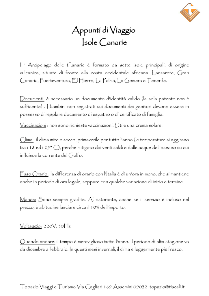 Appunti di Viaggio Isole Canarie L' Arcipelago delle Canarie è formato da sette isole principali, di origine vulcanica, situate di fronte alla costa occidentale africana. Lanzarote, Gran Canaria, Fuerteventura, El Hierro, La Palma, La Gomera e Tenerife. Documenti: è necessario un documento d'identità valido (la sola patente non è sufficente) . I bambini non registrati sui documenti dei genitori devono essere in possesso di regolare documento di espatrio o di certificato di famiglia. Vaccinazioni : non sono richieste vaccinazioni. Utile una crema solare. Clima: il clima mite e secco, primaverile per tutto l'anno (le temperature si aggirano tra i 18 ed i 25° C), perchè mitigato dai venti caldi e dalle acque dell'oceano su cui influisce la corrente del Golfo. Fuso Orario : la differenza di orario con l’Italia è di un’ora in meno, che si mantiene anche in periodo di ora legale, seppure con qualche variazione di inizio e termine. Mance: Sono sempre gradite. Al ristorante, anche se il servizio è incluso nel prezzo, è abitudine lasciare circa il 10% dell'importo. Voltaggio: 220V, 50Hz Quando andare: il tempo è meraviglioso tutto l'anno. Il periodo di alta stagione va da dicembre a febbraio. In questi mesi invernali, il clima è leggermente più fresco. Topazio Viaggi e Turismo Via Cagliari 169 Assemini 09032 [email protected]