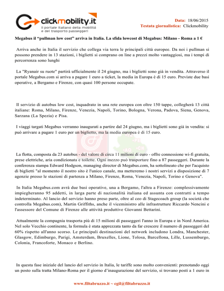 Data: 18/06/2015 Testata giornalistica: Clickmobility Megabus il “pullman low cost” arriva in Italia. La sfida lowcost di Megabus: Milano - Roma a 1 € Arriva anche in Italia il servizio che collega via terra le principali città europee. Da noi i pullman si possono prendere in 13 stazioni, i biglietti si comprano on line a prezzi molto vantaggiosi, ma i tempi di percorrenza sono lunghi La "Ryanair su ruote" partirà ufficialmente il 24 giugno, ma i biglietti sono già in vendita. Attraverso il portale Megabus.com si arriva a pagare 1 euro a ticket, la media in Europa è di 15 euro. Previste due basi operative, a Bergamo e Firenze, con quasi 100 persone occupate. Il servizio di autobus low cost, inquadrato in una rete europea con oltre 150 tappe, collegherà 13 città italiane: Roma, Milano, Firenze, Venezia, Napoli, Torino, Bologna, Verona, Padova, Siena, Genova, Sarzana (La Spezia) e Pisa. I viaggi targati Megabus verranno inaugurati a partire dal 24 giugno, ma i biglietti sono già in vendita: si può arrivare a pagare 1 euro per un biglietto, ma la media europea è di 15 euro. La flotta, composta da 23 autobus - del valore di circa 11 milioni di euro - offre connessione wi-fi gratuita, prese elettriche, aria condizionata e toilette. Ogni mezzo può trasportare fino a 87 passeggeri. Durante la conferenza stampa Edward Hodgson, managing director di Megabus.com, ha sottolineato che per l'acquisto di biglietti "al momento il nostro sito è l'unico canale, ma metteremo i nostri servizi a disposizione di 7 agenzie presso le stazioni di partenza a Milano, Firenze, Roma, Venezia, Napoli, Torino e Genova". In Italia Megabus.com avrà due basi operative, una a Bergamo, l'altra a Firenze: complessivamente impiegheranno 95 addetti, in larga parte di nazionalità italiana ed assunta con contratti a tempo indeterminato. Al lancio del servizio hanno preso parte, oltre al ceo di Stagecoach group (la società che controlla Megabus.com), Martin Griffiths, anche il viceministro alle infrastrutture Riccardo Nencini e l'assessore del Comune di Firenze alle attività produttive Giovanni Bettarini. Attualmente la compagnia trasporta più di 15 milioni di passeggeri l'anno in Europa e in Nord America. Nel solo Vecchio continente, la formula è stata apprezzata tanto da far crescere il numero di passeggeri del 60% rispetto all'anno scorso. Le principali destinazioni del network includono Londra, Manchester, Glasgow, Edimburgo, Parigi, Amsterdam, Bruxelles, Lione, Tolosa, Barcellona, Lille, Lussemburgo, Colonia, Francoforte, Monaco e Berlino. In questa fase iniziale del lancio del servizio in Italia, le tariffe sono molto convenienti: prenotando oggi un posto sulla tratta Milano-Roma per il giorno d’inaugurazione del servizio, si trovano posti a 1 euro in www.filtabruzzo.it ~ [email protected] tutti e otto gli orari proposti, dalle 4 di mattina alle 9 di sera. Niente in confronto allo stesso percorso in treno o in aereo, ma bisogna mettere in conto tempi di percorrenza molto lunghi: fra le 9 ore e le 10 h 40 per andare da Milano a Roma, 15 ore per andare da Torino a Napoli e 11 h 15 da Venezia a Napoli. Sull’autobus, però, sono presenti il wi-fi gratuito, la toilette e le prese di corrente. Al momento i biglietti si possono comprare solo on line previa registrazione al sito, ma in futuro sarà disponibile un servizio di biglietteria in stazione. Le tratte di Megabus in Italia: Torino-Milano-Bologna-Firenze-Roma-Napoli (e viceversa) Venezia-Padova-Firenze-Roma-Napoli (e viceversa) Torino-Milano-Verona-Padova-Venezia (e viceversa) Torino-Genova- Sarzana (La Spezia)-Siena-Roma (e viceversa) Milano-Genova-Pisa-Roma (e viceversa) Milano-Bologna-Firenze-Roma-Napoli (e viceversa) Le stazioni servite da Megabus in Italia: Torino: Corso Vittorio Emanuele 131, vicino alla stazione FS Porta Susa Milano: Autostazione Lampugnano Bologna: Autostazione Piazza XX Settembre Verona: viale Girolamo Cardinale, Autostazione, Stallo 36, vicino alla stazione FS di Verona Porta Nuova Padova: Autostazione Viale della Pace Venezia: isola del Tronchetto, vicino alla stazione del People Mover Genova: Piazza della Vittoria, non lontano dalla stazione FS Genova Brignole Sarzana (La Spezia): via Variante Cisa Siena: fuori dalla Stazione FS di Piazzale Rosselli Pisa: parcheggio di via Pietrasantina Firenze: Piazzale Montelungo, nei pressi della stazione FS Santa Maria Novella Roma: Autostazione Tiburtina Napoli: Metropark di via Lucci, vicino alla stazione FS Napoli Centrale Bagagli ammessi: i bagagli non vengono registrati né vengono rilasciate ricevute di quanto caricato in stiva. Ogni passeggero ha diritto a portare con sé 25 kg di bagaglio, una, due o tre borse che nel complesso non superino le dimensioni di una valigia grande (al massimo 200 cm sommando altezza, larghezza e profondità). A bordo si può portare “un piccolo bagaglio a mano delle dimensioni adatte per tenerlo in grembo o posizionarlo sotto il sedile di fronte.” www.filtabruzzo.it ~ [email protected]