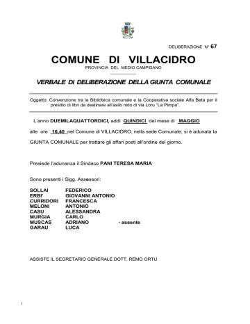 DELIBERAZIONE N° 67 COMUNE DI VILLACIDRO PROVINCIA DEL MEDIO CAMPIDANO ___________ VERBALE DI DELIBERAZIONE DELLA GIUNTA COMUNALE Oggetto: Convenzione tra la Biblioteca comunale e la Cooperativa sociale Alfa Beta per il prestito di libri da destinare all’asilo nido di via Loru “La Pimpa”. L’anno DUEMILAQUATTORDICI, addì QUINDICI del mese di MAGGIO alle ore 16,40 nel Comune di VILLACIDRO, nella sede Comunale, si è adunata la GIUNTA COMUNALE per trattare gli affari posti all’ordine del giorno. Presiede l’adunanza il Sindaco PANI TERESA MARIA Sono presenti i Sigg. Assessori: SOLLAI ERBI’ CURRIDORI MELONI CASU MURGIA MUSCAS GARAU FEDERICO GIOVANNI ANTONIO FRANCESCA ANTONIO ALESSANDRA CARLO ADRIANO - assente LUCA ASSISTE IL SEGRETARIO GENERALE DOTT. REMO ORTU 1 LA GIUNTA COMUNALE Vista la nota della “Cooperativa Sociale Alfa Beta Onlus” prot. n. 138 del 01/04/2014, registrata al protocollo del Comune in data 01/04/2014 al n°7652, con la quale si fa richiesta di poter usufruire presso la Biblioteca Comunale del prestito di 25 testi per bambini da 0/3 anni e di 15 testi per i genitori su tematiche legate alla crescita e all’educazione dei figli da destinare all’asilo nido “La Pimpa” di Via Loru per il periodo di tempo che va da maggio fino a luglio; Atteso che questa Amministrazione intende favorire ogni forma di collaborazione tra l’asilo nido e la biblioteca comunale volta a introdurre i bambini al mondo del libro e favorire la lettura nei genitori su tematiche relative alla crescita e all’educazione dei figli; Visto il vigente Regolamento della Biblioteca e della mediateca comunale, approvato con deliberazione del Consiglio Comunale n. 45 del 10/09/2012, che all’art. 3 stabilisce che scopo della biblioteca è quello di stimolare e organizzare l’attività di educazione permanente e di diffondere l’informazione e promuovere lo sviluppo culturale dei cittadini; Rilevato che il suddetto regolamento disciplina, all’art. 12, il prestito limitandolo a non più di tre volumi per volta e per la durata di trenta giorni, ma che l’addetto alla Biblioteca ha la facoltà di derogare a questa regola; Sentita in proposito la commissione comunale Pubblica Istruzione, Cultura e Biblioteca, che ha espresso parere favorevole; Ritenuto di accogliere la richiesta del prestito bibliotecario formulata dalla Cooperativa; Valutato per quanto in premessa di dover procedere all’approvazione dello schema di convenzione che disciplini il prestito librario con la Cooperativa; Visti: - il Decreto Legislativo 18.08.2000, n. 267, recante il Testo unico delle leggi sull’ordinamento degli Enti Locali (T.U.E.L.); - il regolamento della Biblioteca Comunale approvato con delibera del Consiglio Comunale - n°45 del 10/09/2012; - il vigente Statuto Comunale; Acquisiti i pareri in ordine alla regolarità tecnica e contabile, espressi ai sensi dell’art. 49 del D. Lgs. n. 267/2000, come inseriti nella presente deliberazione; Con voti unanimi espressi per alzata di mano; DELIBERA Di accogliere la richiesta inoltrata dalla Cooperativa Alfa Beta Onlus volta ad ottenere dalla Biblioteca Comunale per il periodo da maggio a luglio il prestito bibliotecario di 40 testi di cui 25 testi per bambini da 0/3 anni e 15 testi su tematiche legate alla crescita e all’educazione dei figli da destinare all’asilo nido “La Pimpa”; Di approvare lo schema dell’atto di convenzione, allegato alla presente, disciplinante il prestito bibliotecario in argomento; Dare mandato al servizio Affari Generali - P.I., Cultura, Sport, Spettacolo, Turismo affinché dia esecuzione alla presente deliberazione; Di rendere la presente, con separata ed unanime votazione, immediatamente eseguibile ai sensi dell’art. 134 - 4° comma - del D. Lgs. n°267/2000. 2 PARERI ED ATTESTAZIONI DI CUI AGLI ARTT. 49 E 151 DEL DECRETO LEG.VO 18/08/2000 N. 267 Parere in ordine alla regolarità tecnica: FAVOREVOLE IL RESPONSABILE DEL SERVIZIO AFFARI GENERALI F.TO: Dott.ssa G. PISCI Parere in ordine alla regolarità contabile: ININFLUENTE IL RESPONSABILE DEL SERVIZIO ECONOMICO FINANZIARIO F.to: Dott.ssa G. CURRELI ______________________________________________________________ Il presente verbale previa lettura e conferma viene sottoscritto: IL PRESIDENTE IL SEGRETARIO GENERALE F.to: TERESA MARIA PANI ESECUTIVITA’ DELLA DELIBERAZIONE La presente deliberazione diverrà esecutiva dopo il decimo giorno dalla data di pubblicazione (ai sensi dell’art. 134, comma 3, D.Lgs.vo n° 267/2000) F.to: DOTT. REMO ORTU CERTIFICATO DI PUBBLICAZIONE La presente deliberazione è stata messa in pubblicazione all’Albo Pretorio del Comune il giorno 20/05/2014 dove resterà per 15 giorni consecutivi e La presente deliberazione è stata dichiarata immediatamente eseguibile (ai sensi dell’art. 134, comma 4, D.Lgs.vo n° 267/2000); cioè sino al 04/06/2014 IL SEGRETARIO GENERALE Villacidro, lì 20.05.2014 IL SEGRETARIO GENERALE F.to: DOTT. REMO ORTU 3 F.to: DOTT. REMO ORTU