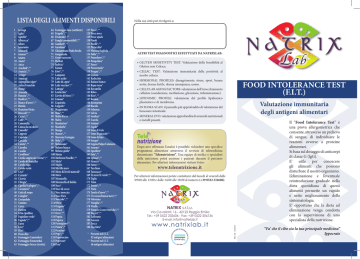 l 2 3 4 5 6 7 8 9 10 11 12 13 14 15 16 17 18 19 20 21 22 23 24 25 26 27 28 29 30 31 32 33 34 35 36 37 38 39 40 41 42 43 44 45 46 47 48 49 50 51 52 53 54 55 56 57 58 59 60 61 62 63 Acciuga Aglio* Agnello* Albicocca* Alloro Amaranto Anacardi Ananas** Anatra Aneto* Anice Arachidi*,** Arancia*,** Aringa* Asparagi Aspergillus niger* Astice/Granchio Avena* Avocado Banana*,** Basilico*,** Bianco d’uovo*,** Bietola Branzino/Orata Broccoli*,** Cacao*,** Caffè*,** Camomilla Canna da zucchero Cannella* Cappero Capriolo Carciofo Carota*,** Carruba Cavallo Cavolfiore* Cavolo cappuccio (verza)*,** Cavolo di Bruxelles Cavolo rapa Cavolo verde Ceci* Cetriolo* Cicoria Ciliegia* Cipolla/Scalogno*,** Cocomero* Coda di rospo Coniglio* Coriandolo Cumino Curry Dattero Erba cipollina Fagiolino verde* Fagiolo*,** Farro Fave* Fico* Finocchio Formaggio Camembert Formaggio Emmenthal Formaggio fresco (ricotta) 64 Formaggio fuso (sottilette) 65 Fragola*,** 66 Frumento*,** 67 Funghi commestibili*,** 68 Gamberi*,** 69 Garofano* 70 Glutammato/Dado brodo 71 Gorgonzola 72 Grano saraceno 73 Halibut 74 Indivia* 75 Kamut 76 Kiwi*,** 77 Lampone 78 Latte acido 79 Latte di capra* 80 Latte vaccino*,** 81 Lattuga* 82 Lenticchie* 83 Lievito di birra*,** 84 Limone* 85 Liquirizia 86 Luppolo* 87 Maggiorana 88 Mais*,** 89 Malto d’orzo 90 Malva 91 Mandarino* 92 Mandorla* 93 Mango 94 Manzo*,** 95 Marrone/Castagna 96 Mela*,** 97 Melanzana* 98 Melone bianco 99 Melone giallo* 100 Menta 101 Merluzzo/Nasello*,** 102 Miele* 103 Miglio 104 Mirtillo nero 105 Misto di lieviti naturali* 106 Mora 107 Mozzarella 108 Mozzarella di bufala 109 Noce* 110 Noce di cocco 111 Noce moscata 112 Noce Parà 113 Nocciole*,** 114 Oliva* 115 Origano* 116 Ortica 117 Orzo*,** 118 Papaia 119 Paprica 120 Parmigiano** 121 Patata*,** 122 Pecorino* 123 Pepe*,** 124 Peperoncino 125 Peperone* 126 Pera* 127 Pesca*,** 128 Pesca noce 129 Pesce spada 130 Pinoli 131 Piselli*,** 132 Pistacchio* 133 Platessa/Sogliola 134 Pollo*,** 135 Pomodoro*,** 136 Pompelmo* 137 Porro* 138 Prezzemolo* 139 Prugna*,** 140 Quinoa 141 Radicchio 142 Rafano bianco 143 Rapa rossa* 144 Ravanello 145 Ribes 146 Riso*,** 147 Rombo 148 Rosmarino 149 Rucola 150 Salmone 151 Salvia 152 Sardina* 153 Scarola 154 Sedano* 155 Segale* 156 Semi di Cola 157 Seme di girasole** 158 Seme di lino 159 Senape* 160 Seppia/Polpo/Calamaro 161 Sesamo* 162 Sgombro* 163 Soia*,** 164 Spinaci*,** 165 Struzzo 166 Suino*,** 167 Tacchino 168 Tarassaco* 169 Tè nero/Tè verde*,** 170 Tiglio 171 Timo 172 Tonno*,** 173 Trota 174 Tuorlo d’uovo*,** 175 Uva rossa/bianca/nera*,** 176 Valeriana 177 Vaniglia*,** 178 Vitello 179 Vongole/Cozze/Ostriche*,** 180 Yogurt*,** 181 Zafferano 182 Zenzero 183 Zucca 184 Zucchine* * Presenti nel F.I.T. 92 antigeni alimentari ** Presenti nel F.I.T. 46 antigeni alimentari Nella sua città può rivolgersi a: ALTRI TEST DIAGNOSTICI EFFETTUATI DA NATRIXLAB: •GLUTEN SENSITIVITY TEST: Valutazione della Sensibilità al Glutine non Celiaca. •CELIAC TEST: Valutazione immunitaria della positività al morbo celiaco. •HORMONAL PROFILES: dimagrimento, stress, sport, buona notte, donna fertile, donna menopausa, uomo. FOOD INTOLERANCE TEST (F.I.T.) •CELLULAR AGING FACTORS: valutazione dell’invecchiamento cellulare (ossidazione, metilazione, glicazione, infiammazione). •LIPIDOMIC PROFILE: valutazione del profilo lipidomico plasmatico e di membrana. Valutazione immunitaria degli antigeni alimentari • IN FLORA SCAN: il pannello più approfondito di valutazione del benessere intestinale. • MINERAL EVO: valutazione approfondita di minerali n utrizionali e metalli pesanti. Il “Food Intolerance Test” è una prova allergometrica che consente, attraverso un prelievo di sangue, di individuare le reazioni avverse a proteine alimentari. Si basa sul dosaggio di anticorpi di classe G (lgG). E’ utile per conoscere gli alimenti che possono disturbare il nostro organismo. L’eliminazione e l’eventuale reintroduzione graduale nella dieta quotidiana di questi alimenti permette un rapido e netto miglioramento della sintomatologia. E’ opportuno che la dieta ad eliminazione venga condotta con la supervisione di uno specialista della nutrizione. Dopo aver effettuato l’analisi è possibile richiedere uno specifico programma alimentare attraverso il servizio di telemedicina denominato “Telenutrizione”. Una equipe di medici e s pecialisti della nutrizione potrà assistere i pazienti durante il percorso alimentare. Per ulteriori informazioni visitare il sito: www.telenutrizione.it Per ulteriori informazioni potete contattarci dal lunedì al venerdì dalle 09:00 alle 13:00 e dalle 14:00 alle 18:00 al numero (+39 0522 232606). NATRIX s.r.l.u. Via Cavallotti, 16 - 42122 Reggio Emilia Tel.: +39 0522 232606 - Fax: +39 0522 506136 E-mail: [email protected] www.natrixlab.it REV. 06 - 04/02/15 LISTA DEGLI ALIMENTI DISPONIBILI “Fa’ che il cibo sia la tua principale medicina” Ippocrate U n regime alimentare corretto e personalizzato, se protratto nel tempo, predispone al mantenimento o al recupero dello stato di salute. Gli unici modi per capire se un alimento è compatibile con il nostro organismo sono l’odore ed il sapore, e l’assenza di effetti collaterali spiacevoli. Tuttavia, la scienza medica ha da tempo intuito che anche tra i cibi quotidiani in apparenza “graditi ed innocui” si possono nascondere quelli potenzialmente dannosi. Grazie al F.l.T. è possibile ora trovare conferma a quelle intuizioni. Questo test innovativo e altamente preciso, è in grado di rilevare le reazioni avverse innescate da alcune proteine alimentari, sostenute da anticorpi di classe G (lgG). Oggi si tende a definire, impropriamente, queste reazioni con il termine di intolleranze alimentari, anche se l’intolleranza vera e propria non coinvolge il sistema immunitario, ma solamente il metabolismo (es. intolleranza al lattosio). Le reazioni sostenute dalle IgG sono ben distinte dalle allergie alimentari vere e proprie, s