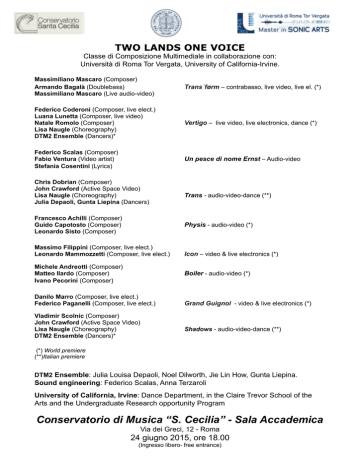 TWO LANDS ONE VOICE Classe di Composizione Multimediale in collaborazione con: Università di Roma Tor Vergata, University of California-Irvine. Massimiliano Mascaro (Composer) Armando Bagalà (Doublebass) Massimiliano Mascaro (Live audio-video) Transˈførm – contrabasso, live video, live el. (*) Federico Coderoni (Composer, live elect.) Luana Lunetta (Composer, live video) Natale Romolo (Composer) Lisa Naugle (Choreography) DTM2 Ensemble (Dancers)* Vertigo – live video, live electronics, dance (*) Federico Scalas (Composer) Fabio Ventura (Video artist) Stefania Cosentini (Lyrics) Un pesce di nome Ernst – Audio-video Chris Dobrian (Composer) John Crawford (Active Space Video) Lisa Naugle (Choreography) Julia Depaoli, Gunta Liepina (Dancers) Francesco Achilli (Composer) Guido Capotosto (Composer) Leonardo Sisto (Composer) Physis - audio-video (*) Massimo Filippini (Composer, live elect.) Leonardo Mammozzetti (Composer, live elect.) Michele Andreotti (Composer) Matteo Ilardo (Composer) Ivano Pecorini (Composer) Danilo Marro (Composer, live elect.) Federico Paganelli (Composer, live elect.) Vladimir Scolnic (Composer) John Crawford (Active Space Video) Lisa Naugle (Choreography) DTM2 Ensemble (Dancers)* Trans - audio-video-dance (**) Icon – video & live electronics (*) Boiler - audio-video (*) Grand Guignol - video & live electronics (*) Shadows - audio-video-dance (**) (*) World premiere (**)Italian premiere DTM2 Ensemble: Julia Louisa Depaoli, Noel Dilworth, Jie Lin How, Gunta Liepina. Sound engineering: Federico Scalas, Anna Terzaroli University of California, Irvine: Dance Department, in the Claire Trevor School of the Arts and the Undergraduate Research opportunity Program Conservatorio di Musica “S. Cecilia” - Sala Accademica Via dei Greci, 12 - Roma 24 giugno 2015, ore 18.00 (Ingresso libero- free entrance)