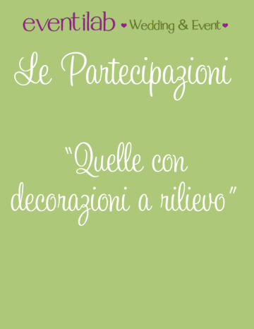 Le Partecipazioni “Quelle con decorazioni a rilievo” Modello Elegance Formati: Rettangolare 11x14 ; 14x11 Carta: può essere realizzato su: carta perlata – carta pergamena – carta canvas Busta: alla partecipazione può essere abbinata una busta in carta perlata – carta pergamena – carta canvas – carta colorata abbinata al fiocco Fiocco: può essere coordinato al colore del vostro evento Interno: testo con elemento grafico personalizzato o solo testo Modello Elegance Modello Sweet Love Formati: Rettangolare 11x14 ; 14x11 / Quadrato 14x14 Carta: può essere realizzato su: carta perlata – carta pergamena – carta canvas Busta: alla partecipazione può essere abbinata una busta in carta perlata – carta pergamena – carta canvas – carta colorata abbinata al fiocco Fiocco: può essere coordinato al colore del vostro evento Applicazioni: alla partecipazione può essere applicato un cuoricino a chiusura coordinato alla carta o in carta colorata Interno: testo con elemento grafico personalizzato o solo testo Modello Sweet Love Modello con Greca Formati: Rettangolare 11x14 Carta: può essere realizzato su: carta perlata – carta pergamena – carta canvas Busta: alla partecipazione può essere abbinata una busta in carta perlata – carta pergamena – carta canvas – carta colorata abbinata al fiocco Fiocco: può essere coordinato al colore del vostro evento Interno: testo con elemento grafico personalizzato o solo testo Modello Dots Love Formati: Rettangolare 11x14 ; 14x11 / Quadrato 14x14 Carta: può essere realizzato su: carta perlata – carta pergamena – carta canvas Busta: alla partecipazione può essere abbinata una busta in carta perlata – carta pergamena – carta canvas – carta colorata abbinata al fiocco Fiocco: può essere coordinato al colore del vostro evento Interno: testo con elemento grafico personalizzato o solo testo Modello Dots Love Modello Flower Formati: Rettangolare 11x14 ; 14x11 / Quadrato 14x14 Carta: può essere realizzato su: carta perlata – carta pergamena – carta canvas Busta: alla partecipazione può essere abbinata una busta in carta perlata – carta pergamena – carta canvas – carta colorata abbinata al fiocco Fiocco: può essere coordinato al colore del vostro evento Interno: testo con elemento grafico personalizzato o solo testo Modello Little Love Formati: Rettangolare 11x14 ; 14x11 / Quadrato 14x14 Carta: può essere realizzato su: carta perlata – carta pergamena – carta canvas Busta: alla partecipazione può essere abbinata una busta in carta perlata – carta pergamena – carta canvas – carta colorata abbinata al fiocco Fiocco: può essere coordinato al colore del vostro evento Interno: testo con elemento grafico personalizzato o solo testo Modello Love Flower Formati: Rettangolare 11x14 ; 14x11 / Quadrato 14x14 Carta: può essere realizzato su: carta perlata – carta pergamena – carta canvas Busta: alla partecipazione può essere abbinata una busta in carta perlata – carta pergamena – carta canvas – carta colorata abbinata al fiocco Fiocco: può essere coordinato al colore del vostro evento Interno: testo con elemento grafico personalizzato o solo testo Le Partecipazioni “Quelle particolari” Modelli con bordo decorato Formati: Rettangolare Carta: può essere realizzato su: carta pergamena – carta canvas – carta millerighe Busta: alla partecipazione può essere abbinata una busta in carta pergamena – carta canvas – carta millerighe - carta colorata abbinata al fiocco Fiocco: può essere coordinato al colore del vostro evento Interno: testo con elemento grafico personalizzato o solo testo Modello Fiorito Modello Starfish Modello Asimmetrico Formati: Rettangolare Carta: può essere realizzato su: carta pergamena – carta canvas – carta millerighe Busta: alla partecipazione può essere abbinata una busta in carta pergamena – carta canvas – carta millerighe - carta colorata abbinata al fiocco Fiocco: può essere coordinato al colore del vostro evento Interno: testo con elemento grafico personalizzato o solo testo Modello Inglese Carta: può essere realizzato su: carta pergamena – carta canvas – carta millerighe – cartoncino colorato Busta: alla partecipazione può essere abbinata una busta in carta pergamena – carta canvas – carta millerighe - carta colorata abbinata al fiocco Fiocco: può essere coordinato al colore del vostro evento Interno: testo con elemento grafico personalizzato o solo testo Le Partecipazioni Quelle con grafica personalizzata “I Coo.ordinati” Coni con decorazioni a rilievo, semplici, e con grafica personalizzata Scatoline a triangolo Bustine a triangolo per il lancio del riso o per la confettata Scatoline a piramide Ventagli e Ventagli menu’ Menu’ Libretti Messa Tableau