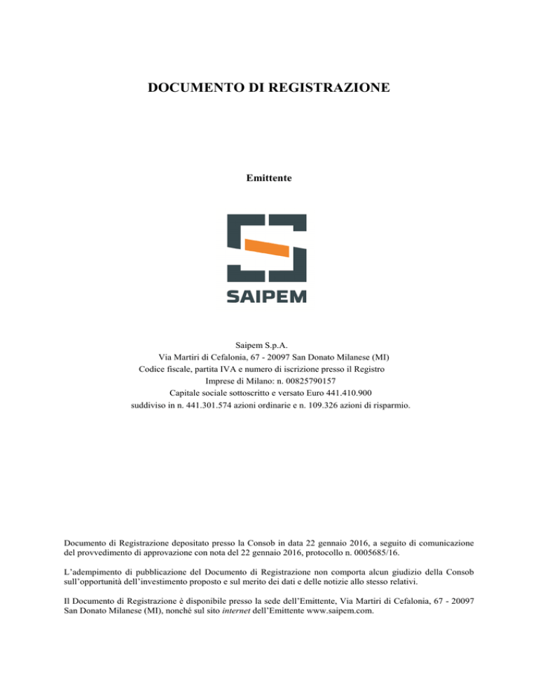 DOCUMENTO DI REGISTRAZIONE Emittente Saipem S.p.A. Via Martiri di Cefalonia, 67 - 20097 San Donato Milanese (MI) Codice fiscale, partita IVA e numero di iscrizione presso il Registro Imprese di Milano: n. 00825790157 Capitale sociale sottoscritto e versato Euro 441.410.900 suddiviso in n. 441.301.574 azioni ordinarie e n. 109.326 azioni di risparmio. Documento di Registrazione depositato presso la Consob in data 22 gennaio 2016, a seguito di comunicazione del provvedimento di approvazione con nota del 22 gennaio 2016, protocollo n. 0005685/16. L’adempimento di pubblicazione del Documento di Registrazione non comporta alcun giudizio della Consob sull’opportunità dell’investimento proposto e sul merito dei dati e delle notizie allo stesso relativi. Il Documento di Registrazione è disponibile presso la sede dell’Emittente, Via Martiri di Cefalonia, 67 - 20097 San Donato Milanese (MI), nonché sul sito internet dell’Emittente www.saipem.com. [PAGINA VOLUTAMENTE LASCIATA IN BIANCO] 2 AVVERTENZA Nel presente paragrafo Avvertenza sono riportate alcune informazioni ritenute importanti per gli investitori in relazione all’Aumento di Capitale di Saipem. Gli investitori, per un più preciso inquadramento dell’Aumento di Capitale, sono invitati a leggere attentamente il presente Paragrafo, la successiva Premessa nonché le informazioni fornite nel Documento di Registrazione e, in particolare, nel Capitolo dei Fattori di Rischio. Per i termini non definiti nella presente Avvertenza e Premessa si rinvia al Paragrafo delle definizioni. Nel triennio 2012-2014 e nei primi nove mesi del 2015 l’andamento gestionale del Gruppo Saipem è stato caratterizzato da un significativo deterioramento dei margini reddituali (a fronte di un andamento variabile dei ricavi, il risultato operativo è passato da un saldo positivo di Euro 1.245 milioni nel 2012 ad un saldo negativo di Euro 640 milioni nei primi nove mesi del 2015, mentre il risultato netto è passato da un saldo positivo di Euro 659 milioni nell’esercizio 2012 ad un saldo negativo di Euro 866 milioni nei primi nove mesi del 2015). L’indebitamento finanziario netto del Gruppo al 30 settembre 2015 è pari a Euro 5.736 milioni. In tale contesto si inserisce la programmata operazione di ridefinizione della struttura patrimoniale e finanziaria del Gruppo Saipem – di cui l’Aumento di Capitale oggetto del Documento di Registrazione è parte integrante - finalizzata a conseguire un rafforzamento patrimoniale dell’Emittente e l’indipendenza strategica e finanziaria del Gruppo Saipem dall’Eni da perseguire attraverso il rimborso del debito verso Eni. Tale operazione prevede (i) l’Aumento di Capitale di Saipem per Euro 3.500 milioni (i proventi della ricapitalizzazione sono destinati a rimborsare una porzione del debito verso Eni per un corrispondente importo) e (ii) il rifinanziamento dell’indebitamento finanziario lordo del Gruppo Saipem a valle dell’Aumento di Capitale, consistente nel rimborso di una quota di debito verso Eni pari a circa Euro 3.200 milioni da effettuare attraverso le risorse derivanti dal Finanziamento che un pool di Banche si è impegnato ad erogare subordinatamente, tra l’altro, alla liberazione integrale dell’Aumento di Capitale. Si fa presente che alla Data del Documento di Registrazione la stima del fabbisogno finanziario netto per i 12 mesi successivi alla Data del Documento di Registrazione è pari a circa Euro 980 milioni. L’Emittente prevede che a valle dell’Aumento di Capitale e del Finanziamento tale fabbisogno finanziario corrente venga meno per effetto del miglioramento del profilo di rischio della struttura del debito in relazione all’allungamento delle scadenze sul medio-lungo termine. Ai suddetti fini alla Data del Documento di Registrazione: (i) Eni e FSI hanno assunto impegni di sottoscrizione in relazione all’Aumento di Capitale, per una partecipazione complessiva pari al 42,9% del capitale sociale ordinario di Saipem e al 43,1% del totale delle azioni ordinarie con diritto di opzione; (ii) i Garanti hanno assunto gli impegni di garanzia in relazione all’Aumento di Capitale, per una partecipazione complessiva pari al massimo al 57,1% del capitale sociale ordinario di Saipem, in ragione dell’entità dell’inoptato; (iii) il pool di Banche si è impegnato ad erogare il Finanziamento per Euro 4.700 milioni in favore di Saipem (il Finanziamento in parola è destinato, oltre che a rimborsare una quota di debito verso Eni per Euro 3.200 milioni, anche a mettere a disposizione del Gruppo risorse finanziarie per Euro 1.500 milioni a copertura delle eventuali oscillazioni del livello di capitale d’esercizio netto). Va segnalato che i suddetti impegni sono soggetti a numerose condizioni risolutive e che il positivo esito dell’Aumento di Capitale e del rifinanziamento dell’indebitamento finanziario lordo del Gruppo è strettamente connesso alla validità ed efficacia dei suddetti impegni e accordi contrattuali che, pur essendo giuridicamente autonomi, sono tra loro reciprocamente collegati e condizionati. Si fa rinvio alla Premessa, nonché al Capitolo VII, Paragrafo 7.1, al Capitolo XVIII, Paragrafo 18.1, e al Capitolo XXII del Documento di Registrazione per la descrizione delle condizioni risolutive sottostanti ai suddetti impegni. Si evidenzia che l’eventuale mancato buon esito della complessiva operazione di ridefinizione della struttura patrimoniale e finanziaria del Gruppo Saipem comporterebbe l’indisponibilità totale delle risorse finanziarie attese sia dall’Aumento di Capitale sia dall’erogazione del Finanziamento necessarie per effettuare il rimborso del debito del Gruppo Saipem verso Eni per un importo pari a Euro 6,7 miliardi e perseguire l’obiettivo di indipendenza strategica e finanziaria da Eni. In tale contesto il Gruppo Saipem, – pur disponendo ai fini della copertura del fabbisogno finanziario netto corrente di linee di credito non utilizzate (per 