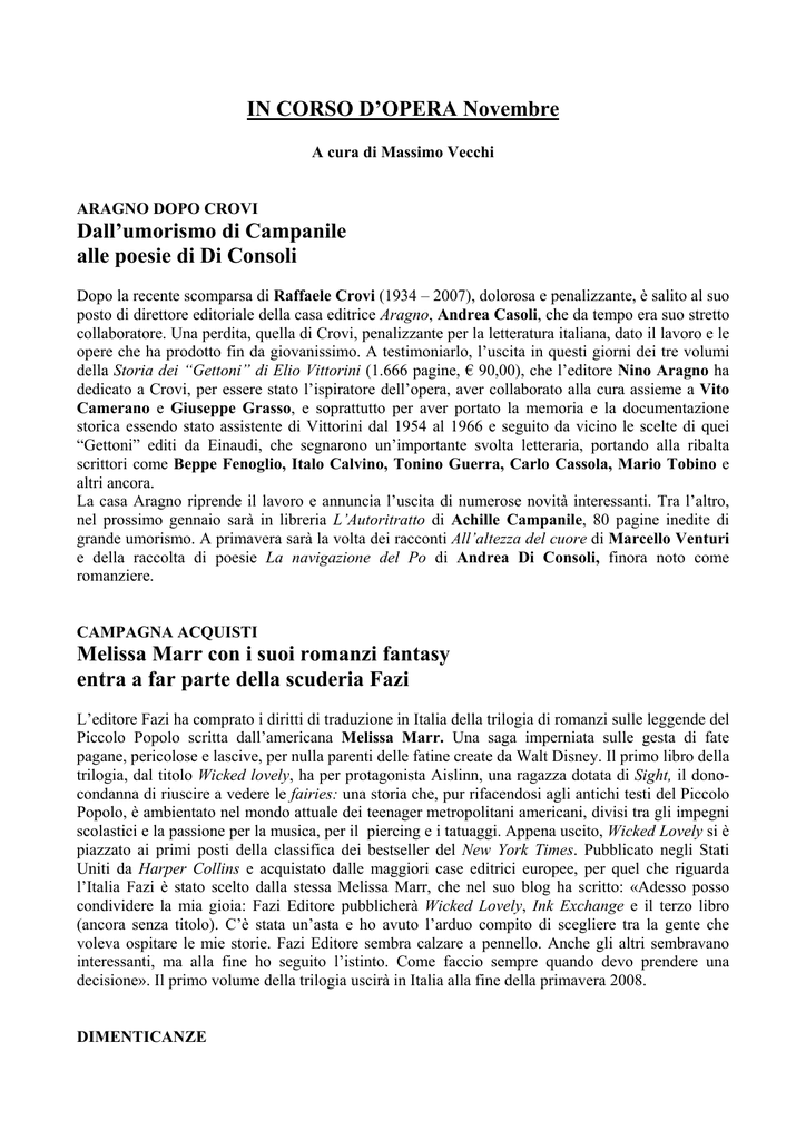 IN CORSO D’OPERA Novembre A cura di Massimo Vecchi ARAGNO DOPO CROVI Dall’umorismo di Campanile alle poesie di Di Consoli Dopo la recente scomparsa di Raffaele Crovi (1934 – 2007), dolorosa e penalizzante, è salito al suo posto di direttore editoriale della casa editrice Aragno, Andrea Casoli, che da tempo era suo stretto collaboratore. Una perdita, quella di Crovi, penalizzante per la letteratura italiana, dato il lavoro e le opere che ha prodotto fin da giovanissimo. A testimoniarlo, l’uscita in questi giorni dei tre volumi della Storia dei “Gettoni” di Elio Vittorini (1.666 pagine, € 90,00), che l’editore Nino Aragno ha dedicato a Crovi, per essere stato l’ispiratore dell’opera, aver collaborato alla cura assieme a Vito Camerano e Giuseppe Grasso, e soprattutto per aver portato la memoria e la documentazione storica essendo stato assistente di Vittorini dal 1954 al 1966 e seguito da vicino le scelte di quei “Gettoni” editi da Einaudi, che segnarono un’importante svolta letteraria, portando alla ribalta scrittori come Beppe Fenoglio, Italo Calvino, Tonino Guerra, Carlo Cassola, Mario Tobino e altri ancora. La casa Aragno riprende il lavoro e annuncia l’uscita di numerose novità interessanti. Tra l’altro, nel prossimo gennaio sarà in libreria L’Autoritratto di Achille Campanile, 80 pagine inedite di grande umorismo. A primavera sarà la volta dei racconti All’altezza del cuore di Marcello Venturi e della raccolta di poesie La navigazione del Po di Andrea Di Consoli, finora noto come romanziere. CAMPAGNA ACQUISTI Melissa Marr con i suoi romanzi fantasy entra a far parte della scuderia Fazi L’editore Fazi ha comprato i diritti di traduzione in Italia della trilogia di romanzi sulle leggende del Piccolo Popolo scritta dall’americana Melissa Marr. Una saga imperniata sulle gesta di fate pagane, pericolose e lascive, per nulla parenti delle fatine create da Walt Disney. Il primo libro della trilogia, dal titolo Wicked lovely, ha per protagonista Aislinn, una ragazza dotata di Sight, il donocondanna di riuscire a vedere le fairies: una storia che, pur rifacendosi agli antichi testi del Piccolo Popolo, è ambientato nel mondo attuale dei teenager metropolitani americani, divisi tra gli impegni scolastici e la passione per la musica, per il piercing e i tatuaggi. Appena uscito, Wicked Lovely si è piazzato ai primi posti della classifica dei bestseller del New York Times. Pubblicato negli Stati Uniti da Harper Collins e acquistato dalle maggiori case editrici europee, per quel che riguarda l’Italia Fazi è stato scelto dalla stessa Melissa Marr, che nel suo blog ha scritto: «Adesso posso condividere la mia gioia: Fazi Editore pubblicherà Wicked Lovely, Ink Exchange e il terzo libro (ancora senza titolo). C’è stata un’asta e ho avuto l’arduo compito di scegliere tra la gente che voleva ospitare le mie storie. Fazi Editore sembra calzare a pennello. Anche gli altri sembravano interessanti, ma alla fine ho seguito l’istinto. Come faccio sempre quando devo prendere una decisione». Il primo volume della trilogia uscirà in Italia alla fine della primavera 2008. DIMENTICANZE A 70 anni dalla prima uscita in America arriva “Venere in visone” di O’Hara Apparso nel 1935 negli Stati Uniti e premiato da uno straordinario successo di vendite, circostanza peraltro consueta per l’autore John O’Hara (nato nel 1905 a Pottsville, Pennsylvania, e morto nel 1970 a Princeton, New Jersey), Venere in visone (titolo originale Butterfield 8) conobbe un ritorno di popolarità 25 anni dopo con la trasposizione in film realizzata dal regista Daniel Mann con Elizabeth Taylor, Laurence Harvey, Eddie Fisher. E’ la storia di una bellissima prostituta d’alto bordo (la Taylor, premiata con l’Oscar) che crede di aver incontrato il vero amore e spera di cambiar vita. Nel romanzo il finale è molto più tragico poiché la ragazza viene trovata morta sulla spiaggia di Long Island. Ma a fare scandalo fu soprattutto la descrizione della società tanto opulenta quanto miserabile di New York all’epoca del proibizionismo. Dopo i trionfi, però, sono finiti nel dimenticatoio sia il film, un po’ datato, sia l’autore, poco amato dalla società letteraria americana per il suo carattere scontroso, ma forse più ancora perché invidiato per i suoi successi. Tra i suoi romanzi più noti Appuntamento a Samarra, Butterfield 8, Pal Joey (da cui fu tratto un applaudito musical e poi un famoso film diretto da George Sidney nel 1957 e interpretato da Rita Hayworth, Frank Sinatra, Kim Novak) e Un pugno di polvere. A metter fine al lungo silenzio provvede ora minimum fax che ha deciso di pubblicare Venere in visone. DALL’ITALIA E DALL’ESTERO Opere prime, diari e spy stories tra le novità della Neri Pozza La casa editrice Neri Pozza gode di buona considerazione in campo internazionale per la saldezza economica, la produzione di sessanta novità all’anno, l’avvio a diventare gruppo dopo il recente acquisto della Giano, e i successi conseguiti proponendo autori come Chevalier, Gregory David Roberts, Malatesta, Cappellani e Vreeland (a novembre arriverà il suo La vita moderna, sul pittore Renoir). Per gli acquisti di autori stranieri il patron della casa, Russo, si sottrae ai rischi delle aste milionarie e usa il sistema della pre-asta, il cosiddetto “pre-empt”: un titolo viene offerto, o prendere o lasciare, ma a prezzi contenuti. Tra le prossime novità, Quaderni e diari 1950-1973 di Hannah Arendt (1906 – 1975), I morti lo sanno di Laura Lippman, Ermes, romanzo d’esordio di Simonetta Poggiali e due americani: Stefan Merrill Block con Storia dell’oblio e Alan Furst con tre spy stories.