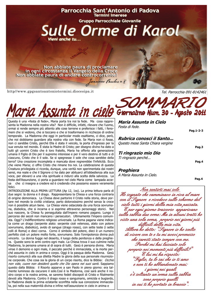 http//www.gpgsantoantoniotermini.diocesipa.it Questa è una «festa di fede», Maria porta tra noi la fede. Ma cosa rappresenta la Madonna nella nostra vita? Non è difficile, infatti, rilevare che l’uomo, ormai si rende sempre più attento alle cose terrene e preferisce i fatti, i fenomeni che si vedono, che si toccano e che si trasformano in ricchezze di ordine temporale. La Madonna che oggi in particolar modo esaltiamo, ci dice, però, che noi dobbiamo guardare alla nostra vita con fede. Se Maria non ci fosse, non ci sarebbe Cristo, perché Ella è stata il veicolo, la porta d’ingresso per la sua venuta nel mondo. È stata la Madre di Cristo; per disegno divino ha dato a tutti gli uomini Cristo che è loro fratello, Maria ha offerto alla generazione umana il Figlio di Dio per il supremo interesse e per il vero destino di tutti e di ciascuno, Cristo che è il sole. Se si spegnesse il sole che cosa sarebbe della terra? Una creazione incompleta e mancata dove regnerebbe l’infelicità. Ecco che viene Maria; ci offre Cristo che rimane tra noi. La celebrazione di questa Creatura privilegiata ci ricorda, dunque, una verità non sperimentata dai nostri sensi, ma reale e che il Signore ci ha dato per abituarci all’obbedienza alla sua voce, per elevarci a una vita spirituale e indurci alla scelta della salvezza. La festa dell’Assunzione, ci porta a guardare nel cielo Maria come lampada accesa che ci insegna a credere ed è credendo che possiamo essere veramente felici. INTRODUZIONE ALLA PRIMA LETTURA (Ap 12, 1ss). La prima lettura parla di due segni: la donna e il drago. Rappresentano la Chiesa e una forza contraria di origine demoniaca. La Chiesa deve partorire il Cristo nella storia, deve portare nel mondo la civiltà cristiana; parto dolorosissimo perché senza la croce non è possibile alcun bene. La Chiesa viene ostacolata da una forza sovrumana, diabolica, che si incarna e si esprime attraverso personaggi storici. Nel suo nascere, la Chiesa fu perseguitata dall’impero romano pagano. Lungo il percorso dei secoli non mancano i persecutori. Ultimamente l’impero comunista. Oggi? L’indifferentismo religioso universale. La Roma pagana viene indicata come un drago (serpente alato: serpente cioè velenoso, alato con potere sovrumano, diabolico), avido di sangue (drago rosso), con sette teste (i sette colli di Roma) e dieci corna. Corno è simbolo del potere, dieci è un numero perfetto cioè un potere molto forte, sovrumano. Solo l’onnipotenza divina può vincerlo. La donna fugge nel deserto, il luogo della penitenza e della preghiera. Queste sono le armi contro ogni male. La Chiesa trova il suo culmine nella Madonna, la persona umana al di sopra di tutti. Gesù è persona divina. Maria vinse il demonio e ogni male, il peccato perché è immacolata, e la morte perché assunta in cielo in anima e corpo. Oggi è la pasqua della Madonna. Gesù risorto comunicò alla sua diletta Madre la gloria della sua personale risurrezione corporale. Che cosa sia la gloria di un corpo risorto, dice la Bibbia: Occhio non vide, cuore non desiderò quello che Dio opera nei suoi santi. Sappiamo questo dalla Bibbia: il Risorto apparve a san Paolo in pieno giorno: era talmente luminoso da oscurare il sole.Così è la Madonna, così sarà anche il nostro corpo e la nostra anima, se saremo fedeli discepoli di Cristo e filialmente devoti alla Madonna. Contro il drago rosso e sanguinario, omicida e bugiardo, la Madonna diede la prima eclatante sconfitta nella sua concezione immacolata, poi nella sua maternità divina e infine nell’assunzione in cielo in anima e Tel. Parrocchia 091-8142461 Maria Assunta in Cielo Festa di fede. Pag.1-2-3 Rubrica conosci il Santo... Questo mese Santa Chiara vergine Pag.3 Ti ringrazio mio Dio Ti ringrazio perché... Pag.4 Preghiera A Maria Assunta in Cielo. Pag.4 Non sentirti mai solo Ho sognato che camminavo in riva al mare con il Signore e rivedevo sullo schermo del cielo tutti i giorni della mia vita passata. E per ogni giorno trascorso apparivano sulla sabbia due orme: Ma in alcuni tratti ho visto una sola orma, proprio nei giorni più difficili della mia vita. Allora ho detto: "Signore io ho scelto di vivere con te e tu mi avevi promesso che saresti stato sempre con me. Perché mi hai lasciato solo proprio nei momenti più difficili?" E lui mi ha risposto: "Figlio, tu lo sai che io ti amo e non ti ho abbandonato mai: i giorni nei quali c'è soltanto un'orma sulla sabbia sono proprio quelli in cui ti ho portato in braccio". corpo. Se Dio si è incarnato in lei, è perché prima la fece immacolata, degna Madre di Dio, vincitrice di ogni male: senza peccato e tutta splendente di bellezza divina nell’anima e nel corpo. Non possiamo essere anche noi come la Madonna? Certo! Anche per noi esiste la comunione con Dio con il corpo e l’anima, se ci accostiamo alla S. Ostia come si deve, con fede; e se viviamo con impegno gli insegnamenti di Gesù. L’istituto di cosmesi mariana esiste fra noi e si chiama eucaristia, corpo e sangue di Dio, carne e sangue di Maria.Questa è una «festa di fede», Maria porta tra noi la fede. Ma cosa rappresenta la Madonna nella nostra vita? Non è difficile, infatti, rilevare che l’uomo, ormai si rende sempre più attento alle cose terrene e preferisce i fatti, i fenomeni che si vedono, che si toccano e che si trasformano in ricchezze di ordine temporale. La Madonna che oggi in particolar modo esaltiamo, ci dice, però, che noi dobbiamo guardare alla nostra vita con fede. Se Maria non ci fosse, non ci sarebbe Cristo, perché Ella è stata il veicolo, la porta d’ingresso per la sua venuta nel mondo. È stata la Madre di Cristo; per disegno divino ha dato a tutti gli uomini Cristo che è loro fratello, Maria ha offerto alla generazione umana il Figlio di Dio per il supremo interesse e per il vero destino di tutti e di ciascuno, Cristo che è il sole. Se si spegnesse il sole che cosa sarebbe della terra? Una creazione incompleta e mancata do