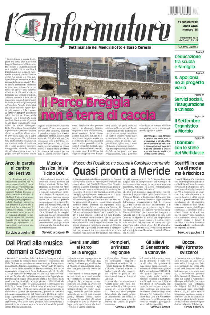 9 771661 731008 35 31 agosto 2012 Anno LXXX Numero 35 Fondato nel 1932 da Ernesto Stucchi Settimanale del Mendrisiotto e Basso Ceresio G.A. 6900 Lugano 3 Pagina 2 L’educazione tra scuola e famiglia • (red.) Andare a caccia di cinghiali nel parco delle Gole della Breggia. Da domani al 20 settembre (escluso il 16, Festa federale) sarà possibile. Lo ha stabilito il Dipartimento del territorio motivando in questi termini l’inedita scelta: “La misura si è resa indispensabile per contenere i danni provocati da questa specie”. Nello stesso comunicato diramato in queste ore, la frase che segue mette un brivido nella schiena: si invitano i visitatori a non allontanarsi dai sentieri principali. “Nessuno contesta il fatto che si impongano misure drastiche come la caccia per ridurre gli esemplari dell’ungulato. Famiglie di cinghiali che stanno causando ingenti danni nella regione – è la reazione di Peter Flückiger, presidente della Fondazione Parco della Breggia – ma è il modo che lascia perplessi. Temiamo che il polmone del Basso Mendrisiotto possa subìre un danno d’immagine. Dalla Chiesa Rossa fino a Morbio Superiore sono 300 metri in linea d’aria. Un ambiente chiuso, stretto. Devi essere sicuro che il colpo vada dove prevedi. Noi confidiamo nella professionalità dei cacciatori ma pensiamo anche al rimbombo che i colpi potranno provocare scoraggiando i visitatori. Va detto che settembre, insieme a maggio e giugno, sono per noi i mesi di alta stagione in cui i visitatori fluiscono più volentieri”. Avremmo gradito trovare altre soluzioni, continua il presidente suggerendo il coinvolgimento semmai delle società venatorie del Mendrisiotto (che conoscono bene il territorio) invece che l’apertura della caccia in maniera generalizzata. Al tempo stesso, si poteva anche ipotizzare la chiusura dei sentieri per un paio di giorni durante l’opera- Arzo, la parola al centro del Festival Musica classica, inizia Ticino DOC • Ha debuttato ieri sera la tredicesima edizione del Festival internazionale di narrazione di Arzo “Racconti di qui e d’altrove”, ideato dall’Associazione Cultura Popolare e dall’Associazione Giullari di Gulliver. Il ricco programma accompagnerà gli spettatori adulti e bambini - attraverso un percorso di parole che li condurrà fino a domenica 2 settembre. Piazza e corti si apriranno ad attori, narratori e musicisti chiamati a raccontare storie. Nel presente liquido che ci circonda - rilevano gli organizzatori - la narrazione rappresenta una sfida necessaria. • Inizia domani sabato 1. settembre la seconda edizione del Festival musicale Ticino DOC, promosso da Musica nel Mendrisiotto per dare la possibilità a musicisti ticinesi fuori cantone o all’estero di ritrovarsi, suonare insieme, mostrare quanto sanno fare. Il festival prevede numerosi concerti in diverse località del Mendrisiotto, fino al 9 settembre, quando ci sarà il concerto di chiusura al Museo d’arte di Mendrisio. La maggior parte dei migliori strumentisti della Svizzera italiana risiede stabilmente all’estero, ricoprendo ruoli di prestigio presso istituzioni che hanno disegnato la storia musicale. Servizio a pagina 15 Pagina 3 S. Apollonia, no al progetto viario Pagina 11 Il Parco Breggia non è terra di caccia Servizio a pagina 16 zione. Perplessità che possono nascere in chiunque. Intanto, malgrado la loro professionalità, alcuni cacciatori locali hanno lasciato intendere che non si cimenteranno in questa caccia per le condizioni poco incoraggianti in cui la stessa può realizzarsi: la foglia di settembre che toglie visibilità e l’ambiente tanto ristretto. Da alcuni anni il problema dei cinghiali affligge la zona di Mor- bio e Vacallo. “In effetti, anche noi abbiamo subìto un sacco di danni; - conferma il nostro interlocutore - faccio alcuni esempi: ripariamo un tratto di sentiero e subito dopo lo troviamo distrutto. Di recente abbiamo rifatto le lunette, i cinghiali hanno infilato sotto il muso e le hanno praticamente arate”. Nel frattempo anche il Municipio di Balerna ha preso atto, con preoccupazione, della questione e ha deciso di scrivere all’Ufficio cantonale di caccia e pesca esprimendo il proprio parere. Nell’immagine, una famiglia di cinghiali che alcuni mesi fa attraversava la strada a Morbio. Le cronache dei mesi estivi hanno riferito di incursioni in piscina comunale a Chiasso e nel giardino del sindaco di Morbio Claudia Canova. Museo dei Fossili: se ne occupa il Consiglio comunale Quasi pronti a Meride • Siamo quasi giunti all’inaugurazione ed è quasi tutto pronto in quel di Meride per l’apertura del nuovo Museo dei Fossili del Monte San Giorgio. Stando a quanto riportato nei messaggi municipali il famoso nastro rosso dovrebbe venir tagliato sabato 13 ottobre, ma mancano ancora alcuni dettagli, e proprio questi verranno votati il prossimo 10 settembre in Consiglio comunale. All’ordine del giorno sono presenti tre trattande riguardanti il museo. I consiglieri comunali saranno infatti chiamati ad esprimersi sulla sottoscrizione della convenzione tra Comune di Meride e Fondazione relativamente alla gestione del nuovo Museo dei Fossili per il periodo 20122016 e del relativo credito di 30 mila franchi, quale ulteriore finanziamento per la gestione corrente della Fondazione. A tale proposito il Municipio della città di Mendrisio ha stanziato lo scorso giugno un contributo annuale di 30 mila franchi per il prossimo quadriennio a sostegno dei costi correnti per la gestione della struttura museale e ciò a partire dall’apertura dello stesso. La città segnalava però che “il nostro Esecutivo auspica che la composizione del Consiglio di fondazione possa essere in un prossimo futuro aggiornata, tenendo in debita considerazione l’equa rappresentaza della città”. Gli altri due messaggi riguarderanno rispettivamente l’approvazione della Convenzione tra il Canton Ticino, la Fondazione del Monte San Giorgio e il Comune inerente l’approva