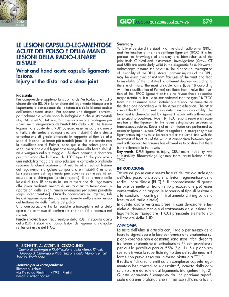 Agosto2012;38(suppl.2):79-96 Le lesioni capsulo-legamentose acute del polso e della mano. Lesioni della radio-ulnare distale Wrist and hand acute capsulo-ligaments lesions. Injury of the distal radio ulnar joint Riassunto Per comprendere appieno la stabilità dell’articolazione radio ulnare distale (RUD) e la funzione del legamento triangolare è importante la conoscenza dell’anatomia e della biomeccanica dell’articolazione stessa. Per ottenere una diagnosi corretta, particolarmente valide sono le indagini cliniche e strumentali (Rx, TAC e RMN). Tuttavia, l’artroscopia rimane l’indagine più sicura nella diagnostica dell’instabilità della RUD. Le lesioni legamentose acute della RUD possono esser associate o meno a fratture del polso e comportano una instabilità della stessa articolazione di grado differente in rapporto al tipo ed alla sede di lesione. Le forme più instabili (tipo 1B in accordo con la classificazione di Palmer) sono quelle che coinvolgono la sede inserzionale del legamento triangolare alla fovea dell’ulna e vengono definite maggiori. Si deve comunque ricordare per precisione che le lesioni del TFCC tipo 1B che producono una instabilità maggiore sono solo quelle complete o profonde secondo la classificazione di Atzei. Le altre sedi di lesione del legamento triangolare comportano un’instabilità minore. La riparazione del legamento può avvenire con modalità artroscopica o chirurgica (a cielo aperto). Il trattamento delle lesioni di tipo 1B consiste in una reinserzione del legamento alla fovea mediante ancore di sutura o suture transossee. Le riparazioni delle lesioni minori avvengono per sutura parietale (capsulo-legamentosa). Quando riconosciute in urgenza, tali lesioni legamentose devono esser riparate nello stesso tempo del trattamento delle fratture del polso. Una comparazione fra la tecniche artroscopiche ed a cielo aperto ha permesso di confermare che non c’è differenza nei risultati. Parole chiave: lesioni legamentose della RUD, instabilità acuta della RUD, instabilità di polso, lesioni del legamento triangolare, lesioni acute del TFCC R. LUCHETTI*, A. ATZEI**, R. COZZOLINO* Centro di Chirurgia e Riabilitazione della Mano, Rimini; Gruppo di Chirurgia e Riabilitazione della Mano “Fenice”, Treviso, Pordenone * ** Indirizzo per la corrispondenza: Riccardo Luchetti via Pietro da Rimini 4, 47924 Rimini E-mail: [email protected] s79 Summary To fully understand the stability of the distal radio ulnar (DRUJ) and the function of the fibrocartilage ligament (TFCC) it is important the knowledge of anatomy and biomechanics of the joint itself. Clinical and instrumental investigations (X-rays, CT and MRI) are particularly valid in the diagnostic field. However, arthroscopy remains the safest in the diagnostic investigation of instability of the DRUJ. Acute ligament injuries of the DRUJ may be associated or not with fractures of the wrist and lead to instability of the joint itself to different degrees according to the site of injury. The most unstable forms (type 1B according with the classification of Palmer) are those that involve the insertion of the TFCC ligament at the ulna fovea: those determine major instability. It must be remembered that the type 1B TFCC tears that determine major instability are only the complete or the deep one according with the Atzei classification. The other sites of the TFCC ligament injury determine minor instability. The treatment is characterized by ligament repair with arthroscopic or surgical procedures. Type 1B TFCC lesions require a reconnection of the ligament to the fovea using suture anchors or transosseous sutures. Repairs of minor injuries are performed by capsular-ligament suture. When recognized in emergency these ligamentous injuries must be repaired at the same time with the treatment of fractures of the wrist. A comparison between open and arthroscopic techniques has allowed us to confirm that there is no difference in the results. Key words: DRUJ ligaments injury, DRUJ acute instability, wrist instability, fibrocartilage ligament tears, acute lesions of the TFCC. INTRODUZIONE Traumi del polso con o senza fratture del radio distale e/o dell’ulna possono associarsi a lesioni legamentose della radio ulnare distale (RUD) 1. Il riconoscimento di questa lesione permette un trattamento precoce, che può esser conservativo o chirurgico in rapporto al tipo di lesione o alle condizioni contingenti (trattamento chirurgico della frattura del radio distale). In questo lavoro verranno prese in considerazione le tecniche di riconoscimento e di trattamento della lesione del legamentoso triangolare (TFCC) principale elemento stabilizzatore della RUD. ANATOMIA La testa dell’ulna si articola con il radio per mezzo della fossetta sigmoidea e la loro conformazione anatomica sul piano coronale non è costante: sono state infatti descritte tre forme anatomiche di articolazione 2 3 con prevalenza per quella parallela pari al 55% (Fig. 1). Sul piano trasversale invece la superficie sigmoidea del radio mostra 4 forme con prevalenza per la forma piatta o a “C” 2. Il radio e l’ulna sono uniti da un complesso capsulo legamentoso ben conosciuto e descritto 4, formato dalla capsula volare e dorsale e dal legamento triangolare (Fig. 2). Questo legamento è composto da una porzione superficiale e da una profonda che si inserisce sull’ulna a livello s80 Fig. 1. Forme anatomiche di articolazione radio-ulnare distale. La forma più frequente è la B con il 55%. R. Luchetti et al. Fig. 3. Anatomia del legamento triangolare. dc-TFCC = componente distale del legamento TFCC; pc-TFCC = componente prossimale del TFCC. Fovea = punto di inserzione del legamento TFCC. R = Radio; U = ulna. Fig. 2. Schema dell’articolazione radio-ulnare distale: A e B rispettivamente legamento radio ulnare distale volare e dorsale. C = capsula articolare. Legamenti ulno-carpici volari: 1 (ulno-piramidale) 2 (ulno-capitato) 3 (ulno-semilunare). LP: l