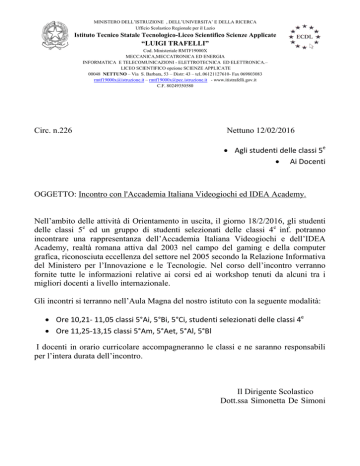 9 MINISTERO DELL’ISTRUZIONE , DELL’UNIVERSITA’ E DELLA RICERCA Ufficio Scolastico Regionale per il Lazio Istituto Tecnico Statale Tecnologico-Liceo Scientifico Scienze Applicate “LUIGI TRAFELLI” Cod. Ministeriale RMTF19000X MECCANICA,MECCATRONICA ED ENERGIA INFORMATICA E TELECOMUNICAZIONI - ELETTROTECNICA ED ELETTRONICA.– LICEO SCIENTIFICO opzione SCIENZE APPLICATE 00048 NETTUNO – Via S. Barbara, 53 – Distr: 43 – tel..06121127610- Fax 069803083 [email protected] – [email protected] - www.itistrafelli.gov.it C.F. 80249350580 Circ. n.226 Nettuno 12/02/2016 Agli studenti delle classi 5e Ai Docenti OGGETTO: Incontro con l'Accademia Italiana Videogiochi ed IDEA Academy. Nell’ambito delle attività di Orientamento in uscita, il giorno 18/2/2016, gli studenti delle classi 5e ed un gruppo di studenti selezionati delle classi 4 e inf. potranno incontrare una rappresentanza dell’Accademia Italiana Videogiochi e dell’IDEA Academy, realtà romana attiva dal 2003 nel campo del gaming e della computer grafica, riconosciuta eccellenza del settore nel 2005 secondo la Relazione Informativa del Ministero per l’Innovazione e le Tecnologie. Nel corso dell’incontro verranno fornite tutte le informazioni relative ai corsi ed ai workshop tenuti da alcuni tra i migliori docenti a livello internazionale. Gli incontri si terranno nell’Aula Magna del nostro istituto con la seguente modalità: Ore 10,21- 11,05 classi 5°Ai, 5°Bi, 5°Ci, studenti selezionati delle classi 4e Ore 11,25-13,15 classi 5°Am, 5°Aet, 5°Al, 5°Bl I docenti in orario curricolare accompagneranno le classi e ne saranno responsabili per l’intera durata dell’incontro. Il Dirigente Scolastico Dott.ssa Simonetta De Simoni