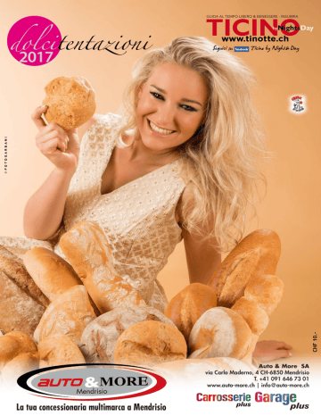 since 1999 byNight&Day www.tinotte.ch CHF 10.- © f otog a r ba n i dolcitentazioni 2017 Guida al tempo libero & benessere - Insubria COPERTINA: PANE Il pane è un prodotto alimentare ottenuto dalla fermentazione, dalla formatura a cui segue una lievitazione, e successiva cottura in forno di un impasto a base di farina (normale o integrale) di cereali, acqua, confezionato con diverse modalità, arricchito e caratterizzato frequentemente da ingredienti regionali. Alimento amato in tutto il mondo, vedi il pane ticinese, alle noci e la tortilla. Il pane utilizzato è stato preparato dalla panetteria “dal Vale”. GENNAIO: TORTA RE MAGI Semplice e veloce da preparare, ingredienti essenziali come per tutte le torte: farina, uova, sale, zucchero e lievito. Cottura 30 minuti (torta preparata dalla panetteria “da Vale”). È sempre un grande evento per grandi e bimbi, nella torta a forma di corona è nascosto un regalino, chi lo trova vince!! FEBBRAIO: TORTELLE DI CARNEVALE È il dolce tipico del carnevale lombardo. Ingredienti tipici: farina, zucchero, vanillina e ottimo se si usa l’olio di arachidi. Non si può non pensare alle maschere, alle strombazzanti Guggle Bands e agli scherzi. Tortelle preparate dalla panetteria “El Prestin dal Corda”. MARZO: TORTA MIMOSA Diffusa particolarmente nel Nord Italia. In Italia si è iniziato a festeggiare il giorno della donna nel 1946. Ingredienti come per tutte le torte: farina, uova e zucchero. Guai ai mariti e ai fidanzati, che dimenticano di regalare il mazzolino di mimose. Torta preparata dalla panetteria “dal Vale”. APRILE: COLOMBA La colomba è il dolce simbolo della Pasqua per eccellenza. Con ingredienti semplici, di digestione facile, molto apprezzata per la sua leggerezza. La colomba, come nei tempi antichi è ancora il corriere più fidato e fedele. Colomba preparata dalla pasticceria Poncini, Maggia. MAGGIO: TORTA NUZIALE Torta nuziale non può mancare ai matrimoni, in tutte le sue forme e gusti. Primo pensiero va sempre alla felice sposa in lungo abito bianco, alla gioia del fatidico “Sì”! Torta preparata dalla panetteria “dal Vale”. GIUGNO: TORTA DI ALBICOCCHE E PRUGNE Sono dolci estivi soffici e golosi, realizzati con un impasto di albicocche e/o prugne fresche. L’albicocca è ricca di vitamine e soprattutto di carotenoidi. La prugna secche o fresche hanno la particolarità di aumentare l’assimilazione del ferro nell’organismo grazie alla grandissima presenza di vitamina C. Torta preparata dalla panetteria Radaelli di Caslano. LUGLIO: CHEESECAKE Il dolce raffigurato nel mese di luglio si chiama Maggeese Cake, è stato creato da Alessandro Zucca della Locanda Turisti di Bignasco in onore della Valle Maggia. È un CheeseCake con formaggio di capra Bio che fanno in Valle, cioccolato fondente, miele, e nocciole tostate nel biscotto. AGOSTO: GELATO Il gelato è amatissimo in tutto il mondo, ottimo pure come dessert. Ricette per tutti i gusti e chi più ne sa più ne inventa. Gelateria Le Chocolat Via Canova 1- Via Cattedrale 12, CH-6900 Lugano SETTEMBRE: TORTA DI CAROTE Dolce apprezzato per la facilità della preparazione, per la sua leggerezza, basse calorie e vegetariani. Carota che ti nascondi sotto terra, ma tutti ti vogliono: per le torte, per bollirti, per sgranocchiarti... e come non pensare al coniglietto! Torta preparata dalla panetteria Münger di Paradiso. OTTOBRE: UVA È il frutto della vite costituito da bacche piccole, rotonde o oblunghe, riunite in grappoli. In base al colore si identificano uve bianche, nere o rosate e uva passa o uvetta. Secondo l’impiego, si hanno uve da tavola, uve da vino o uve da essiccare. Un vero concentrato di sostanze preziose che regalano benessere, rigenerano il corpo e regolarizzano l’intestino! NOVEMBRE: CASTAGNA Amatissima in tutte le forme di cottura, arrostita, bollita, marrons glacé come le tradizionali Vanini. Con la castagna si può preparare un intero menù, dall’antipasto al dolce. È un frutto molto apprezzato nella Svizzera italiana e nel 1800 cibo fondamentale nella dieta della nostra regione. Oggigiorno è famosa e amatissima, la torta di castagne! Torta preparata dalla panetteria “dal Vale”. DICEMBRE: PANETTONE Il panettone è il classico dolce natalizio milanese. La fantasia dei panettieri non ha fine, vasto assortimento per tutti i gusti ed età. Non si può immaginare nessun Natale senza! Il panettone con cui posa la bella Sabrina è de“El Prestin dal Corda”. © f oto g a r b a ni Gennaio Capodanno 1 Do 01 2 Lu 3 Ma 4 Me 5 Gi Epifania 6 Ve 7 Sa 8 Do 02 9 Lu 10 Ma 11 Me 12 Gi Music On Ice 2017 13 Ve >14.01 Centro Sportivo Bellizona 14 Sa >16.01 Beauty Contest Expo, Castione 15 Do 03 16 Lu 17 Ma 18 Me 19 Gi 20 Ve 21 Sa >23.01 Swiss Beauty Expo, Lugano Centro esp. 22.01 XVII ° Memorial Barbero, 22 Do Rist. Cappella 2 Mani , Massagno 04 23 Lu 24 Ma Wir Network, Business Treff, Paolo Attivissimo 25 Me c/o Agriturismo Amorosa, Gudo 26 Gi >29.01 Lugano Camper,Lugano C. Esposizioni 27 Ve >29.01Palco ai giovani, Lugano C. Esposizioni* 30.01 Angelo Pintus, Lugano 28 Sa +Lu Palazzo dei Congressi 29 Do 05 30 Lu 31 Ma *Palco ai giovani, Winter Session 28.01 MiniMISS prima tappa Cow Boy, Contone © f oto g a r b a n i Orari: Lu-ve 06.30-21.00 Sabato 07.00-20.00 Domenica chiuso Via San Gottardo 139, CH-6942 Savosa - Tel. +41 91 966 28 19 - [email protected] Febbraio 1 2 3 4 5 6 7 8 9 10 11 12 13 14 15 16 17 18 19 20 21 22 23 24 25 26 27 28 Me Gi Ve K&K Wiener Strauss, Konzert-Gala Lugano Palazzo dei Congressi Sa Do Carmen Balletto di Milano, Campione d’Italia Salone delle feste Lu 06 Ma Me Gi Rondo Veneziano, Lugano Palazzo dei Congressi Ve >12.02 MAKE YOUR MOVE, Lugano Palazzo dei Congressi Sa Paolo Migone “ Gli uomini vengono da marte”,Teatro Locarno Do Lu Ma Wir Network, Business Treff, Pier Paolo Pedrini 07 c/o Ristorante Carrà, Ascona San Valentino Me Gi Ve >19.02 Flora Lugano Centro Esposizioni >19.02 Swiss Moto, Zurigo >28.02 Fiera del Benes