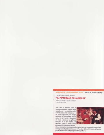 DOMENICA ll NOVEMBRE 2OO7 j ore t7,30,TeatrodeileApi TEATRO VERDE n.o.b.(Roma) '' IL PIFFERAIO DI HAMELIN'' Attori,pupazzie figureanimate a Dartiredai 4 onni Nellacittàdi Hamelin vivereé diventato imposibile. pensa Lagente soloa lavorare eadaccumulare soldi, lestrade sono sporche edinsicure. Unavidoborgomastrq unamoglie esasperata, unesercito ditopisfaticati guidati daunreastuto e dispettosq un magopasticcione, un pifferaio coraggioso e un po' ingenuq un cancelliere fifone masincero. sono i personaggi cheanimeranno lastoria. Attraverso situazioni comiche enarrazioni, attori,burattini, trampolieri emangiafuoco coinvolgeranno il pubblico nellastoria e i "bambini di Hamelin" insieme aibambini presenti diventeranno i veriprotagonisti dello spettacolo.