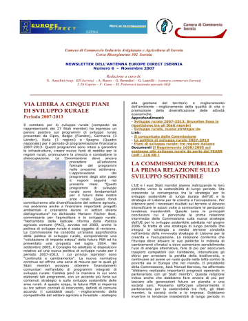 Camera di Commercio Industria Artigianato e Agricoltura di Isernia Corso Risorgimento 302 Isernia NEWSLETTER DELL’ANTENNA EUROPE DIRECT ISERNIA Numero 6 - Novembre 2007 Redazione a cura di: S. Azzolini (resp. ED Isernia) - A. Russo – G. Berardini – G. Laurelli – (camera commercio Isernia) I. Di Caprio – F. Cuna – M. Pettorossi (azienda speciale SEI) ____________________________________________________ VIA LIBERA A CINQUE PIANI DI SVILUPPO RURALE Periodo 2007-2013 Il comitato per lo sviluppo rurale (composto da rappresentanti dei 27 Stati membri) ha espresso un parere positivo sui programmi di sviluppo rurale presentati da Cipro, Belgio (Fiandre), Germania (3 Länder), Italia (3 regioni) e Spagna (Quadro nazionale) per il periodo di programmazione finanziaria 2007-2013. Questi programmi sono intesi a garantire le infrastrutture, creare nuove fonti di reddito per le regioni rurali, promuovere la crescita e combattere la disoccupazione. La Commissione deve ancora procedere all'adozione formale dei programmi nelle prossime settimane. L'approvazione dei programmi degli altri paesi e regioni seguirà nei prossimi mesi. "Questi programmi di sviluppo rurale sono fondamentali per il futuro delle nostre aree rurali. Questi fondi contribuiranno alla diversificazione del settore agricolo, ma andranno anche a finanziare importanti progetti ambientali e creeranno lavoro in settori diversi dall'agricoltura" ha dichiarato Mariann Fischer Boel, commissaria per l'agricoltura e lo sviluppo rurale. "Nell'ambito della radicale riforma della Politica agricola comune (PAC), avviata nel 2003, anche la politica di sviluppo rurale è stata oggetto di revisione. La Commissione ha condotto un'analisi approfondita della politica di sviluppo rurale, comprendente una "valutazione di impatto estesa" della futura PSR ed ha presentato una proposta nel luglio 2004. Nel settembre 2005, il Consiglio ha adottato le disposizioni relative ad una nuova politica di sviluppo rurale per il periodo 2007-2013, i cui principi ispiratori sono "continuità e cambiamento". La nuova normativa continua ad offrire una serie di misure per le quali gli Stati membri possono ottenere finanziamenti comunitari nell'ambito di programmi integrati di sviluppo rurale. Cambia però la maniera in cui sono elaborati tali programmi, con un accento più forte sui contenuti strategici e sullo sviluppo sostenibile delle aree rurali. A questo scopo, la futura PSR si impernia su tre settori centrali di intervento, definiti di comune accordo (i cosiddetti assi): - miglioramento della competitività del settore agricolo e forestale - sostegno alla gestione del territorio e miglioramento dell'ambiente - miglioramento della qualità di vita e promozione della diversificazione delle attività economiche. Approfondimenti: - Sviluppo rurale 2007-2013: Bruxelles fissa la ripartizione tra gli Stati membri - Sviluppo rurale, nuova strategia Ue Link: - Il comunicato della Commissione - La politica di sviluppo rurale 2007-2013 - Piani di sviluppo rurale: tre regioni italiane Documenti Il Regolamento 1698/2005 sul sostegno allo sviluppo rurale da parte del FEASR (pdf - 216 KB ) LA COMMISSIONE PUBBLICA LA PRIMA RELAZIONE SULLO SVILUPPO SOSTENIBILE L'UE e i suoi Stati membri stanno indirizzando le loro politiche verso la sostenibilità di lungo periodo. Sta crescendo la convergenza tra la strategia per lo sviluppo sostenibile di lunga durata dell'UE e la strategia di Lisbona per la crescita e l'occupazione. Per ottenere però i necessari risultati sul terreno si devono intensificare le azioni volte a sormontare le perduranti tendenze insostenibili. Queste sono le principali conclusioni cui è pervenuta la prima relazione intermedia della Commissione sulla nuova strategia dell'UE per lo sviluppo sostenibile adottata nel giugno 2006. Si tratta di una strategia di lungo periodo che integra la strategia a medio termine condotta nell'ambito della rinnovata strategia di Lisbona per la crescita e l'occupazione. La relazione conferma che l'Europa deve attuare le sue politiche in materia di cambiamenti climatici e deve aumentare sensibilmente l'uso di energie alternative, fare di più per assicurare trasporti compatibili con l'ambiente, intensificare gli sforzi per arrestare la perdita della biodiversità, e continuare ad avere un ruolo guida nella lotta contro la povertà sia in Europa che nel mondo. Il presidente della Commissione, José Manuel Barroso, ha affermato "Abbiamo realizzato importanti progressi operando in partenariato con gli Stati membri. Questa relazione indica anche che dobbiamo fare ancora di più per lasciare alle generazioni future un pianeta e una società sani. Possiamo rafforzare ulteriormente il partenariato per la sostenibilità tra l'UE, gli Stati membri, la società civile e le imprese. Dobbiamo invertire le tendenze insostenibili di lungo periodo in ambiti quali i consumi energetici, i trasporti, la biodiversità e la salute e continuare a dare rilievo all'aspetto della sostenibilità nell'ambito della strategia di Lisbona per la crescita e l'occupazione. Continueremo a svolgere un ruolo guida nella lotta contro i cambiamenti climatici e manterremo le promesse che abbiamo fatto al mondo in via di sviluppo." La nuova strategia per lo sviluppo sostenibile è stata adottata dal Consiglio europeo nel giugno 2006. Essa affrontava diverse sfide importanti: i cambiamenti climatici e le energie pulite, i trasporti sostenibili, i consumi e la produzione sostenibili, la conservazione e la gestione delle risorse naturali, la sanità, l'inclusione sociale, la demografia e le migrazioni nonché la povertà globale. La relazione conclude che sia l'UE che gli Stati membri sono riusciti a porre in atto molti degli opportuni quadri strategici. Si registra una crescente convergenza tra il grande obiettivo di lungo periodo attinente allo sviluppo sostenibile – incentrato sulla qualità della vita, l'equità tra generazioni e la tenuta della società europea 