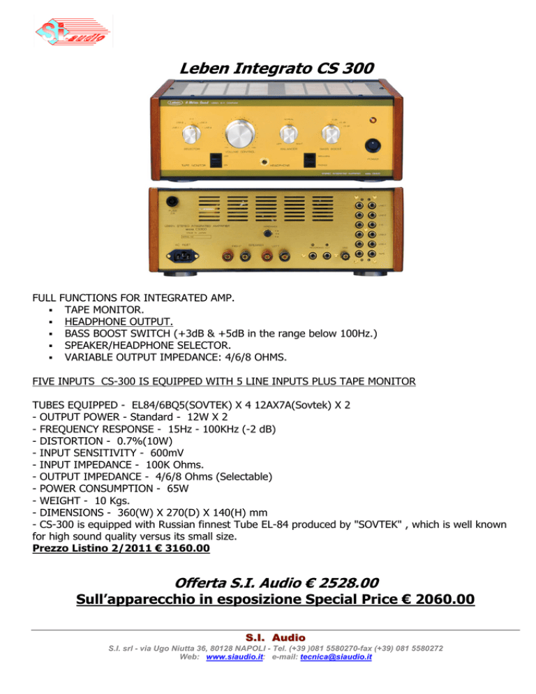 Le eben Integra In ato CS S 300 FULLL FUNCTIO ONS FOR INTEGRAT I TED AMP. TAPE MONITOR. M HEADP PHONE OUT TPUT. BASS BOOST B SW WITCH (+3d dB & +5dB B in the ran nge below 100Hz.) SPEAKE ER/HEADP PHONE SELLECTOR. VARIAB BLE OUTPU UT IMPEDA ANCE: 4/6//8 OHMS. FIV VE INPUTS CS-300 IS S EQUIPPE ED WITH 5 LINE INPU UTS PLUS TAPE MON NITOR TUB BES EQUIP PPED - EL8 84/6BQ5(S SOVTEK) X 4 12AX7A A(Sovtek) X 2 - OU UTPUT POWER - Standard - 12W X 2 - FR REQUENCY Y RESPONS SE - 15Hz - 100KHz (-2 dB) - DIISTORTION N - 0.7%((10W) - IN NPUT SENS SITIVITY - 600mV - IN NPUT IMPE EDANCE - 100K Ohm ms. - OU UTPUT IMP PEDANCE - 4/6/8 Oh hms (Selecctable) - PO OWER CON NSUMPTIO ON - 65W - WEIGHT W - 10 1 Kgs. - DIIMENSION NS - 360(W W) X 270(D D) X 140(H) mm - CS S-300 is eq quipped with Russian n finnest Tu ube EL-84 produced by "SOVTE EK" , which h is well kn nown for high sound d quality versus v its small size. ezzo Listin no 2/2011 € 3160..00 Pre Off fferta S..I. Audiio € 252 528.00 Sulll’apparrecchio o in esposizion ne Spec cial Pric ce € 206 60.00 S.I. Audio S.I. srl - viia Ugo Niutta a 36, 80128 NA APOLI - Tel. (+39 ( )081 558 80270-fax (+39 9) 081 558027 72 Web b: www.siau udio.it: e-ma ail: tecnica@s siaudio.it Leb ben Inttegrato to CS 300 3 XS S SMA ALL AND POWERFUL P L TUBE EL8 84 (MADE BY B "SOVTE EK" / RUSS SIA) CS-300X(S) iss equipped d with SOV VTEK Tube EL-84 whiich has bee en welknow wn by audiophiles fo or its high h sound qu uality again nst its sma all size. A high input sensitivity s o EL84 do of oes not req quire a com mplicated circuit and a accordingly y, it can crreate a low w distortion output sig gnal. HIG GHEST-END D AUDIO GRADE G COM MPONENTS S ■RE ESISTORS:: Precision Industrial Grade +/--1% ■FIRST-STAG GE BY-PASS S CONDENSOR: An ultimate u audio conden nsor "OS C Condensor"" developpe ed by ANYO" "SA ■LA AST-STAGE E BY-PASS CONDENS SOR: "Fine--Gold" by "NICHICON " N" ■JO OINT COND DENSOR: "Metalized " Polypropyllene Conde ensor" with h "Mesh-Sh hielding". ■NF F OVERSHO OOT PREV VENTION CONDENSO C OR: Ceramic Conderse er. ■CA ATHODE RESISTOR: R 4W type.(Instead off 3W type) ■OU UTPUT TRA ANSFORME ER: Newly developpe ed Transformer with wider rang ge for high h frequencyy. ■W WBT type binding postt.(From Ap pril/05 delivvery onwarrd)/li FIV VE INPUTS S CS-300X((S) IS EQUIPPED WIT TH 5 LINE INPUTS PLUS TAPE MONITOR R. OTH HER LUXUR RIOUS PAR RTS ■Tu ube Shield--Base: 24K K gold plate ed. ■SIIDE-WOOD D PANEL: Canadian C W White-Ash". . FULL FUNCTIIONS FOR INTEGRAT TED AMP. 1.TA APE MONITOR. 2.HEADPHONE OUTPUT T. 3.BA ASS BOOS ST SWITCH H 4.SPEAKER/HEADPHONE SELECTO OR. 5.VA ARIABLE OUTPUT O IM MPEDANCE E: 4/6/8 OH HMS. 6.O Operation Lamp L Indica ator. 7.O On-Switch Power P Indicator LED. CS-300X(S) SPECIFICAT TIONS- TUBES EQUIP PPED - EL L84(SOVTE EK) X 4 12A AX7A(Sovte ek) X 2 - OU UTPUT POWER - 15W X 2 - FR REQUENCY Y RESPONS SE - 15Hz - 100KHz (-2 dB) - DIISTORTION N - 0.7%((10W) - IN NPUT SENS SITIVITY - 600mV - IN NPUT IMPE EDANCE - 100K Ohm ms - OUTPU UT IMPEDA ANCE - 4/6 6/8 Ohms (Selectable e) - PO OWER CON NS. - 82W W - WEIGHT T - 10.5 Kg gs. - DIME ENSIONS - 360 (W) X 270 (D) X 140 (H) mm Pre ezzo Listin no 2/2011 € 3590..00 Off fferta S..I. Audiio € 287 870.00 S.I. Audio S.I. srl - viia Ugo Niutta a 36, 80128 NA APOLI - Tel. (+39 ( )081 558 80270-fax (+39 9) 081 558027 72 Web b: www.siau udio.it: e-ma ail: tecnica@s siaudio.it Le eben Integra In ato CS S 600 TWO O SELECTION NS OF OUTPUT TUBES: 6L6GC(5881) 6 ) AND OPTIO ONAL 6CA7(E EL34) TUBES S. By switching s tw wo selectors inside of the cabinet, you u can use eith her of 6L6GC C or 6CA7 (EL34) , and LED indicatorss on the front panel will show s you wh hich tube is applied. a POW WER AMPLIFIIER DIRECT SWITCH & IINPUTS. "PRE EAMP-IN" terrminals on th he rear pane el allow you to t use CS-600 0 as a powerr amplifier. By switching s a se elector on th hr front pane el, by-pass all the function ns only excepting a Volum me control. A WIDE W RANGE OF SPEAKER R APPLICATIO ON - Multi ou utput impeda ance selectorr: 4/6/8/16 o ohms. FLAT T AND WIDE E FREQUENCY Y RESPONSE E - A wide-ra anged and fla at frequency response up pto 100KHz iss enough cap pable for future digital aud dio format su uch as SACD D/HDCD. HER FEATURE ES OTH ■Tw win-triode tub be 6CS7 for the t first-stag ge amplification. ■WB BT type spea aker terminals. ■He eavy-duty outtput transforrmer for 50W W grade amplifiers. ■Larrge capacity choke-coil: 5H350mA 5 ■Du umper tube 6CJ3 6 (for Colo our TV use) is applied to delay a supply of high voltage v (B-Vo oltage) to outtput tubes in n order to protect output tubes from m damages an nd to longer the life. ■All high-end au udio grade ele ectrical comp ponents (con ndensors, ressistors) peration lamp p indicator ■Op ■Succceeding a frront design of o CS-300/CS S-300X. ■24K Gold-Plated Knobs. de Wood-Pan nels. ■Sid FIV VE INPUTS CS-6 600X IS EQU UIPPED WITH H 5 LINE INP PUTS(RCA un nbalanced) PL LUS TAPE MO ONITOR. 1.Po ower Amp Direct Switch. (All functions by-pass on nly excepting g Volume con ntrol) 2.Mu uting Switch.. 3.Stereo/Reverse e Switch. ariable Outpu ut Impedance e: 4/6/8/16 Ohms. O 4.Va 5.Ta ape Monitor Switch. S 6.Ba ass Boost Sw witch. 7.He eadphone Ou utput. 8.Sp peaker/Headp phone Selecttor Switch. 9.Tu ube Indicatorr Lamps. 10.O Operation Lam mp Indicatorr. TUB BES EQUIPPE ED - (4) 6L6G GC (5881) SO OVTEK, (EL3 34/6CA7 - Option) (4) 6C CS7 (1) 6CJ3 3 - OU UTPUT POWE ER - 32W x 2 (6L6GC) att 1KHz. 28W W x 2 (EL34) at a 1KHz. - FR REQUENCY RESPONSE - 10Hz - 100K KHz. (-0.1dB)) - DISTORTIION - 0.7%((10W) - INPUT SENSITIVITY - 900mV at 20W - OUTPUT IM MPEDANCE - 4/6/8/16 Ohms O (Selecta able) EIGHT - 22.5 Kgs. - DIM MENSIONS - 450 (W) X 360 3 (D) X 142 (H) mm - WE Pre ezzo Listin no 2/2011 € 6460..00 Off fferta S..I. Audiio € 517 170.00 Sulll’apparrecchio o in esposizion ne Spec cial Pric ce € 425 50.00 S.I. Audio S.I. srl - viia Ugo Niutt